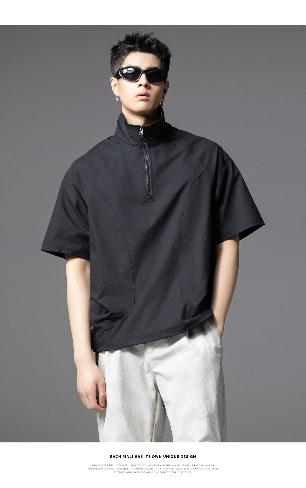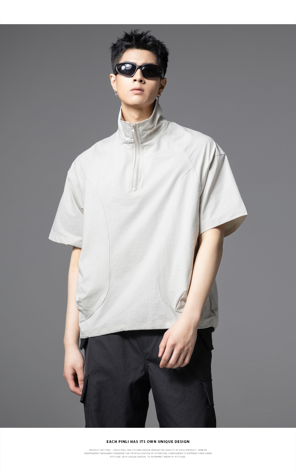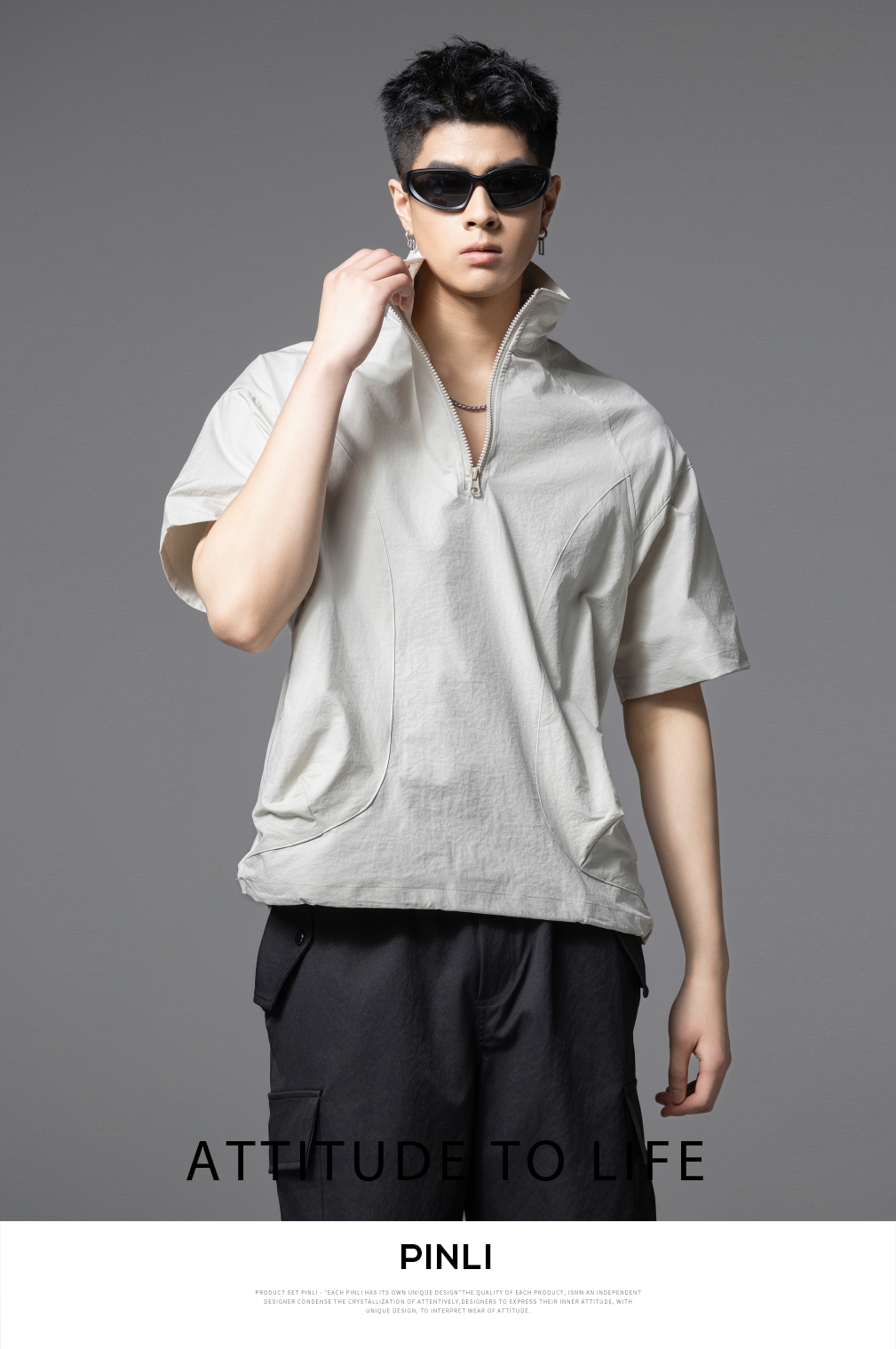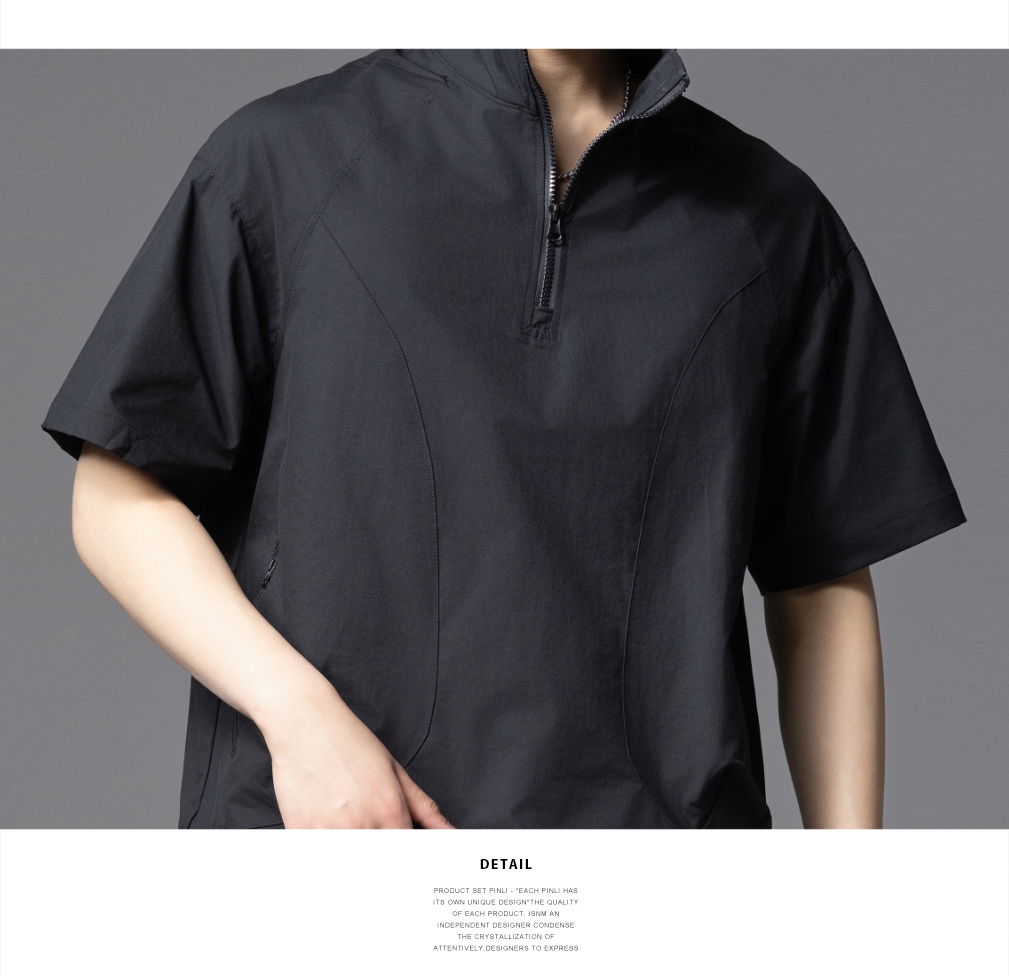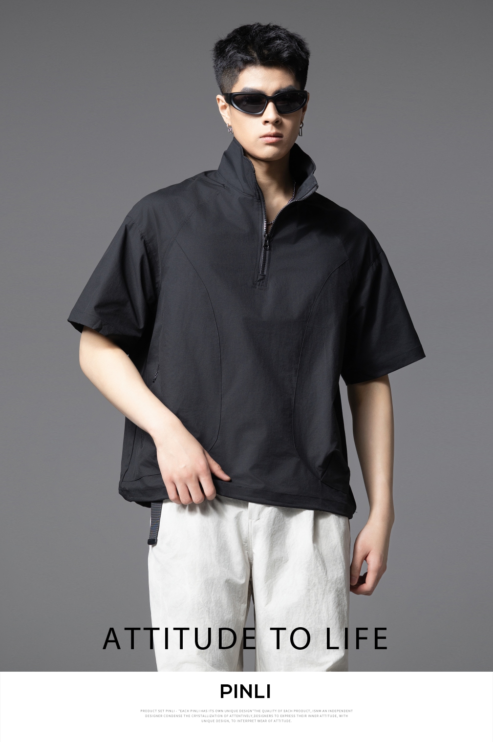 PINLI品立2025夏季新款男士立领半拉链短袖衬衫时尚简约纯色衬衣GD252113294