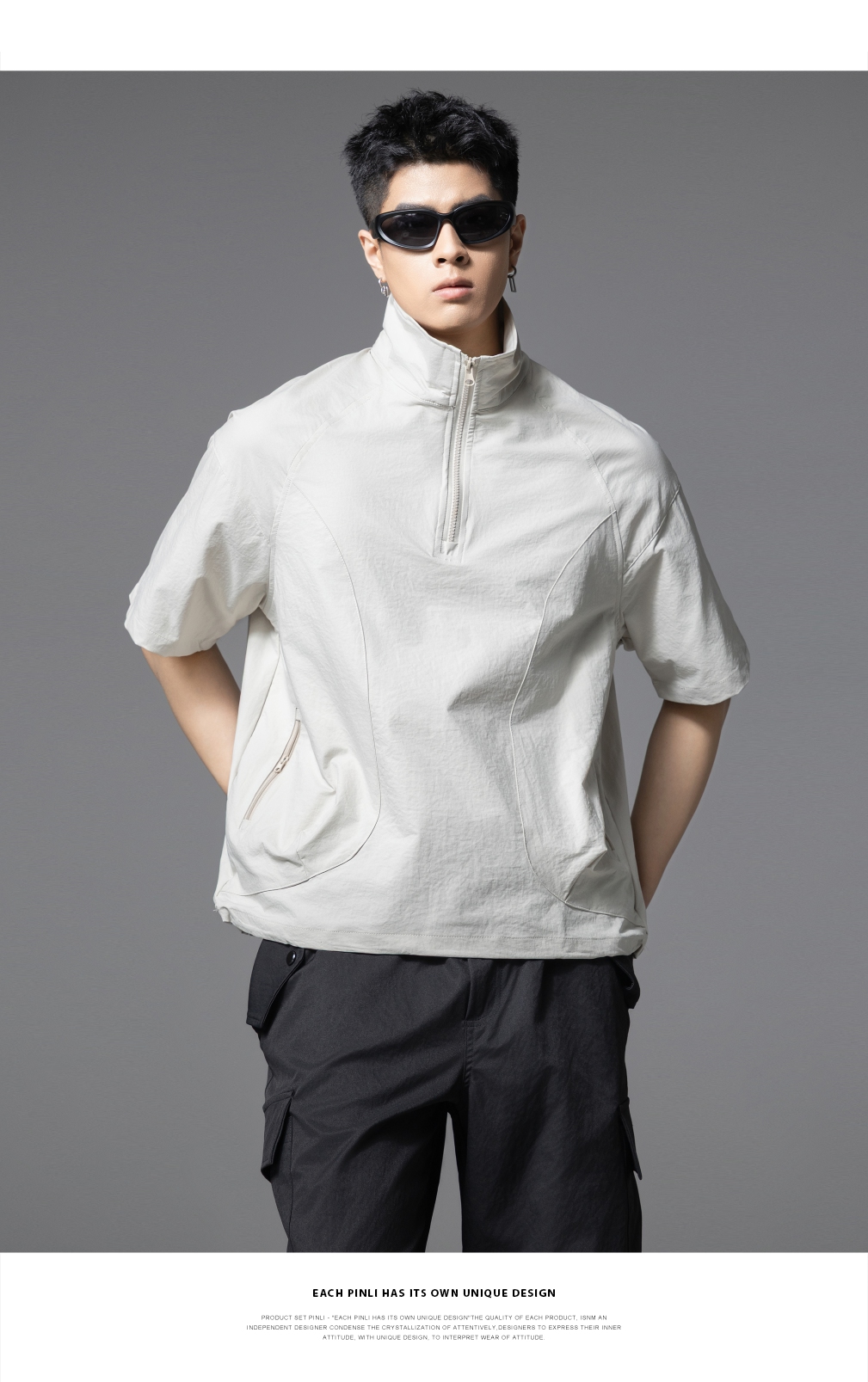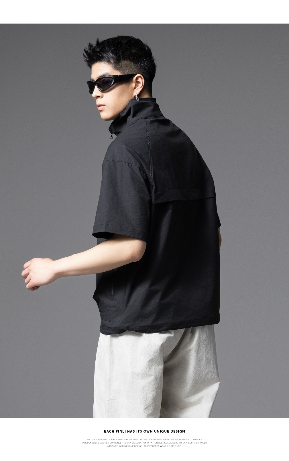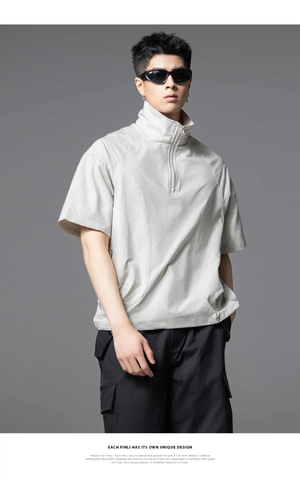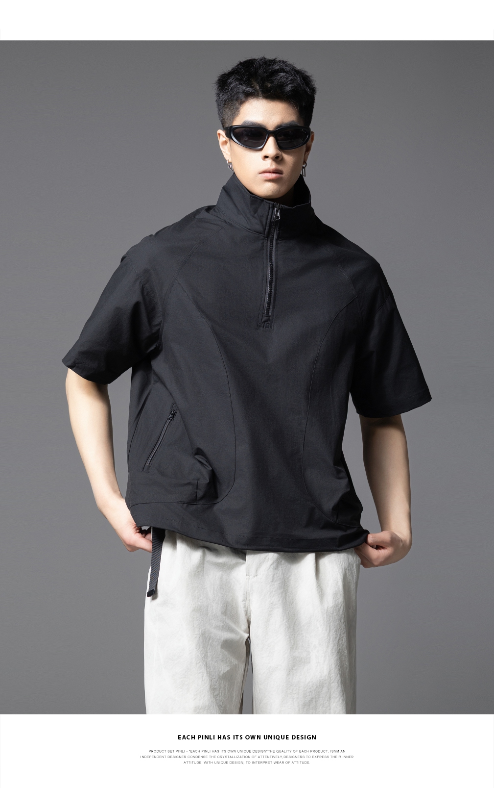 PINLI品立2025夏季新款男士立领半拉链短袖衬衫时尚简约纯色衬衣GD252113294