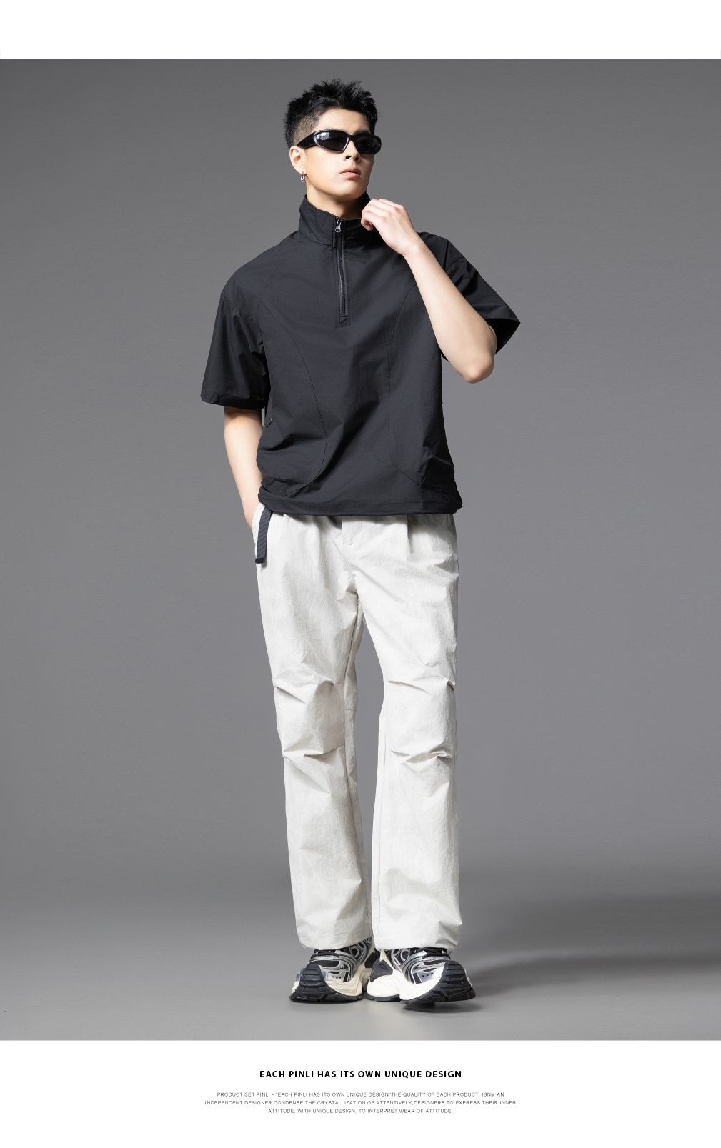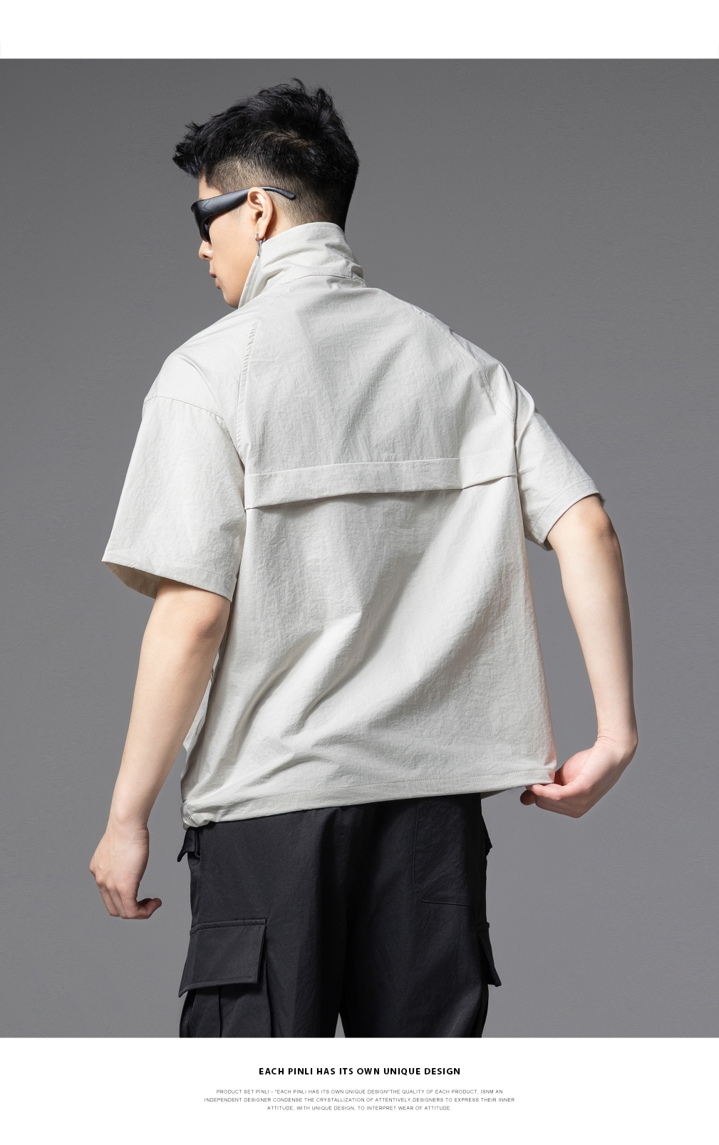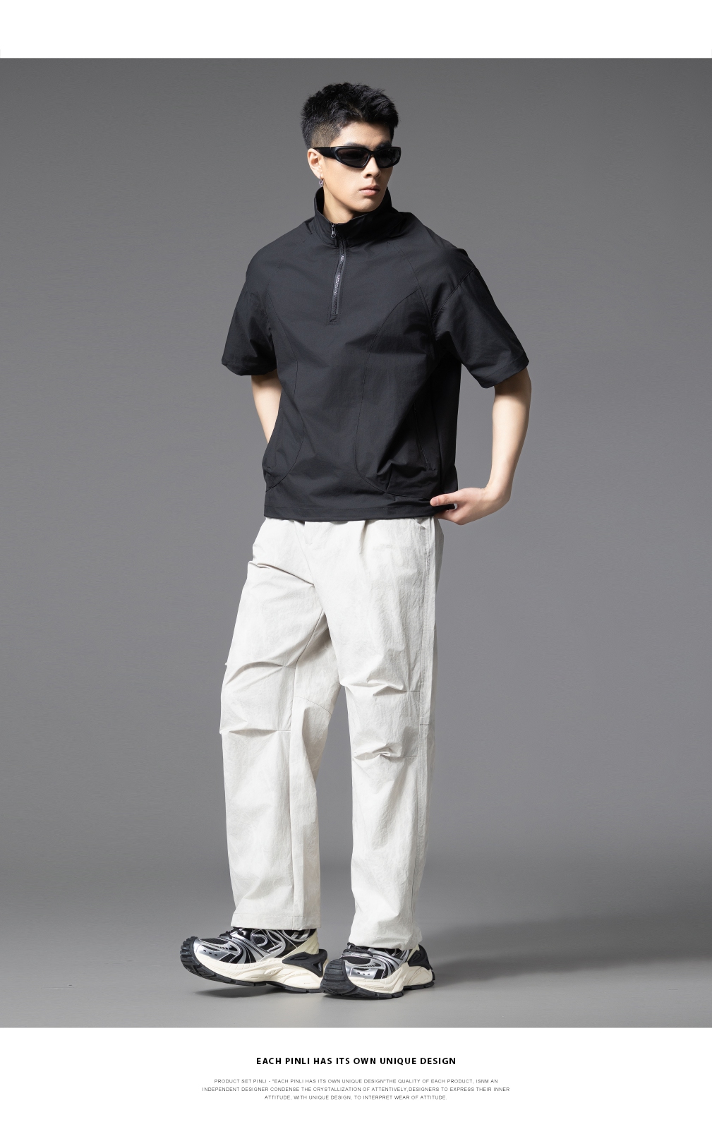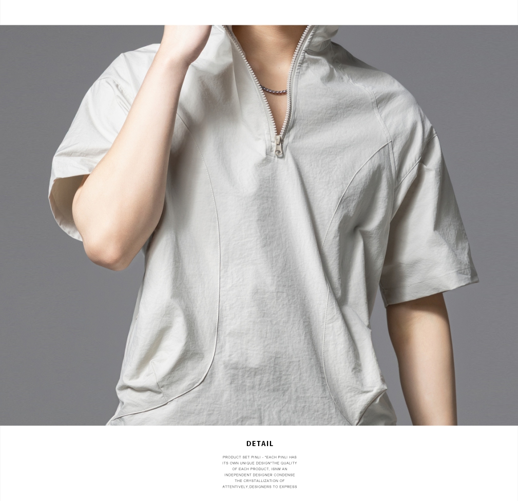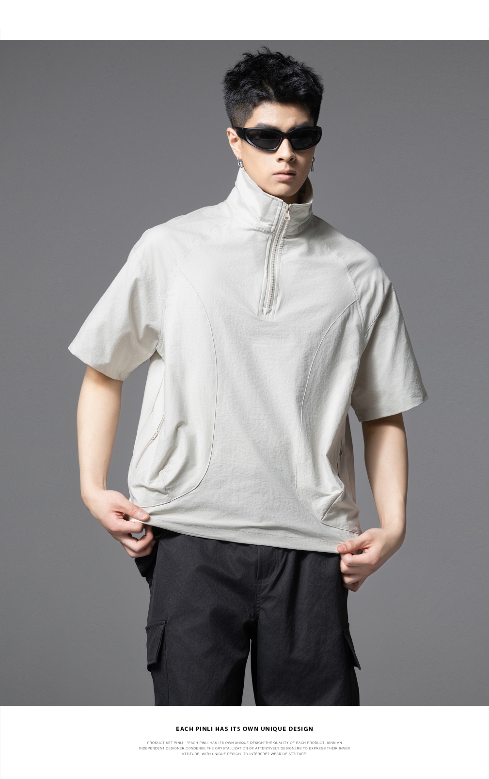 PINLI品立2025夏季新款男士立领半拉链短袖衬衫时尚简约纯色衬衣GD252113294