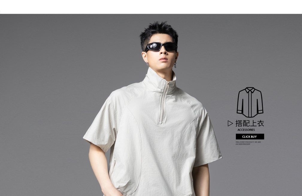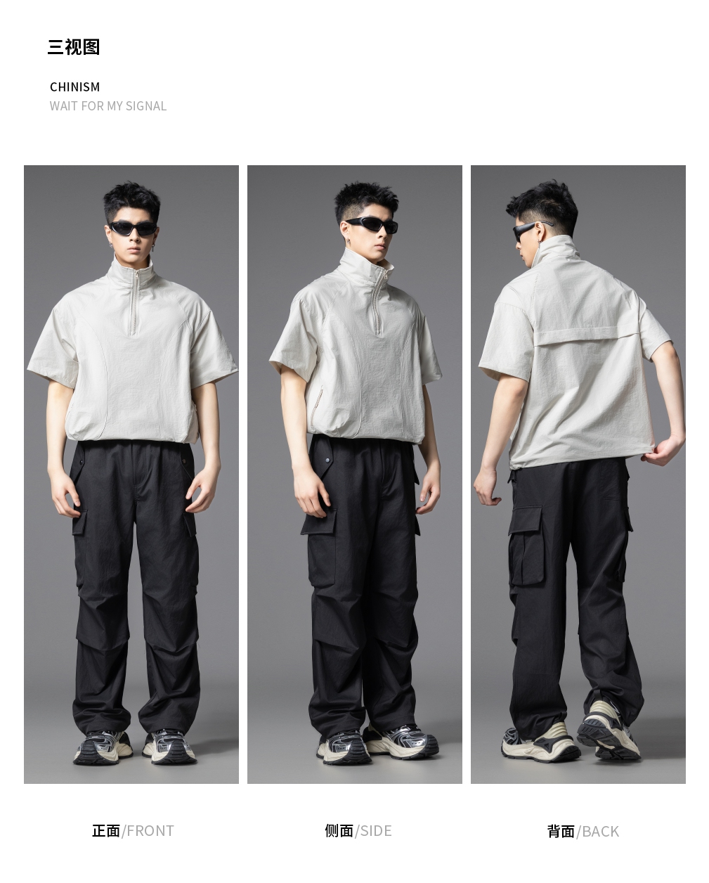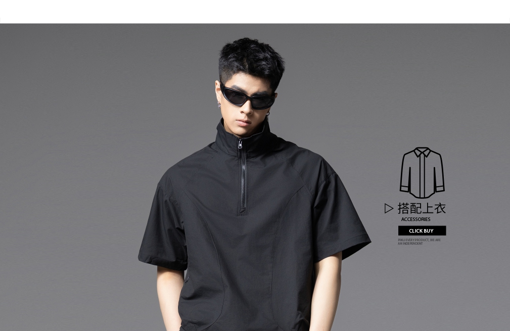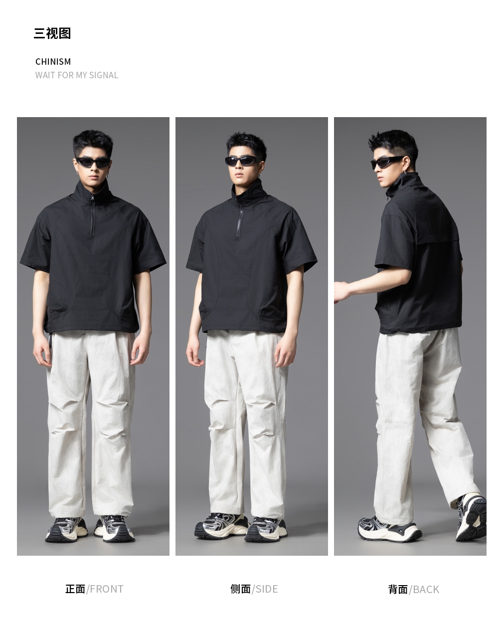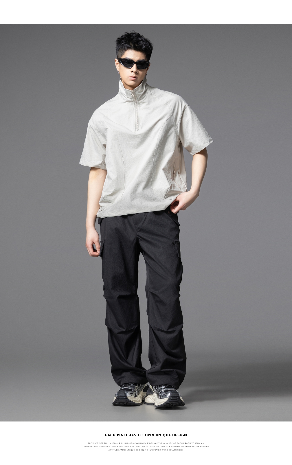PINLI品立2025夏季新款男士立领半拉链短袖衬衫时尚简约纯色衬衣GD252113294