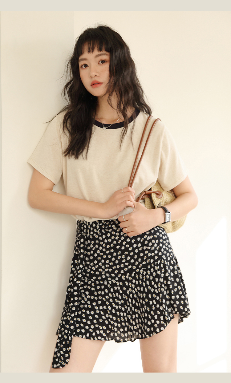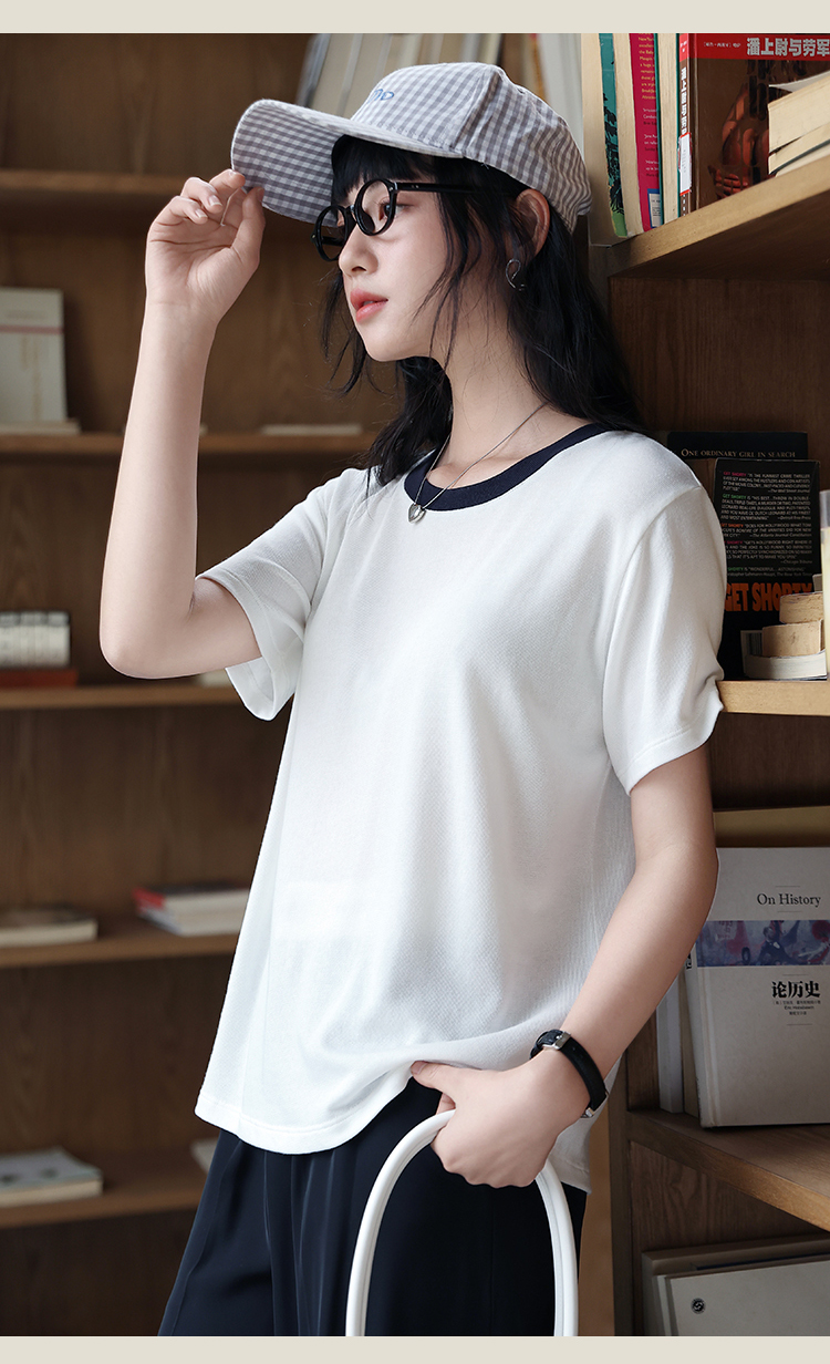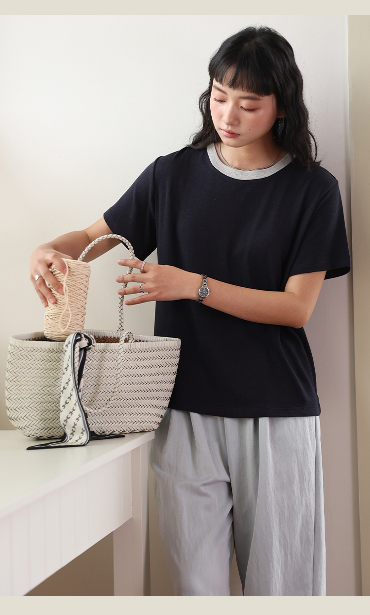 【KEMU】老钱风*针织亚麻撞色T恤 ,采用法国产区的雨露麻, 微落肩宽松版型,撞色领口,亲肤顺滑,随性舒适,简单不单调