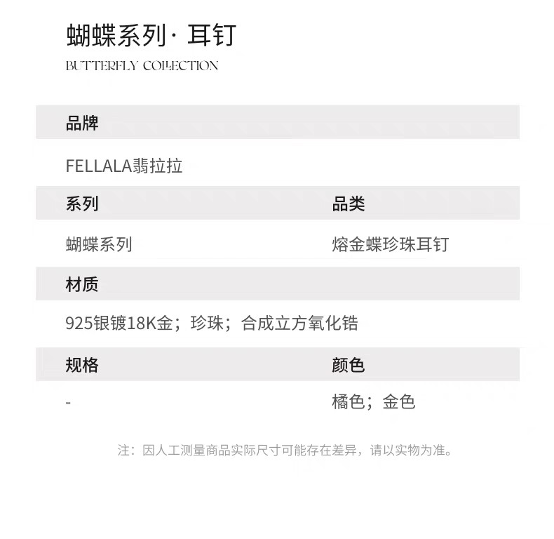 2楼Fellala/翡拉拉「蝴蝶」珍珠耳钉耳饰高级设计感货号926434113吊牌价1199现价1079
