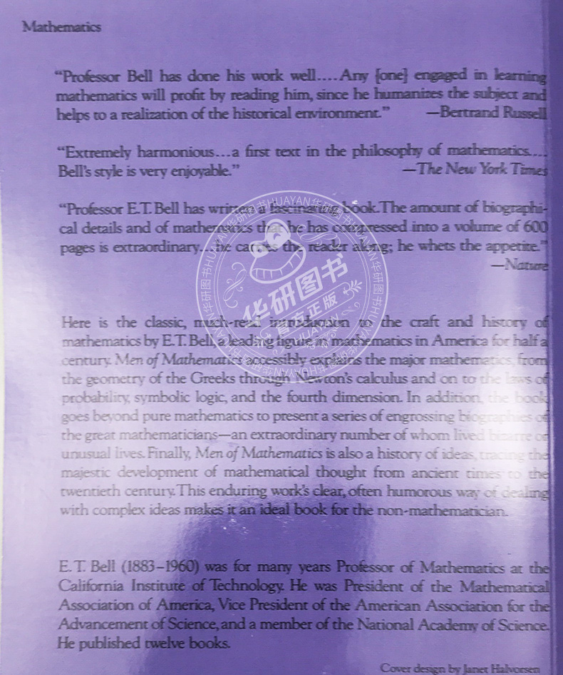 “贝尔教授已经写出一本引人入胜的著作。大量传记的细节和数学知识,的确令人惊叹……他吸引着读者;他吊起了胃口。”——《自然》杂志