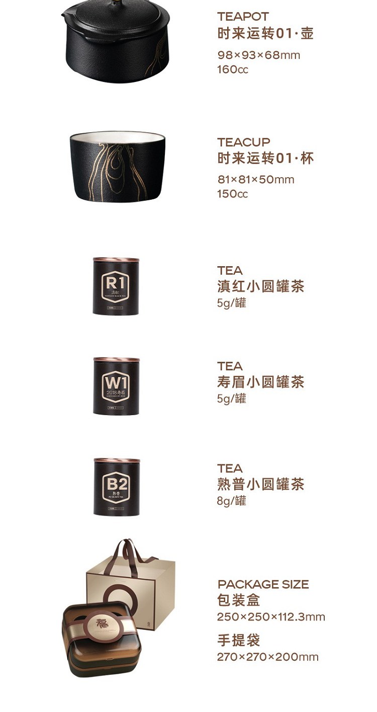 尺寸:壶尺寸容量:99*93*68mm 160cc杯尺寸容量:83*83*51mm 150cc茶叶:滇红:5g/罐 寿眉:5g/罐;熟普:8g/罐礼盒:250*250*112.3mm