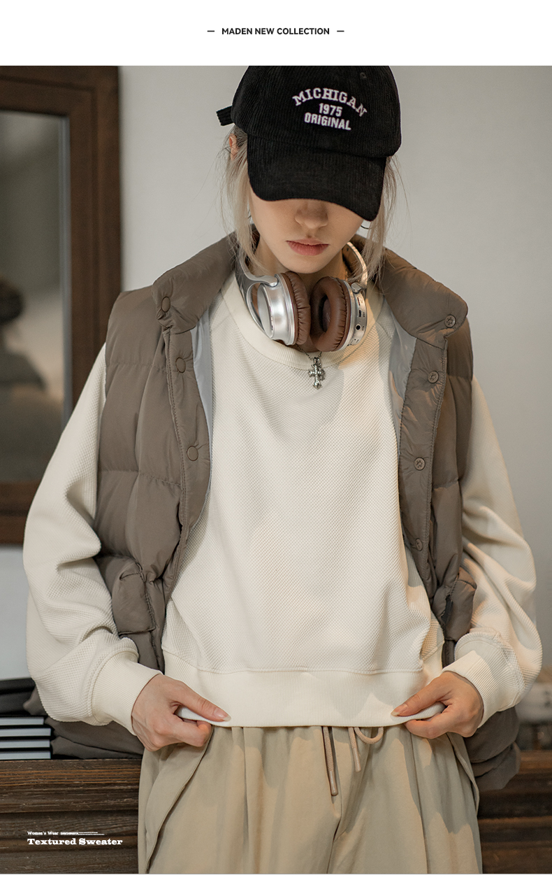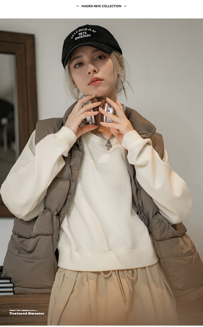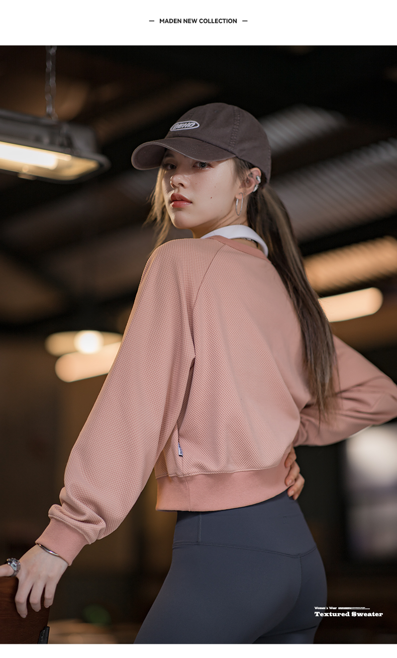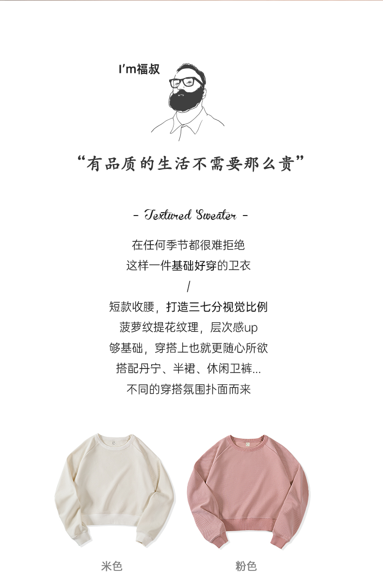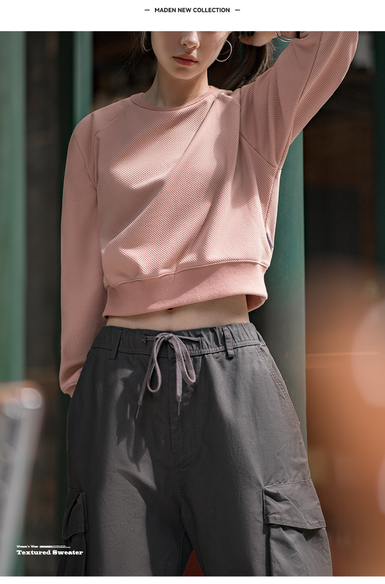 马登美式收腰短款圆领休闲卫衣小个子内搭打底长袖上衣华夫格女