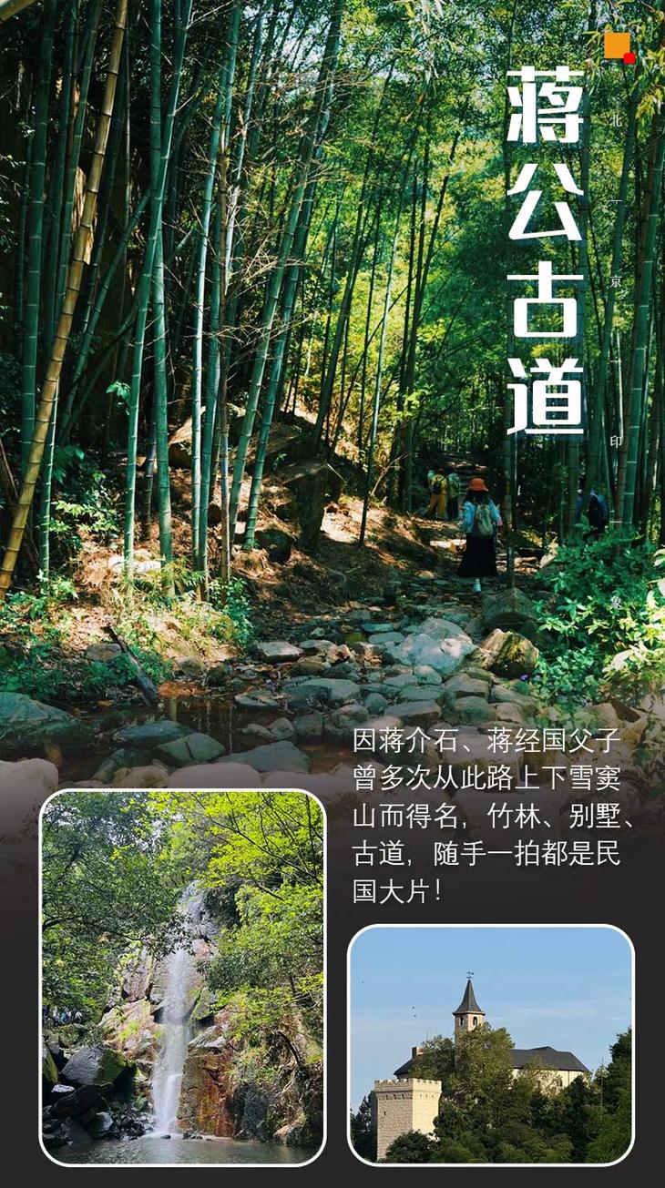 蒋公古道是莫干山深处藏着的人文秘境,全程约10公里,青石板路蜿蜒于万亩竹海之间,难度休闲,新手友好。起点庾村文化市集保留民国老车站、钟楼,文艺气息浓郁。沿古道上行,遮天蔽日的翠竹形成天然长廊,溪水潺潺,鸟鸣幽幽,夏日格外清凉;登上古望吴台,视野拉满的270°观景平台,凭栏远眺,山风拂面;途经网红地标裸心堡,远远望去,古堡在山林间尽显独特风情。核心打卡剑池,作为莫干山标志,相传是干将莫邪铸剑之地,四叠飞瀑气势磅礴,竹林环绕,水汽氤氲,仙气十足。行至山顶,武陵村民国别墅群不容错过,200 多幢风格各异的老建筑被誉为 “世界建筑博物馆”,其中蒋介石官邸 “松月庐” 庄重典雅,红砖墙与绿竹海相映,复古感拉满。全程串联自然与人文,漫步古道,既享竹海负氧,又触摸民国风云,是浙北经典轻徒步路线。