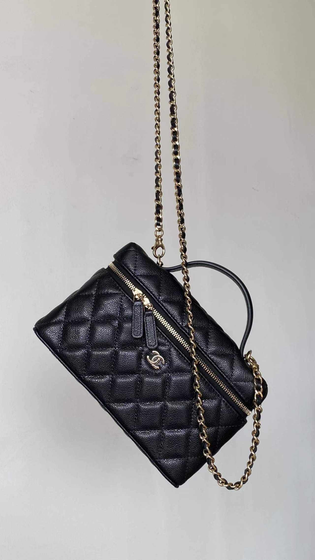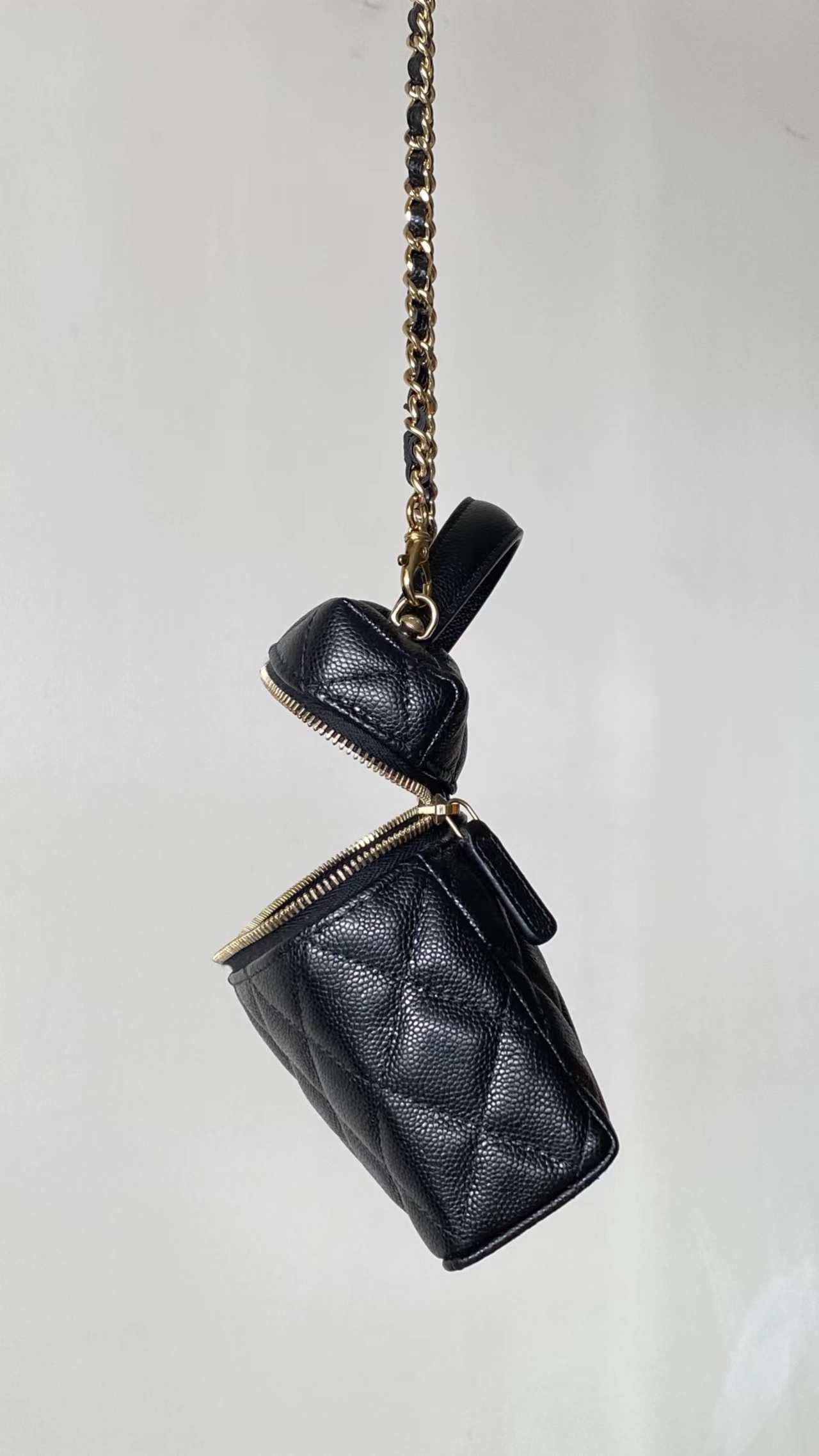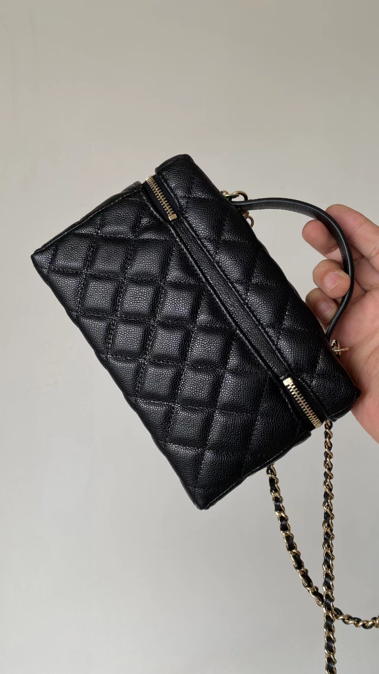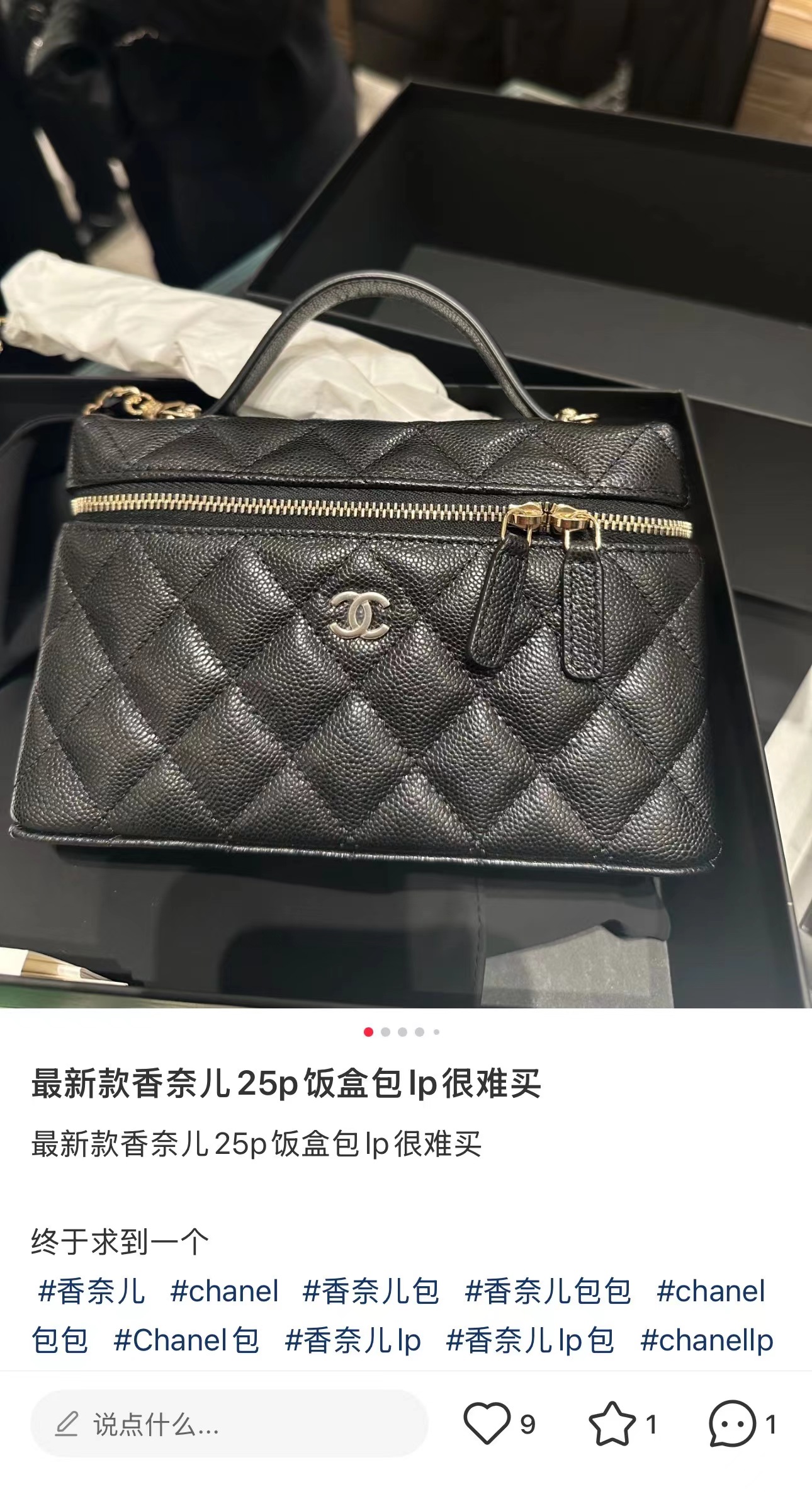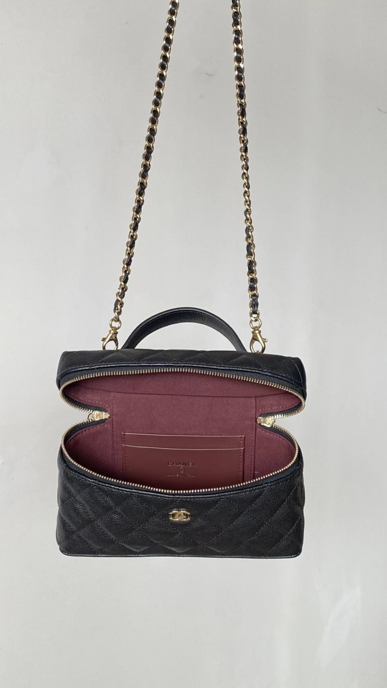 链条手拎盒子包, 黑色,香槟金扣!打开瞬间依旧是熟悉且精典的酒红;斜纹丝绸混纺面料内里~ 一提一斜挎方寸间都是满屏的法式松弛与优雅~