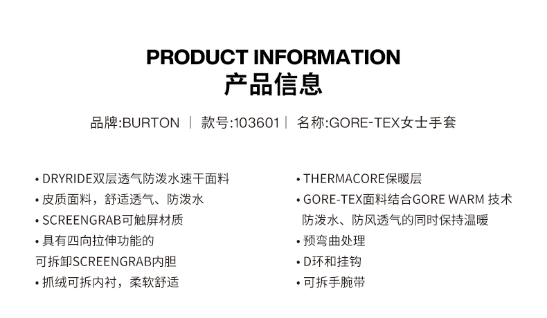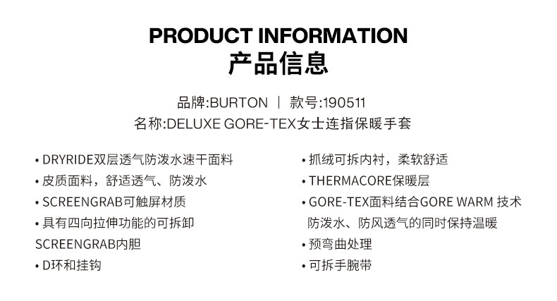 【断码六折】BURTON/伯顿女士 WB GORE MTT滑雪手套并指防风保暖冬季分指单双板 103911