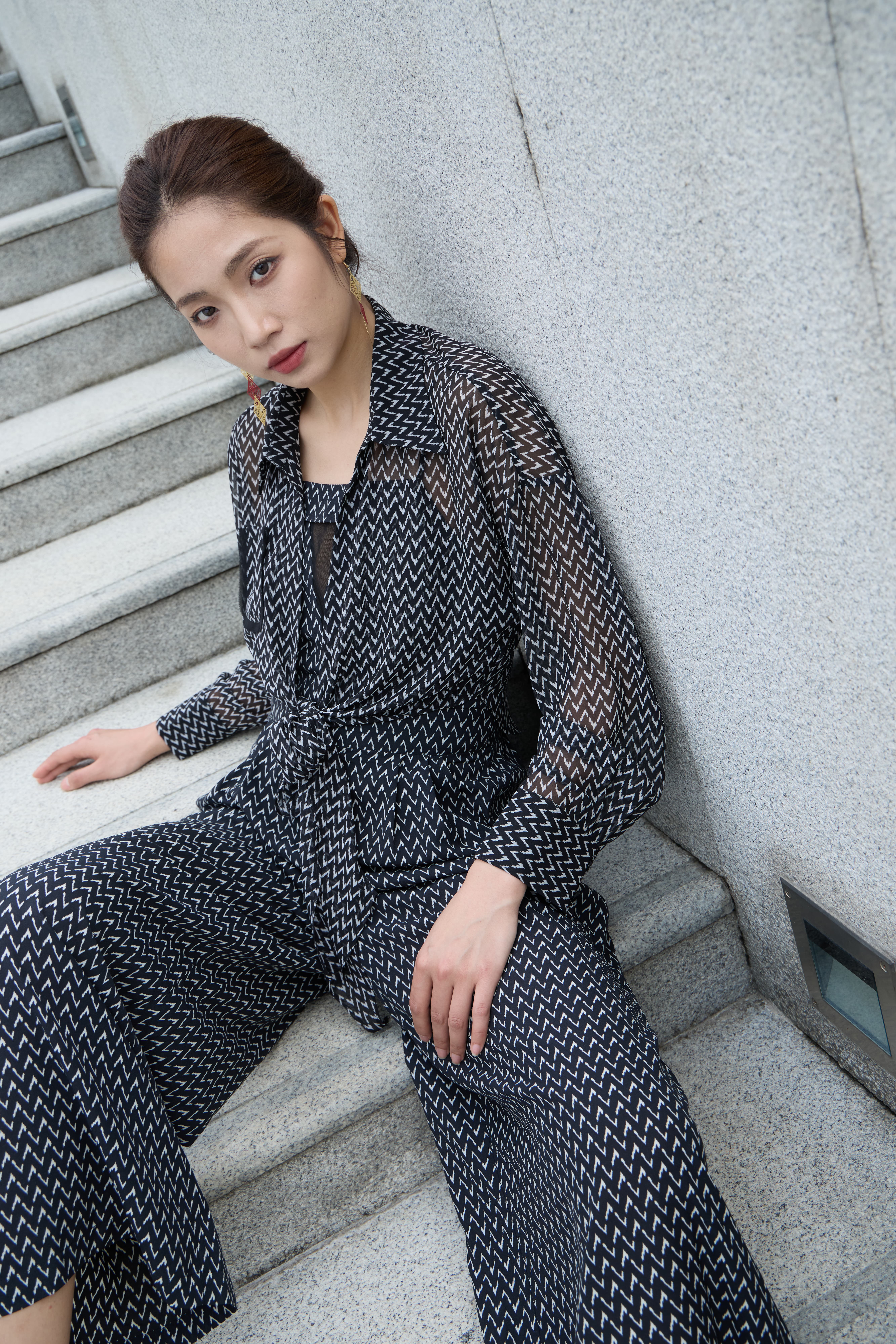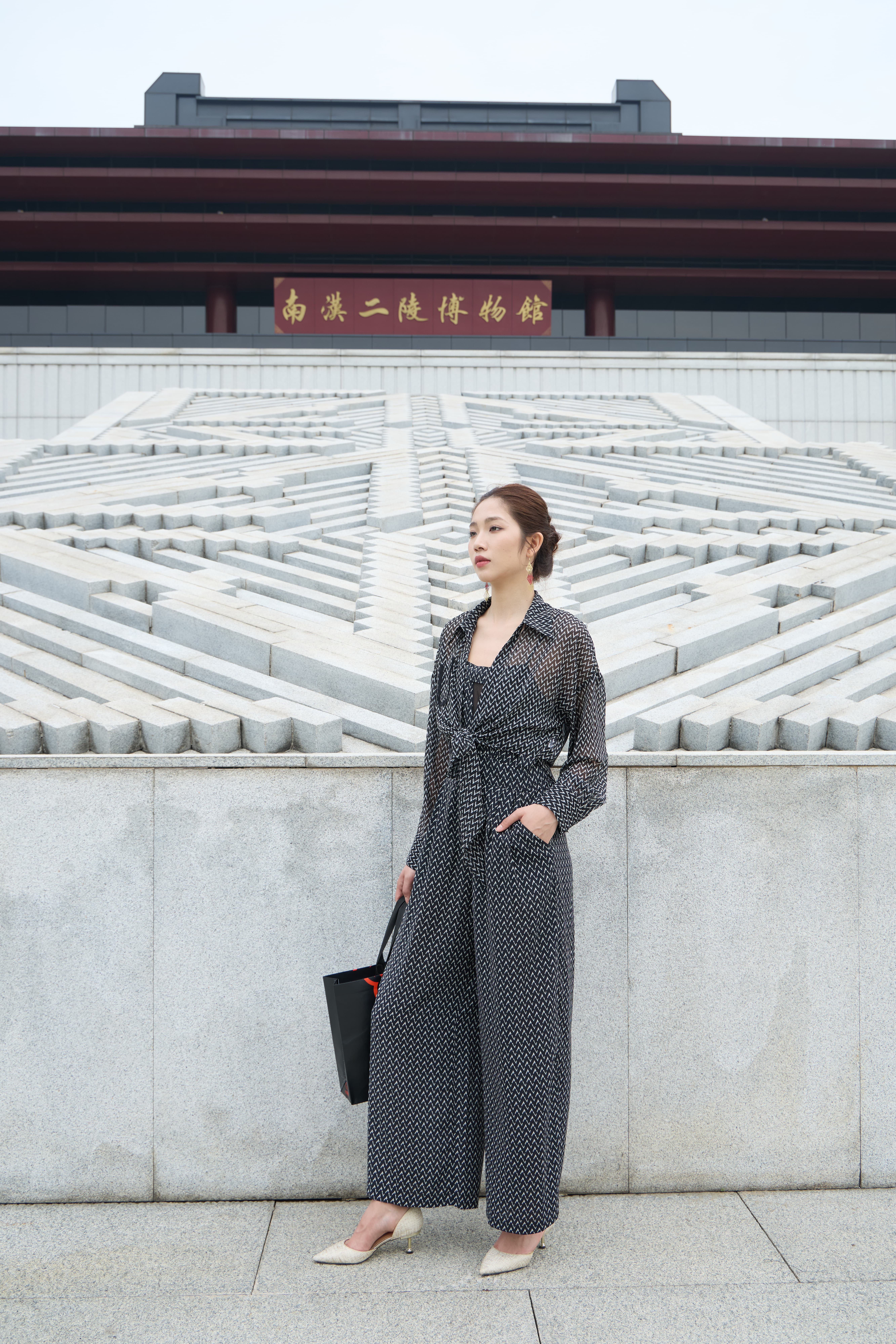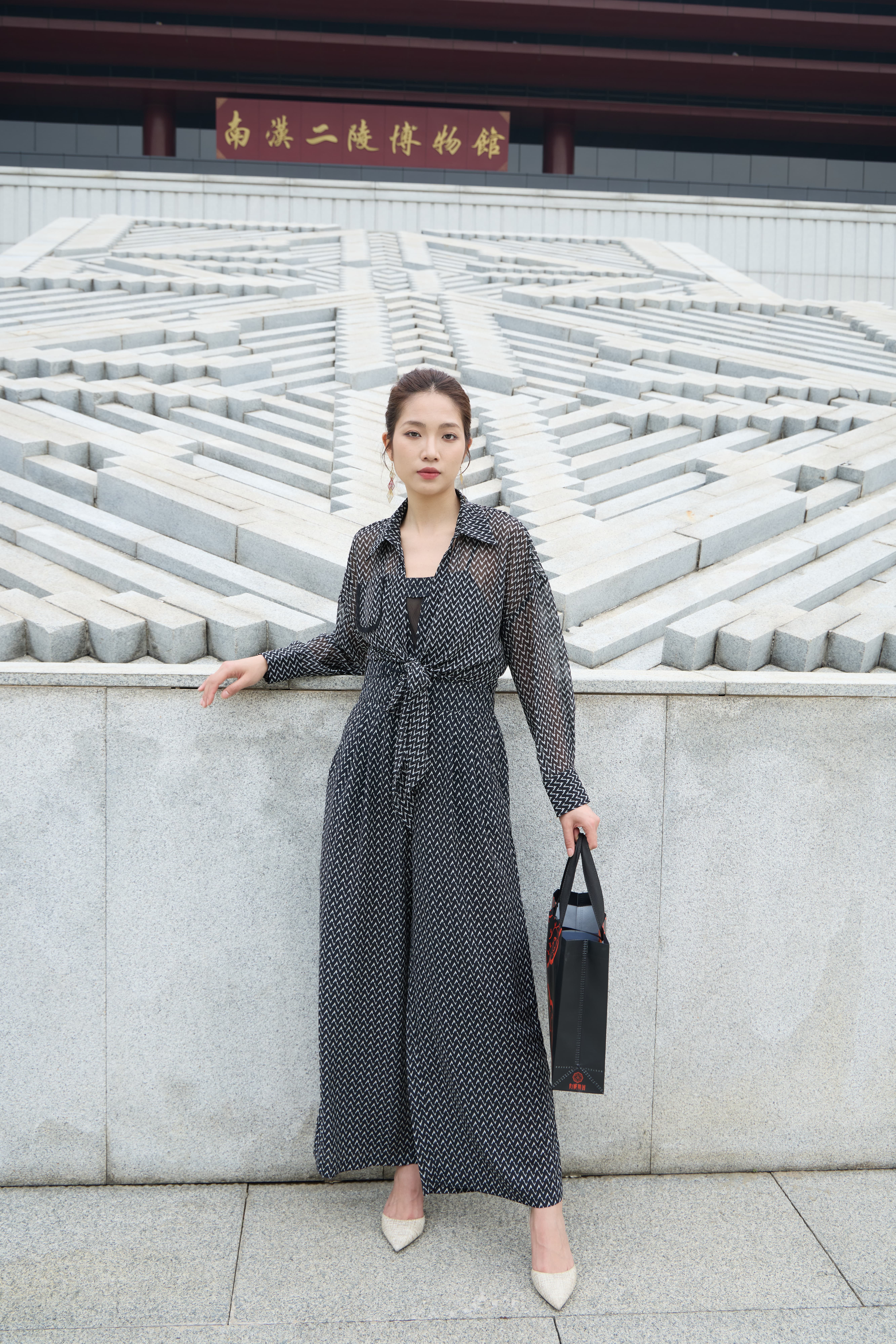 千鸟格游走黑白印花间,雪纺随步荡起慵懒弧线✨立于博物馆光影墙下,衣摆与油画共振,叠穿层次自成春日诗篇。