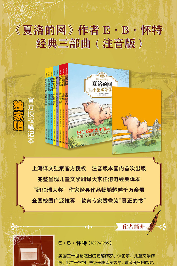 这套书是注音版,只要会拼音,就算不认识字,也可以读,所以一些中班就开始学习拼音的娃可以一边巩固拼音,一边阅读名著。这套故事不仅仅只有《夏洛的网》,还有《精灵鼠小弟》和《吹小号的天鹅》。这三个故事都是由美国的E·B·怀特所著。