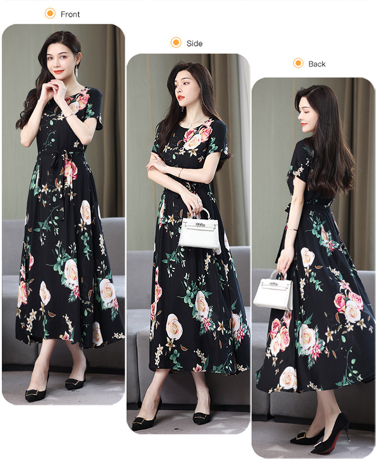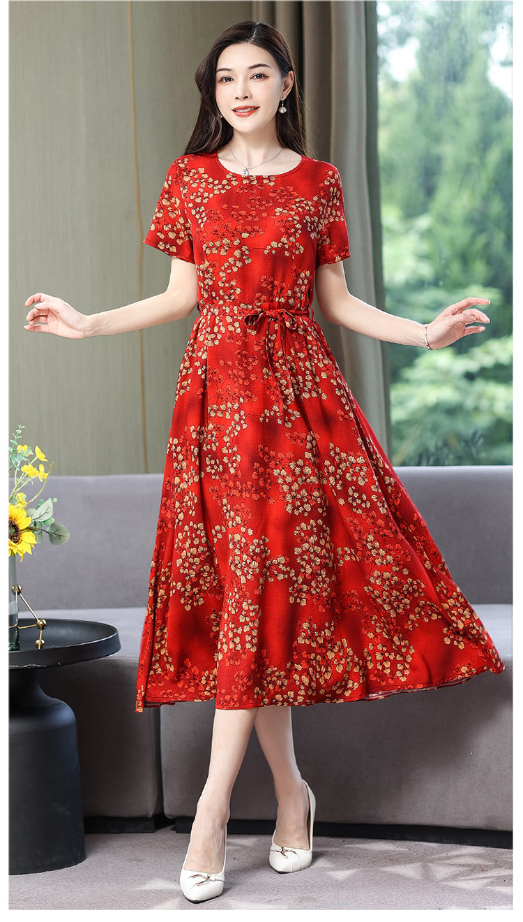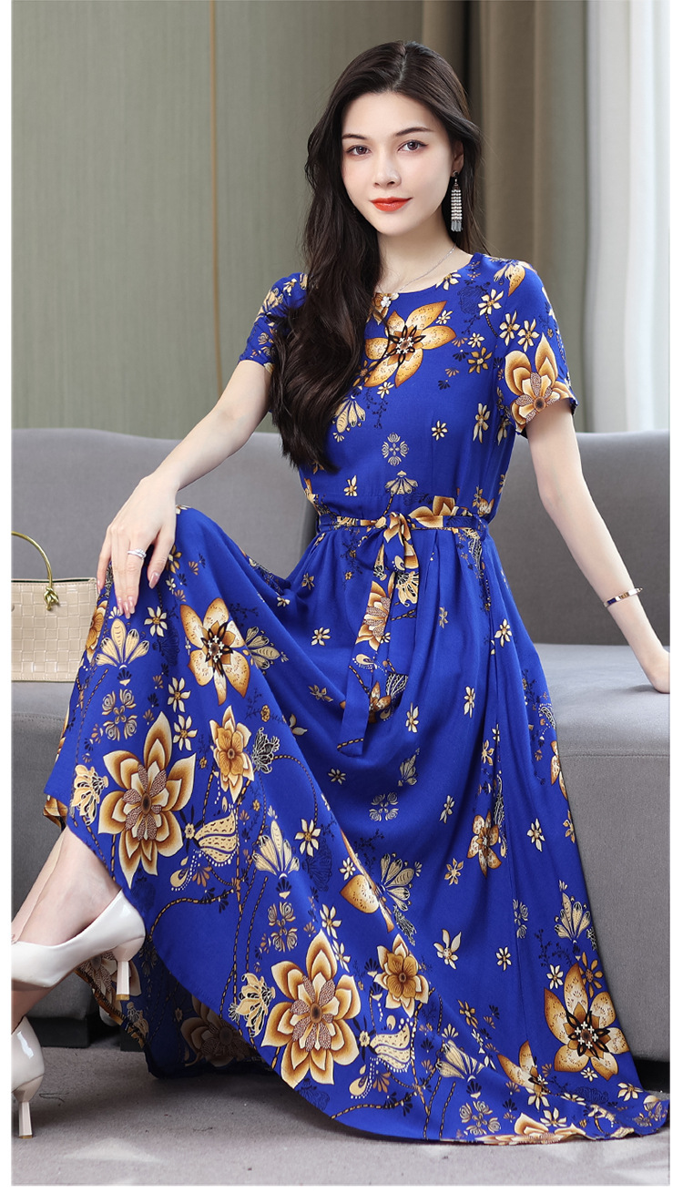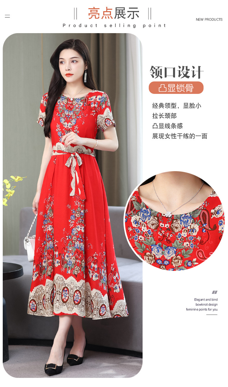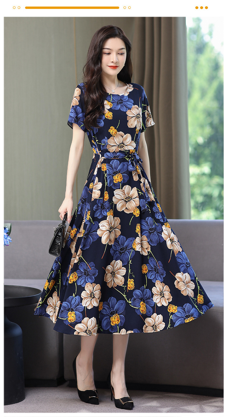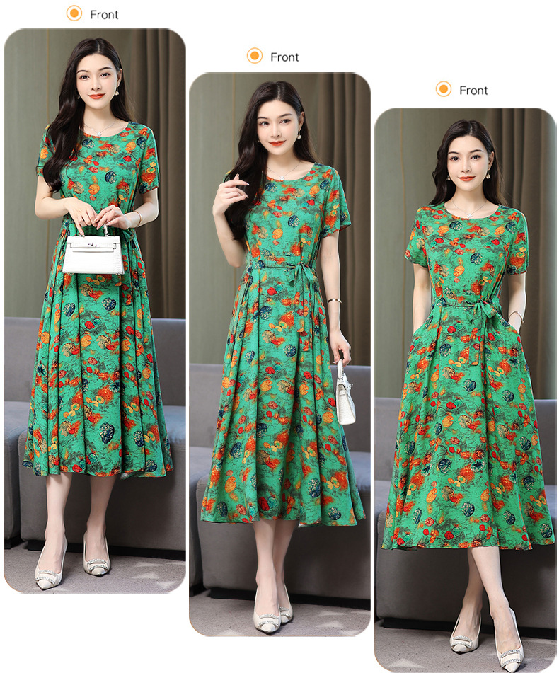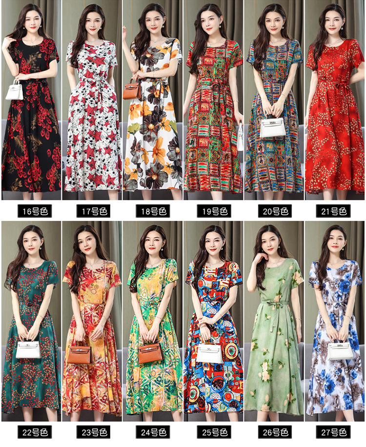 HS-096夏装棉绸连衣裙大码显瘦中长款碎花过膝绵绸长裙
