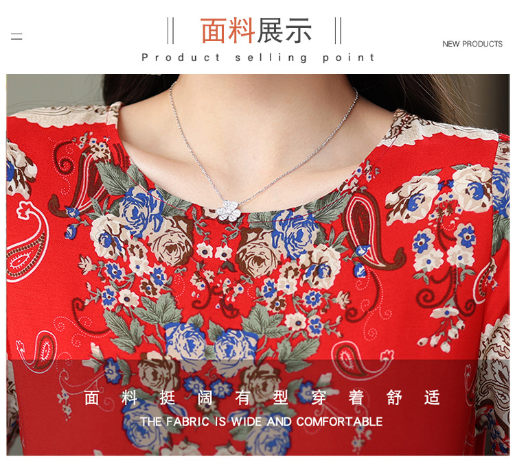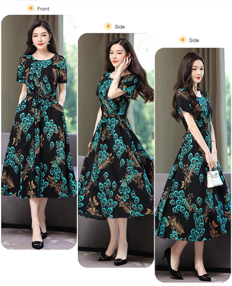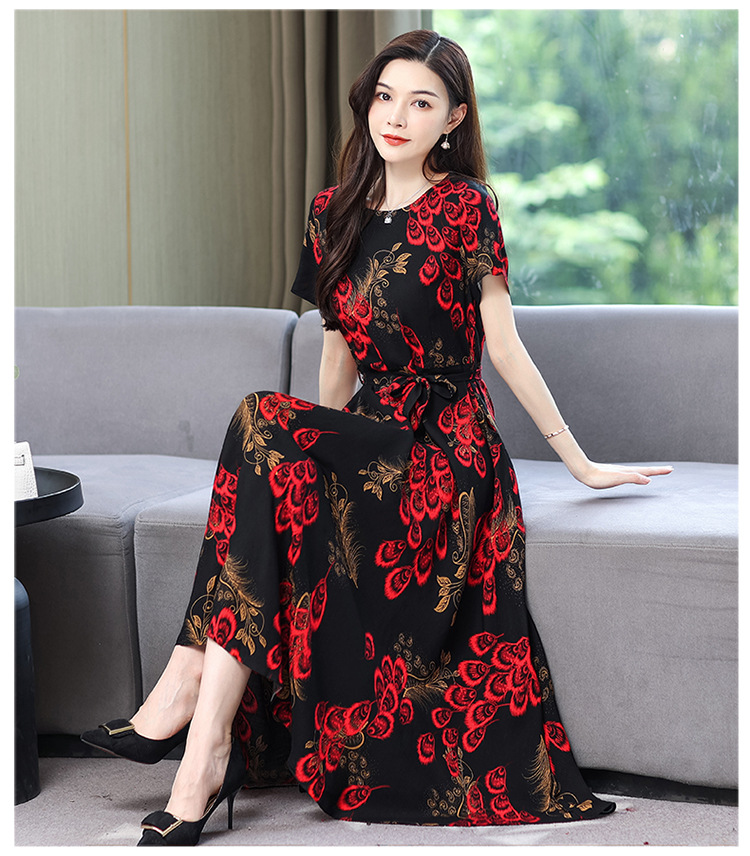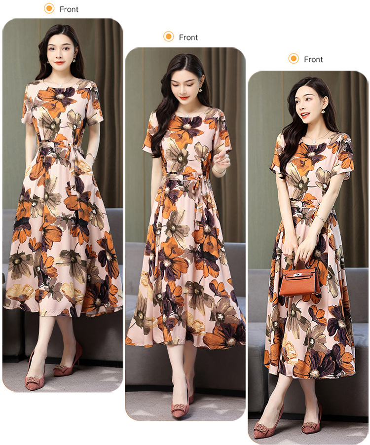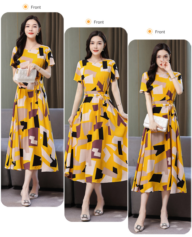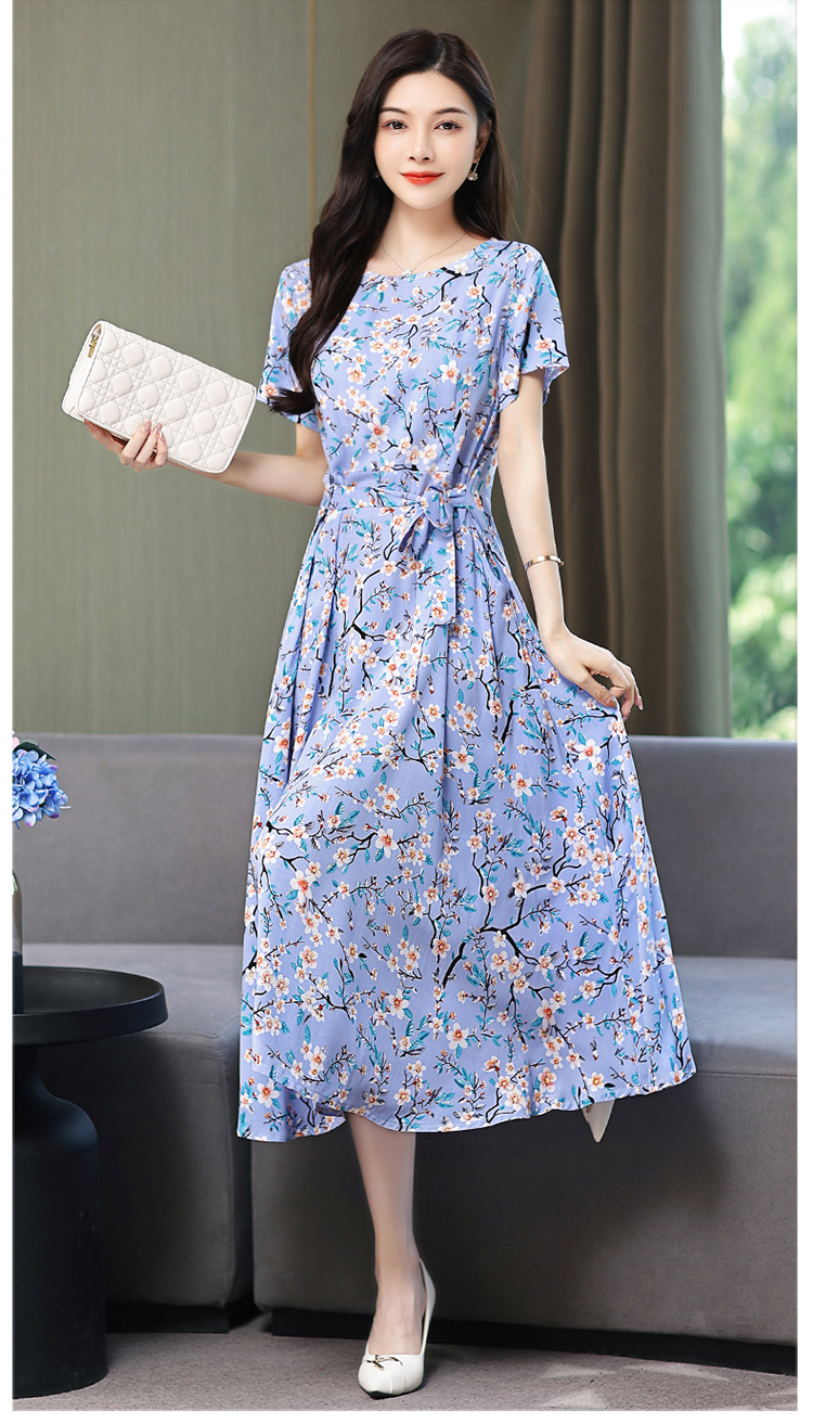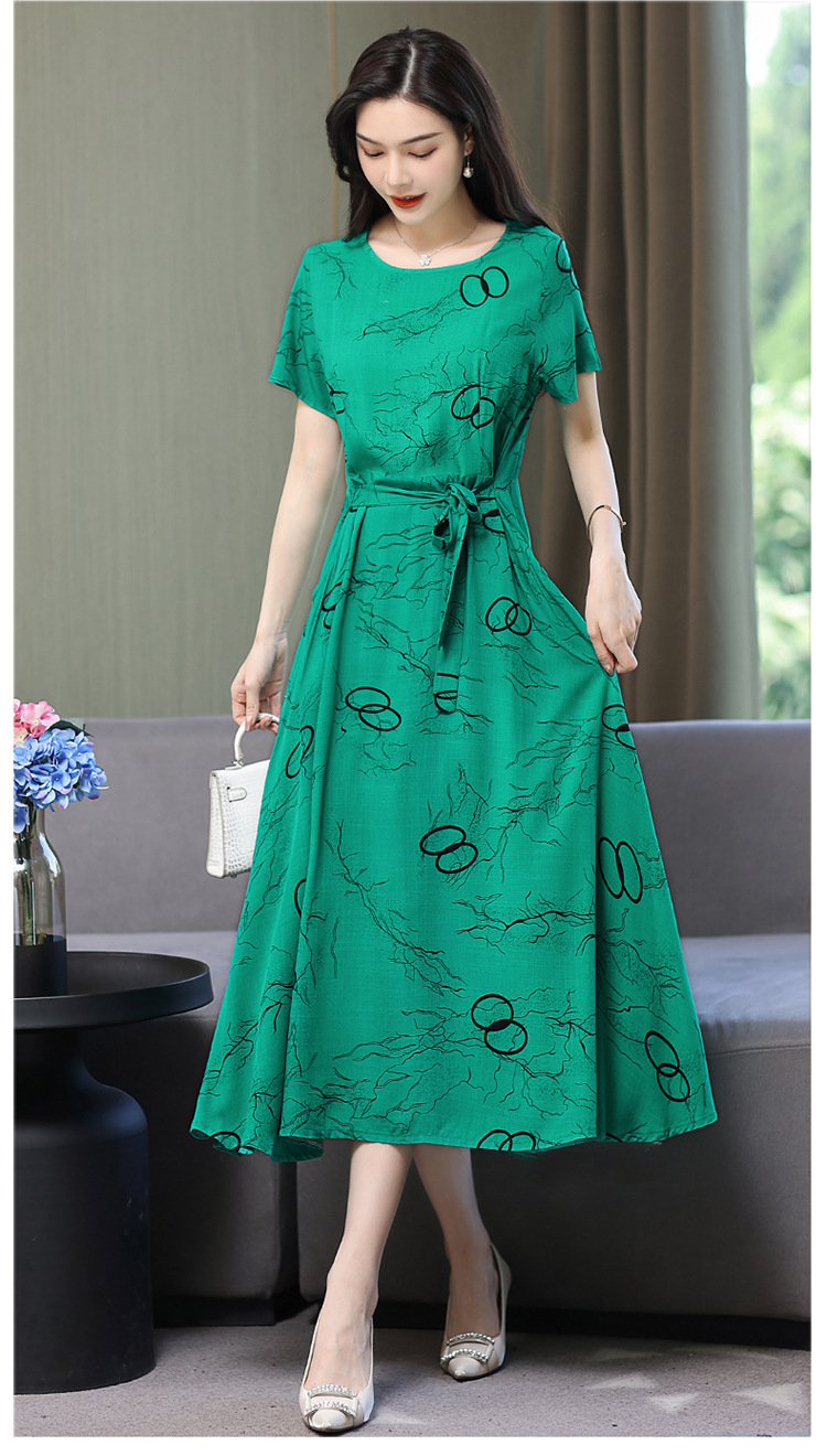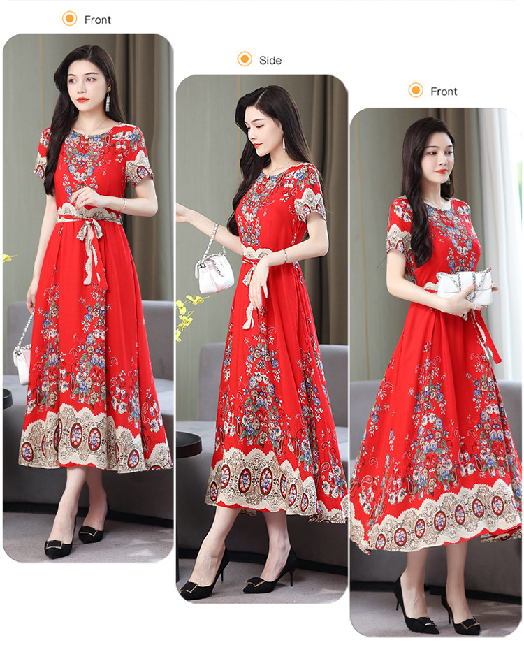 HS-096夏装棉绸连衣裙大码显瘦中长款碎花过膝绵绸长裙