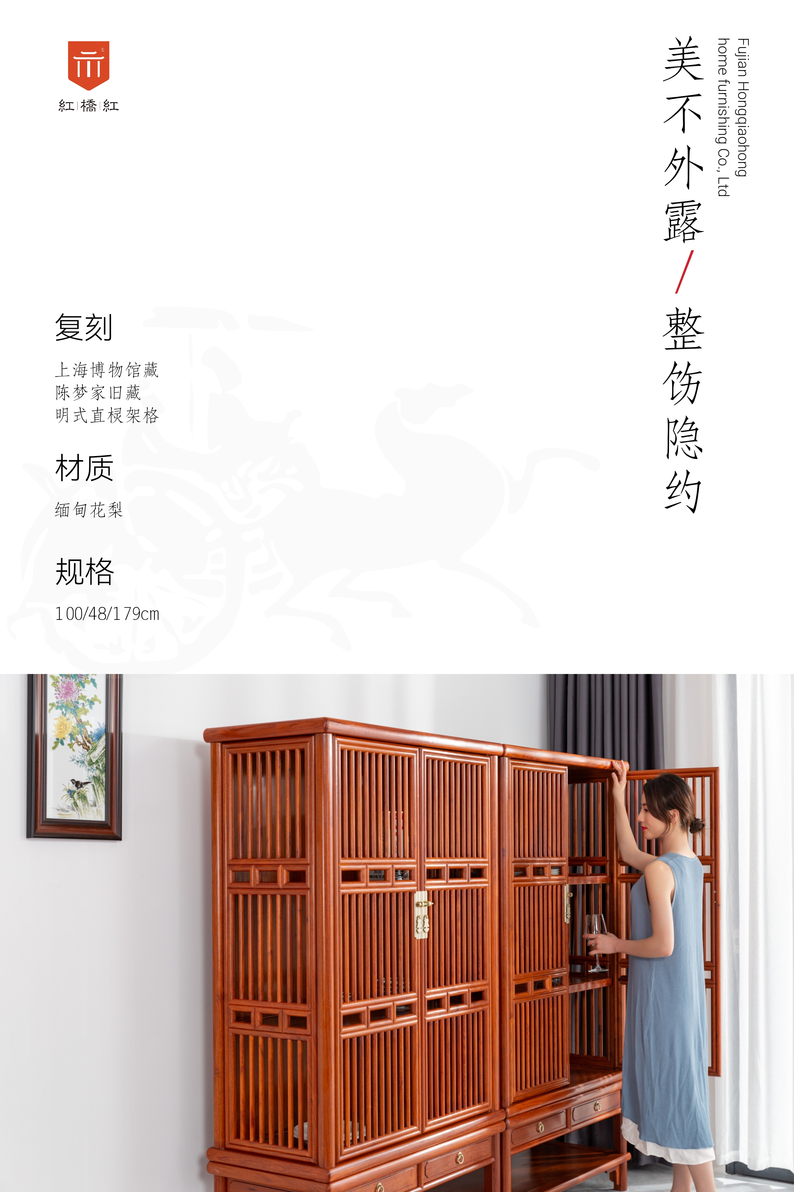 此款三面直棂透棂架格,原型藏于上海博物馆,为陈梦家夫人旧藏,明代小叶紫檀制,王世襄先生的《明式家具珍赏》和《明式家具研究》二书均有收录,此类家具古代普遍用于存放食物,苏州一代称饭橱、碗橱,北京一代称“气死猫”,架格上部分有三层,进深宽大,正面木轴直棂门,门上铜拉手为上下黄金分割点位置,圆直棂分三段,中以扁平框做间隔,两侧透棂,造法相同,有两屉并开光屉板,板下素牙头,四立足外圆内方,用材颇硕,观之又秀然,整体简练浑圆,疏透雅致,今亦作书橱、茶柜,执古御今,宜藏宜用。
