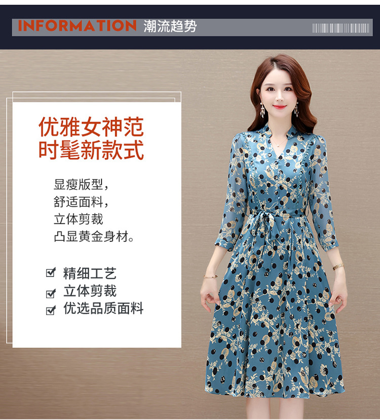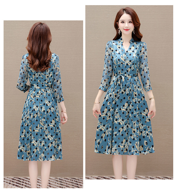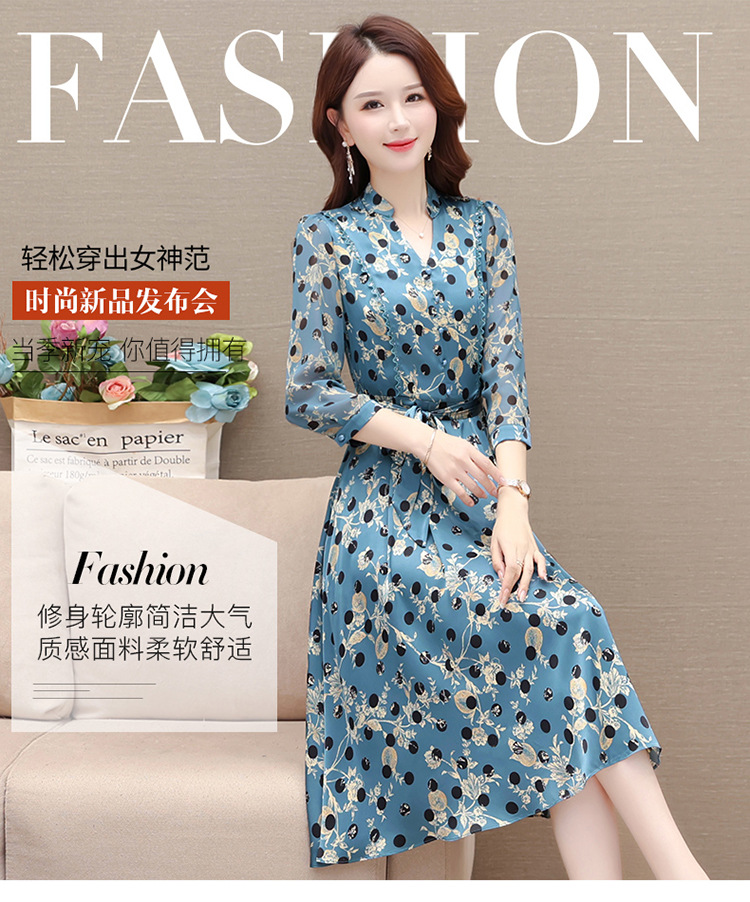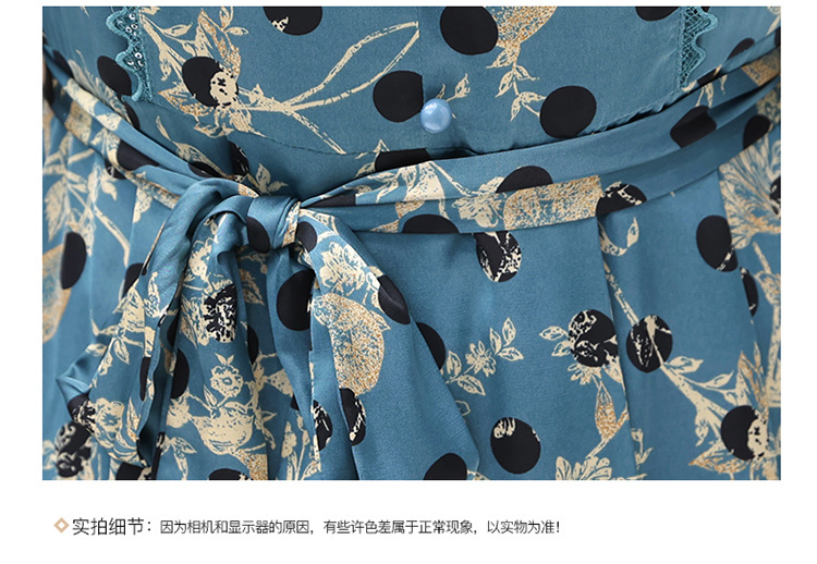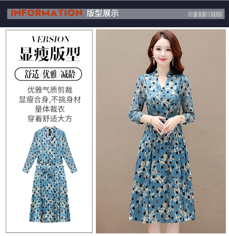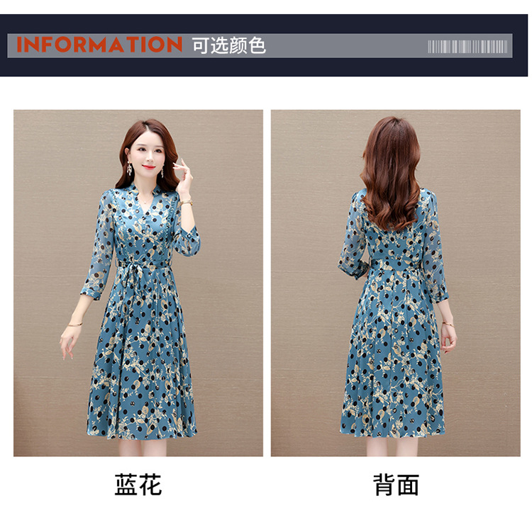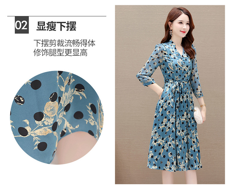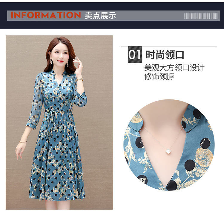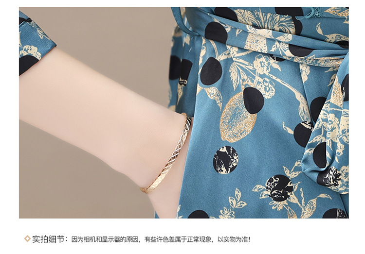 秋季新款,妈妈装中长款系带裙长袖A字裙蓝色圆点印花连衣裙QYM-JJ-AE23503-Y