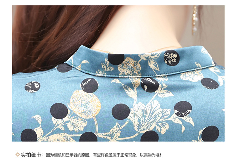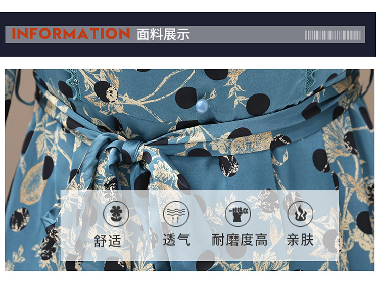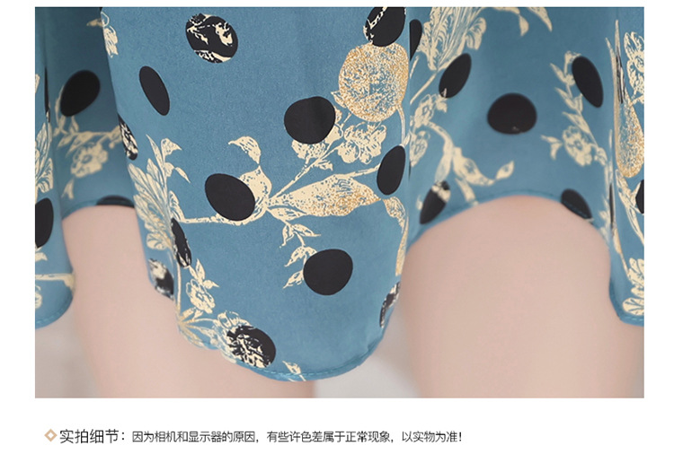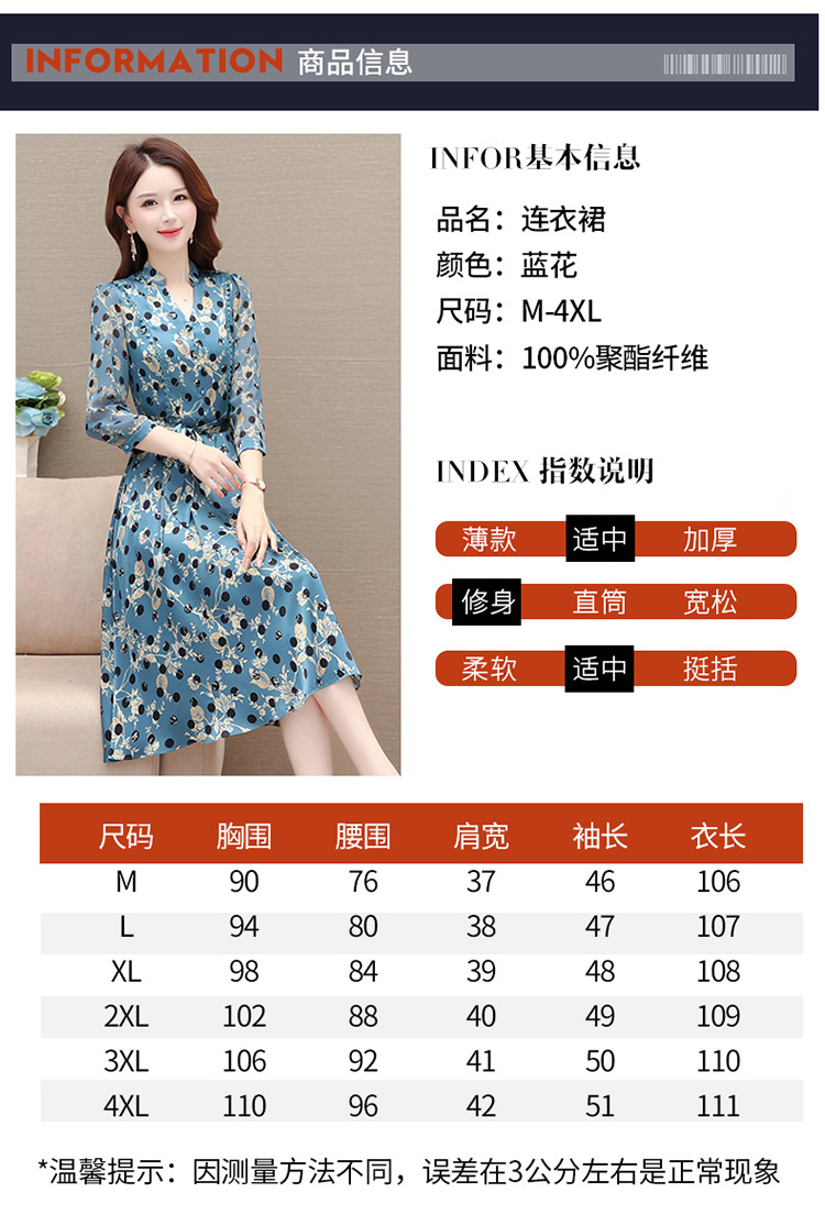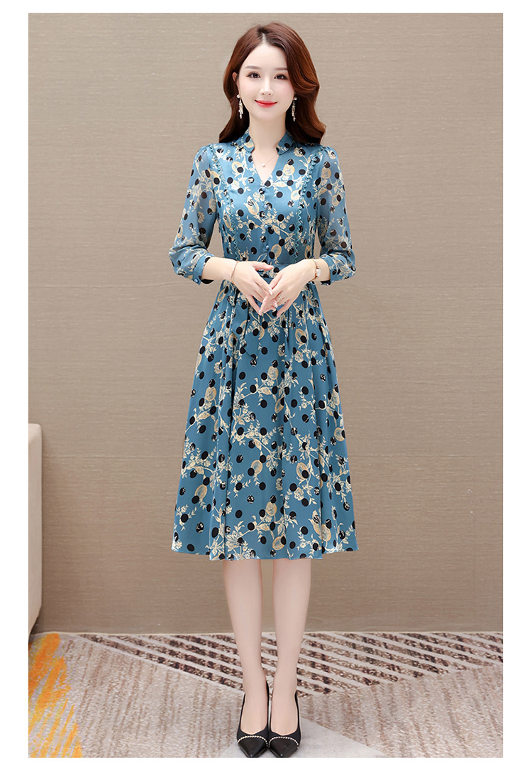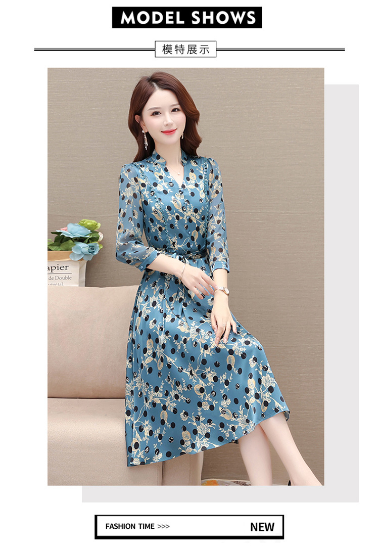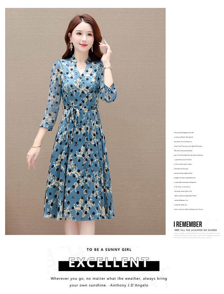 秋季新款,妈妈装中长款系带裙长袖A字裙蓝色圆点印花连衣裙QYM-JJ-AE23503-Y