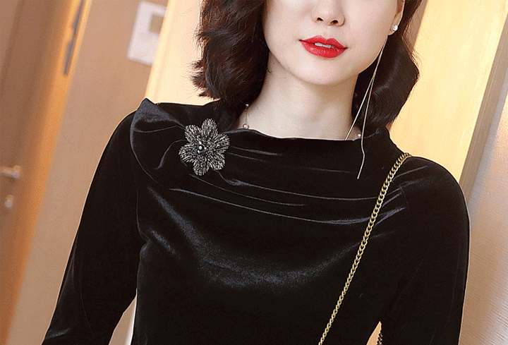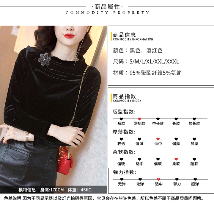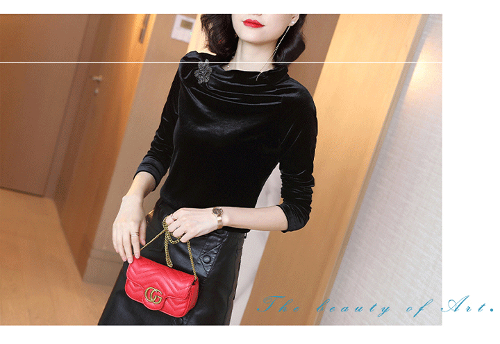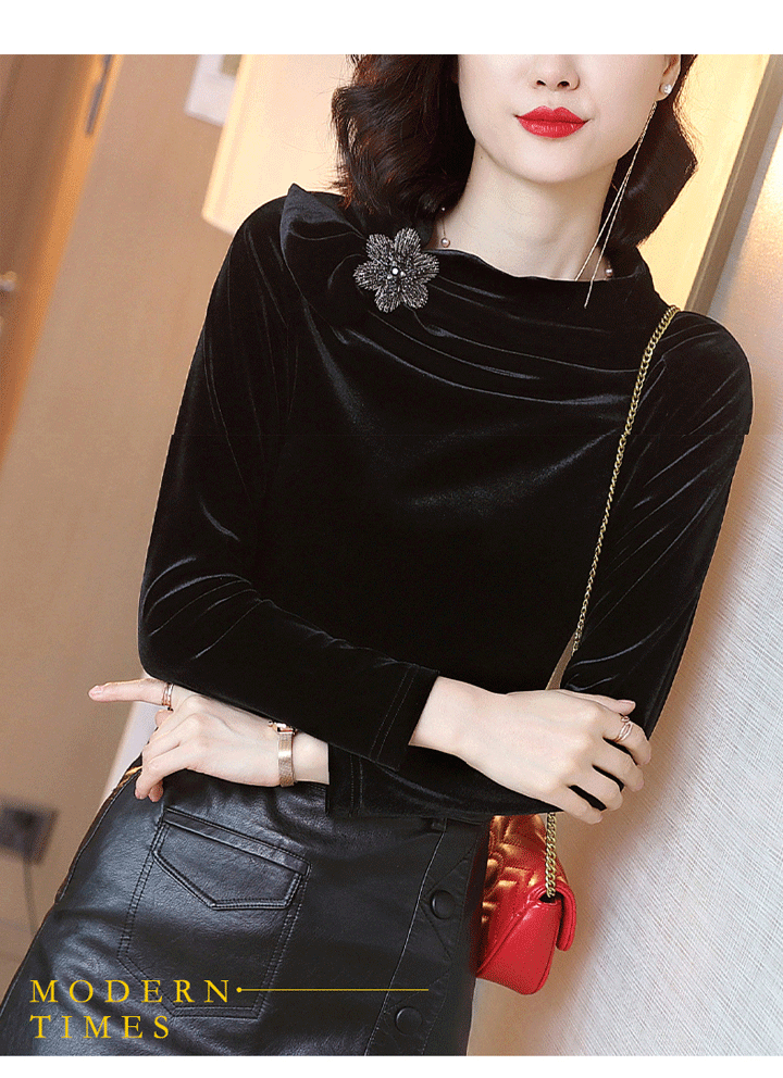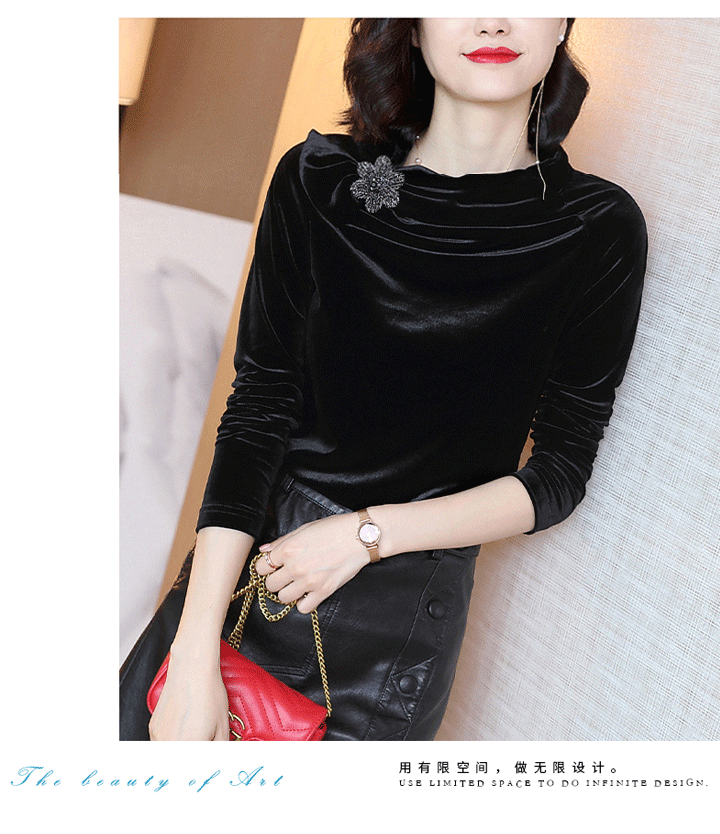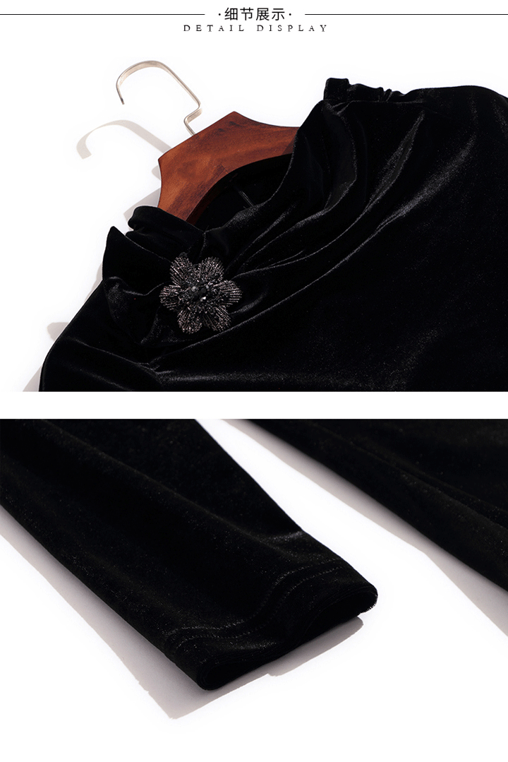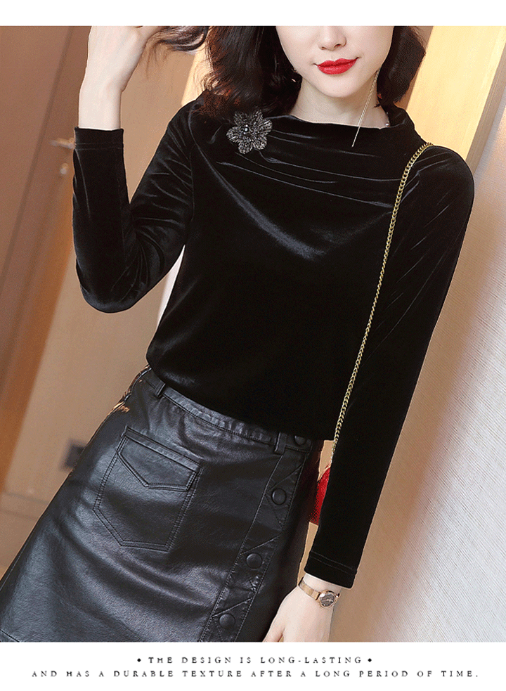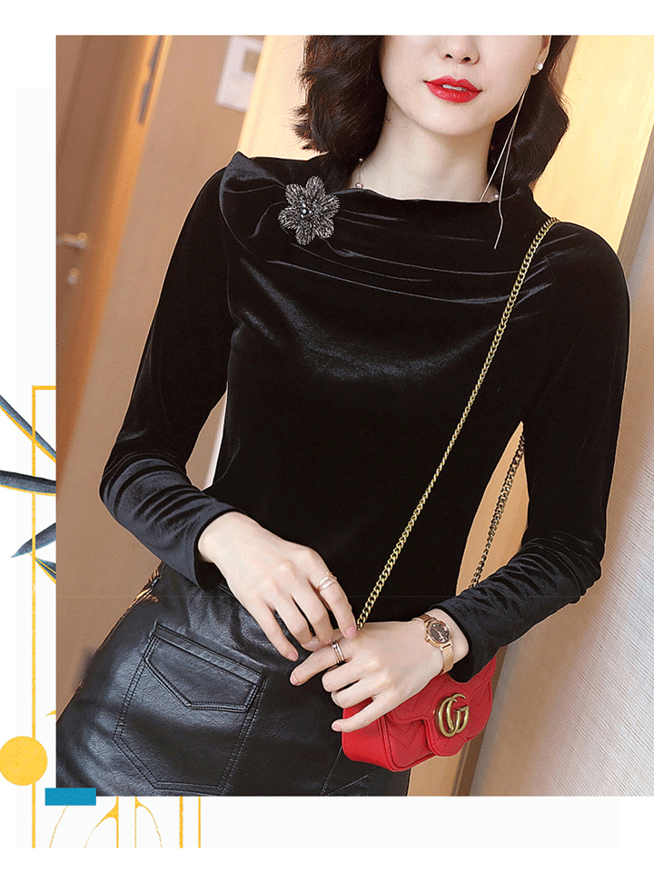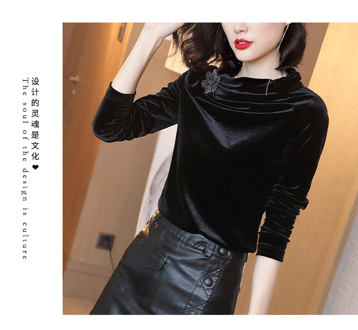 丁摩 金丝绒上衣女秋季新款设计感小众立领黑色打底衫修身长袖T恤19-161DB149240531