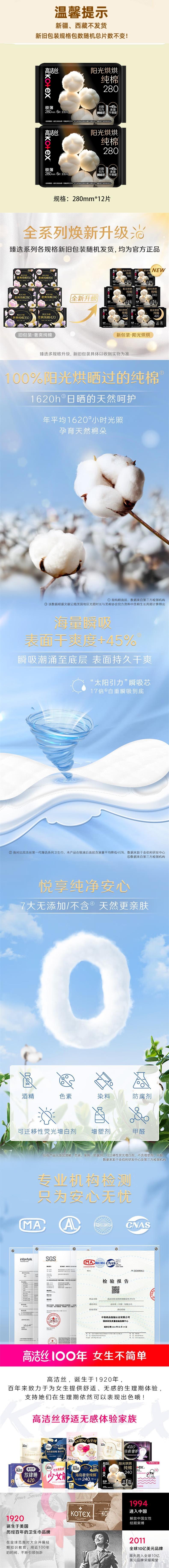 高洁丝 全新阳光烘烘纯棉日夜用卫生巾280mm6片*2包 JGS0HY6P2B
