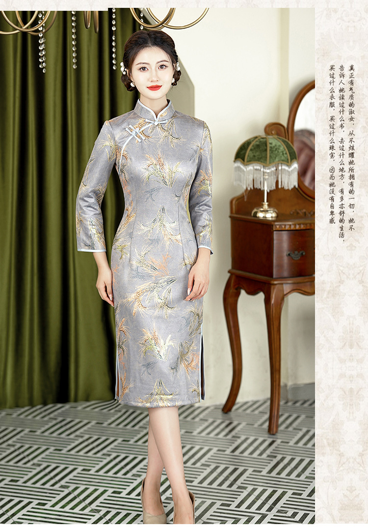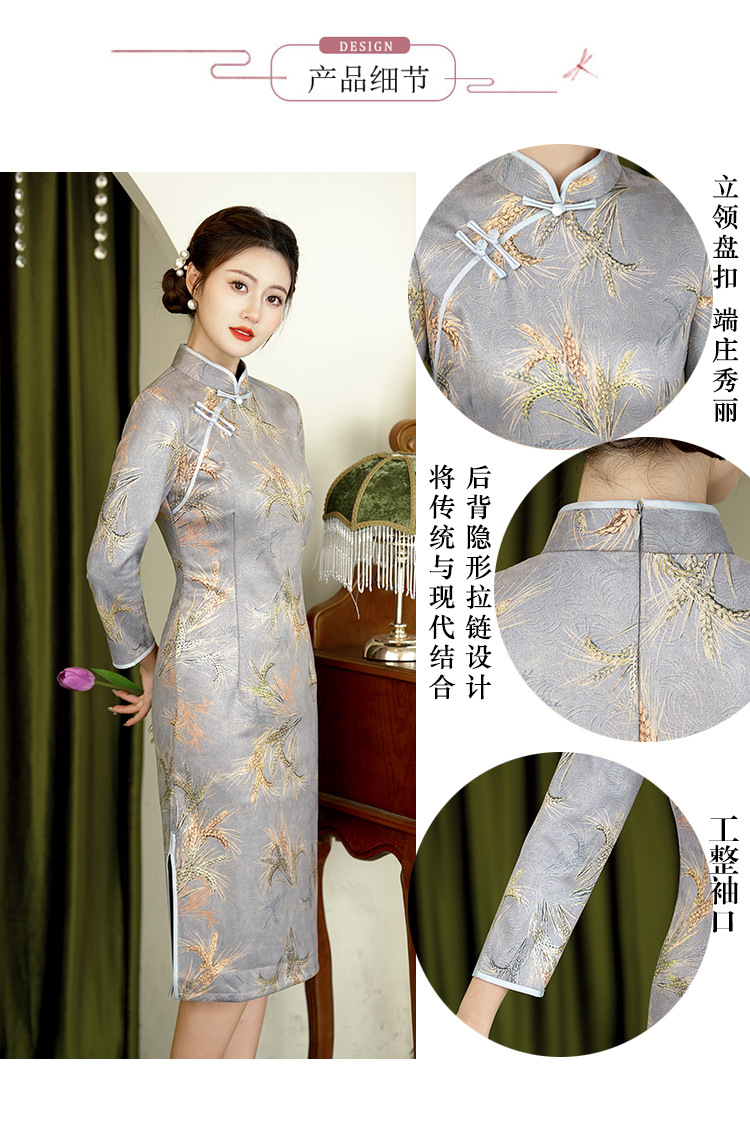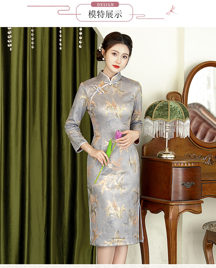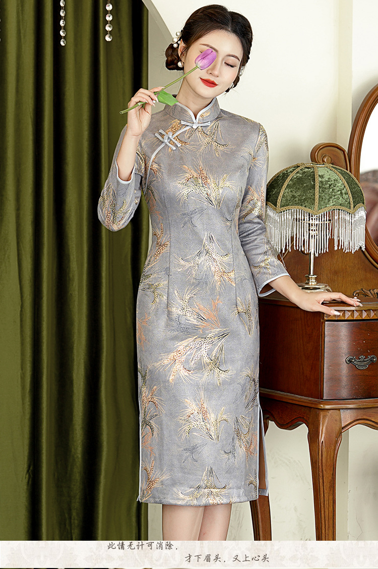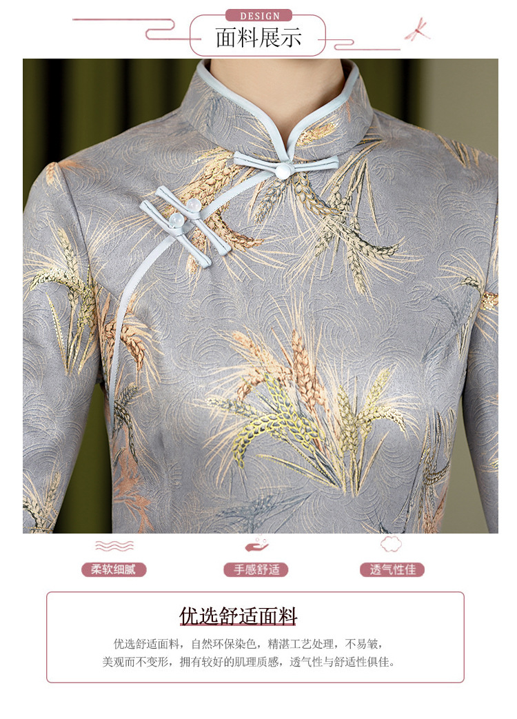 麦穗春秋年轻八分袖中式麂皮绒妈妈改良日常可穿旗袍MX-70110