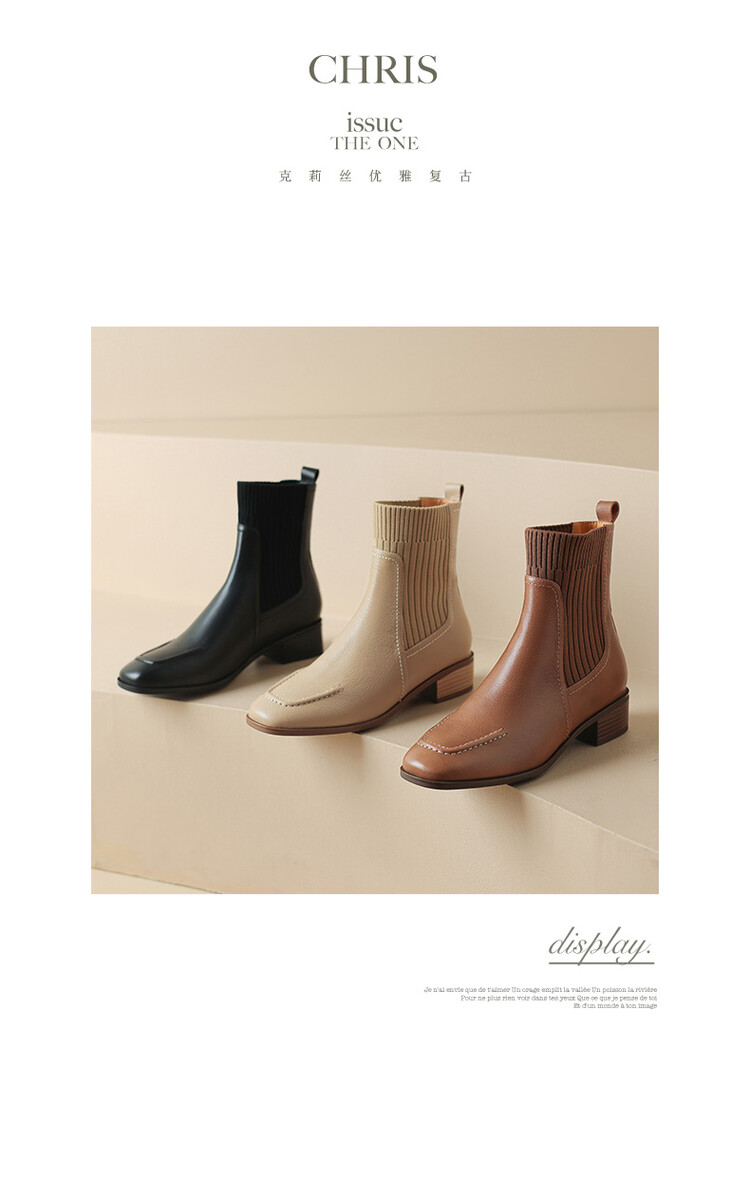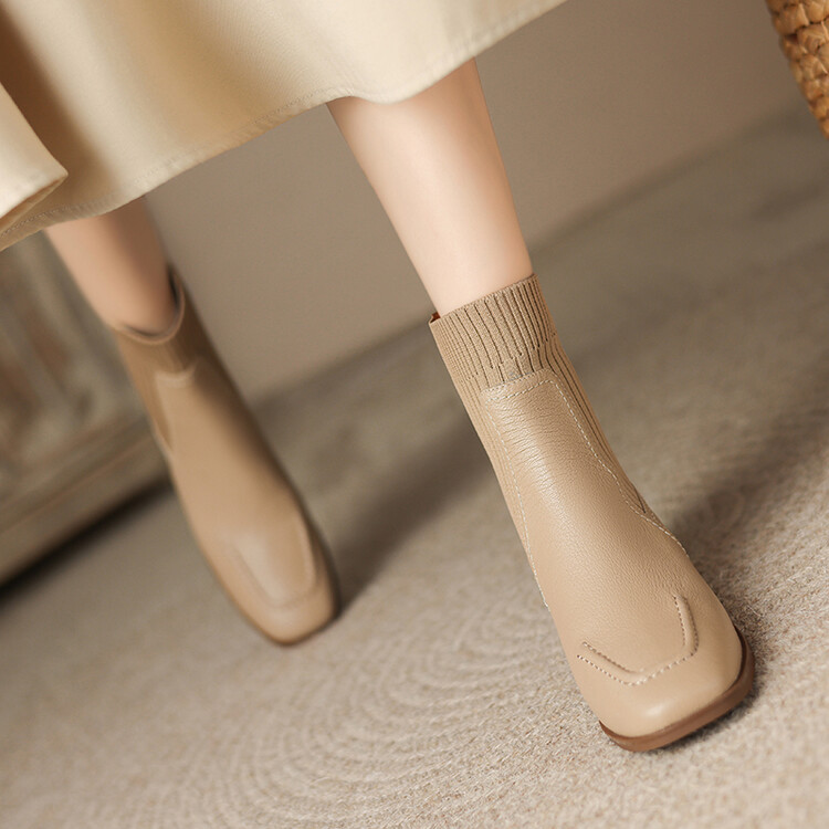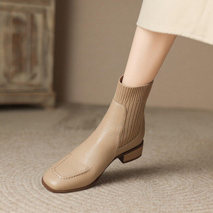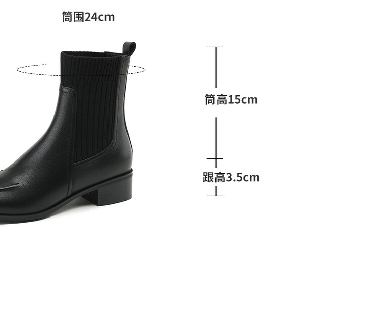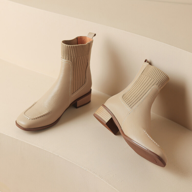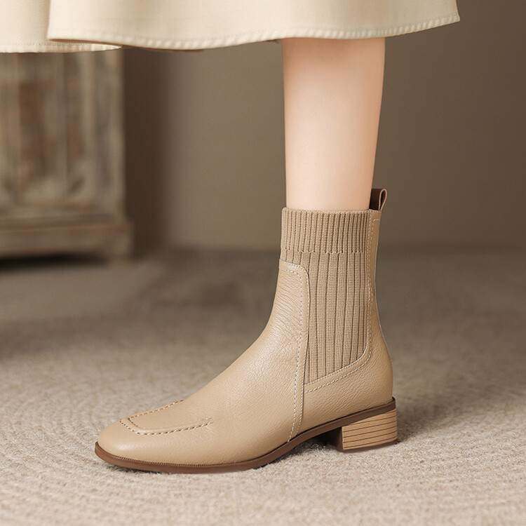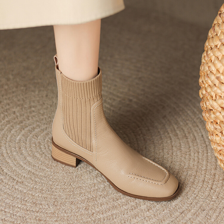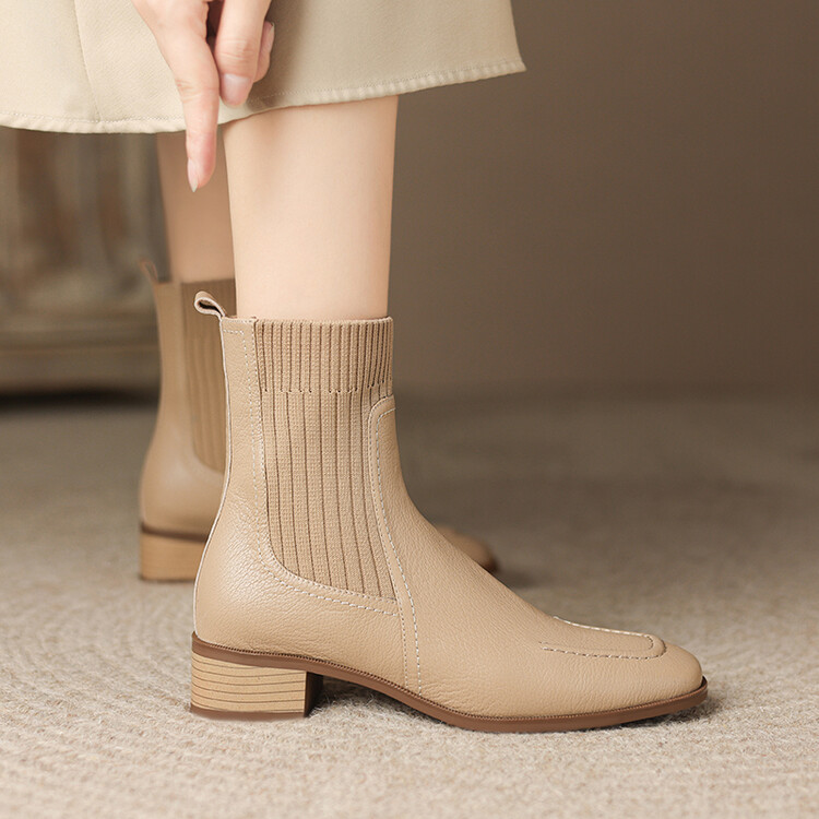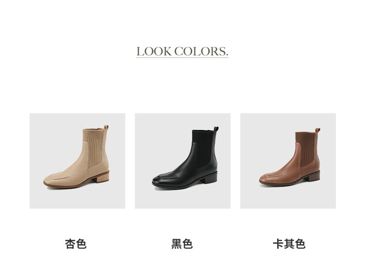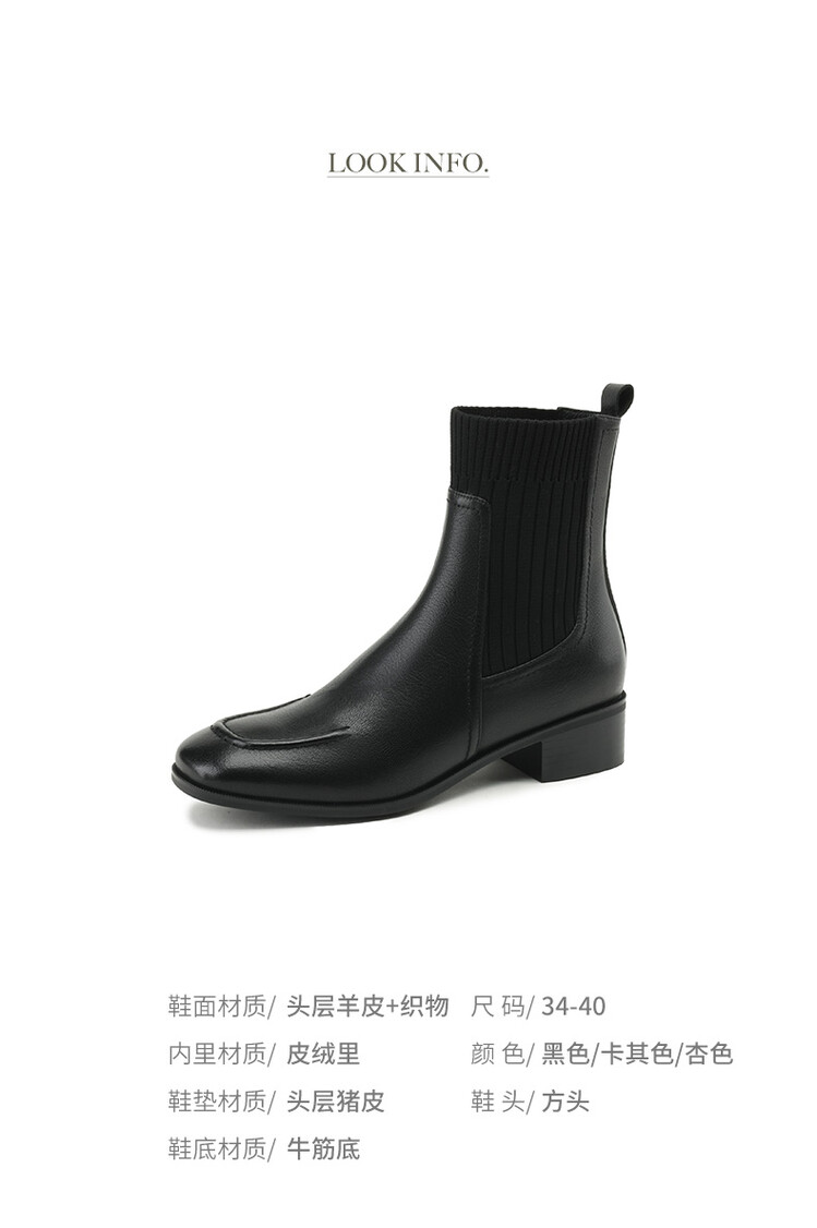 【预售5天】法式弹力袜靴女粗跟气质针织方头短靴新款拼接杏色中跟靴子DPJ&9671