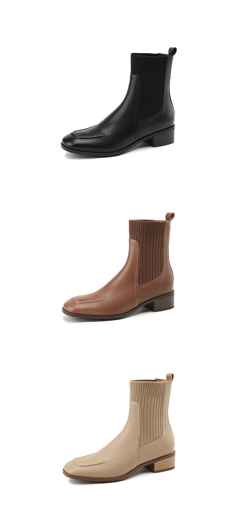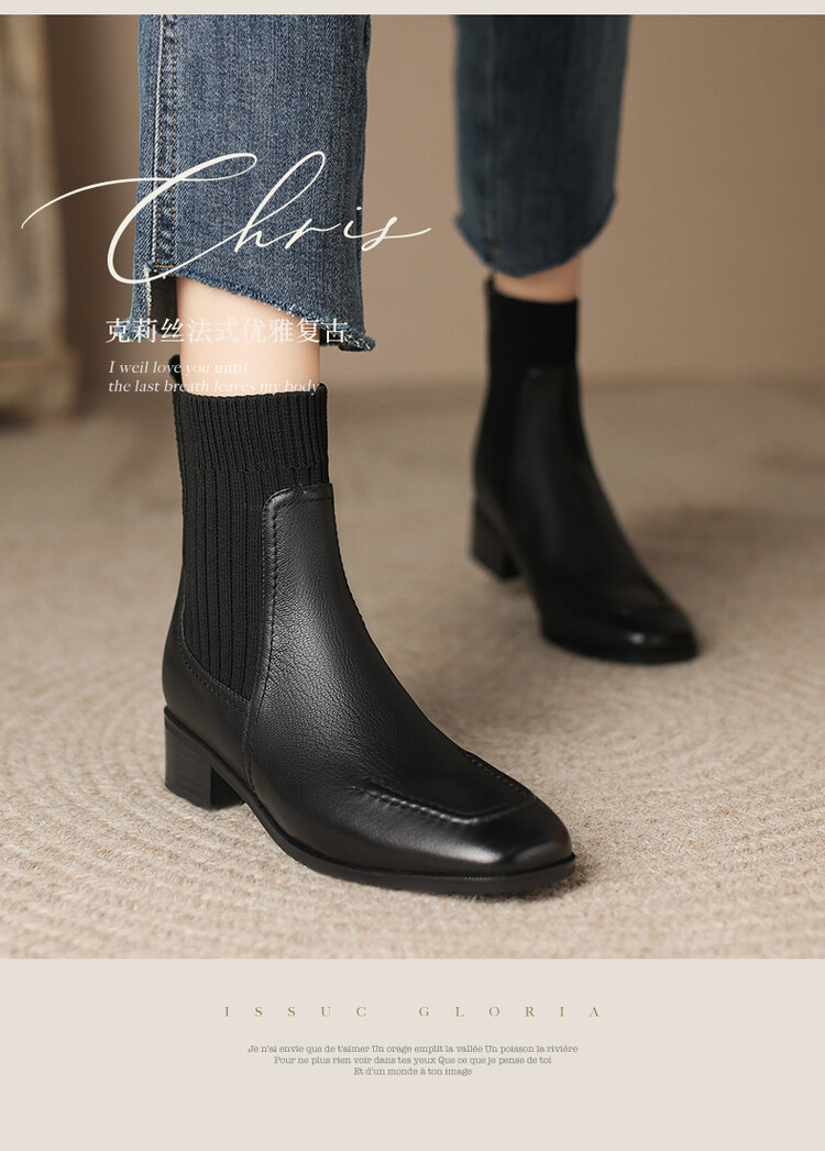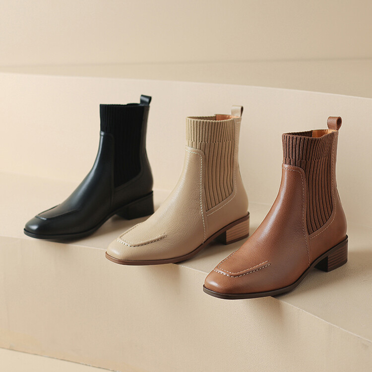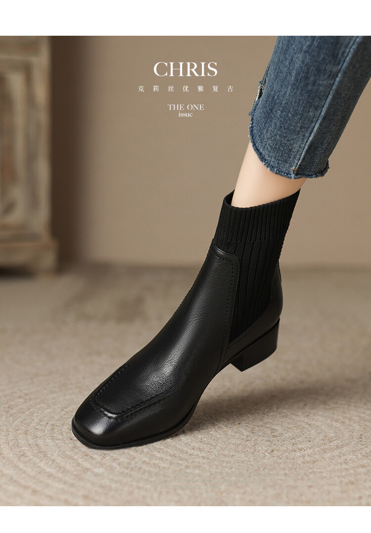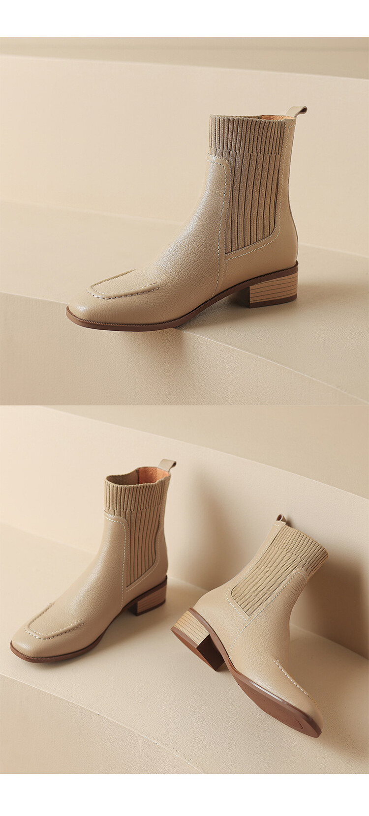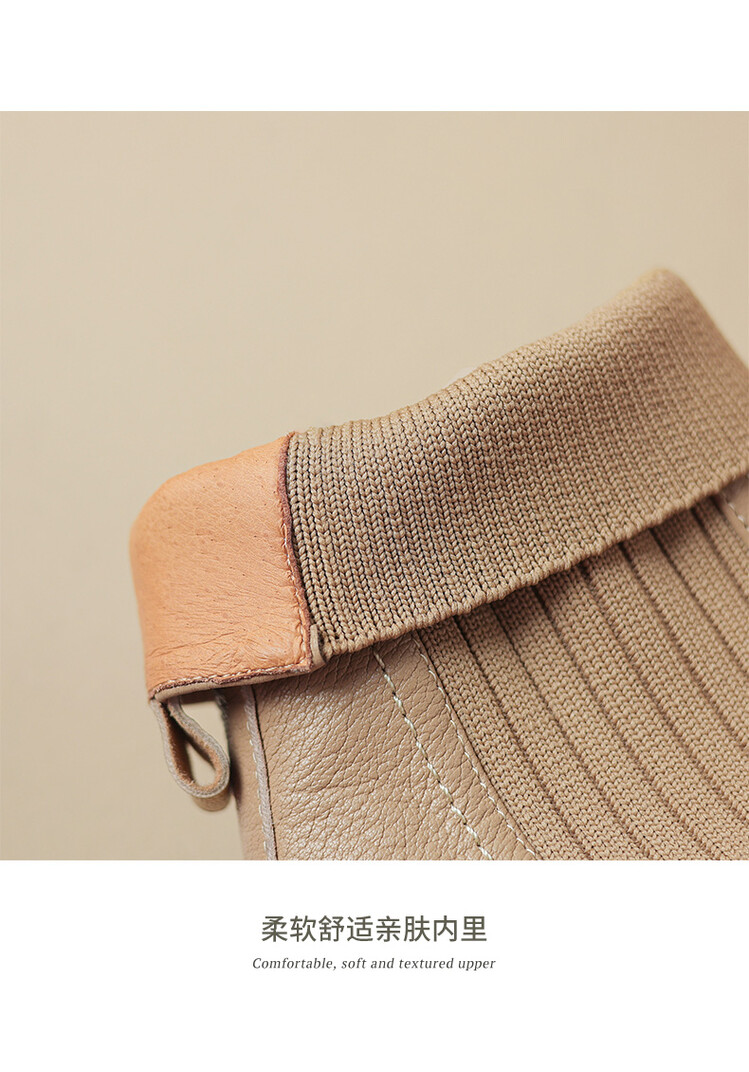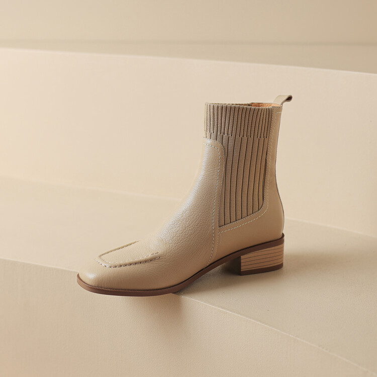 【预售5天】法式弹力袜靴女粗跟气质针织方头短靴新款拼接杏色中跟靴子DPJ&9671