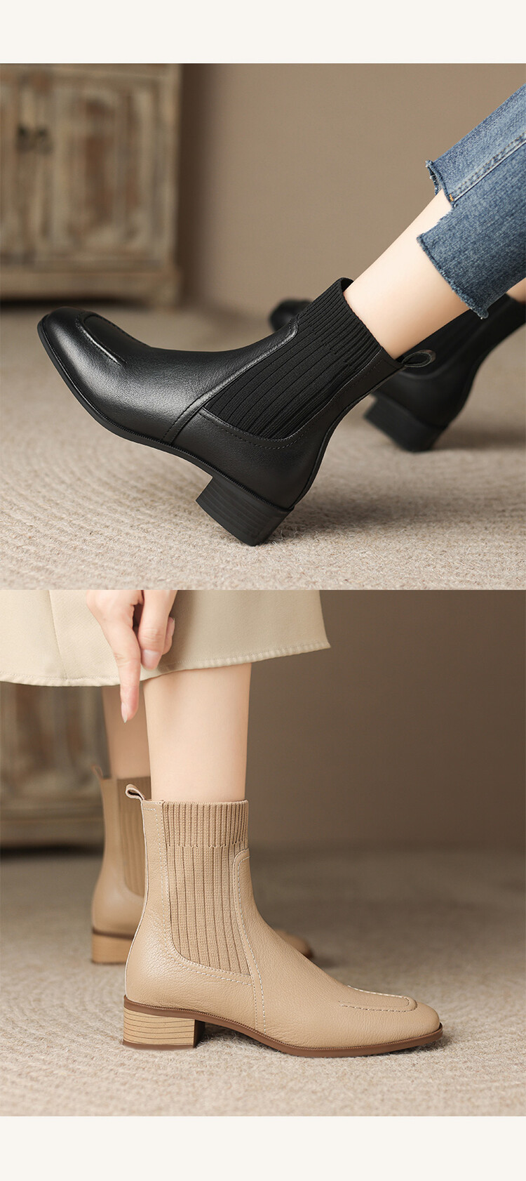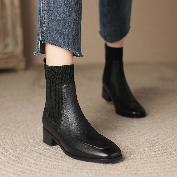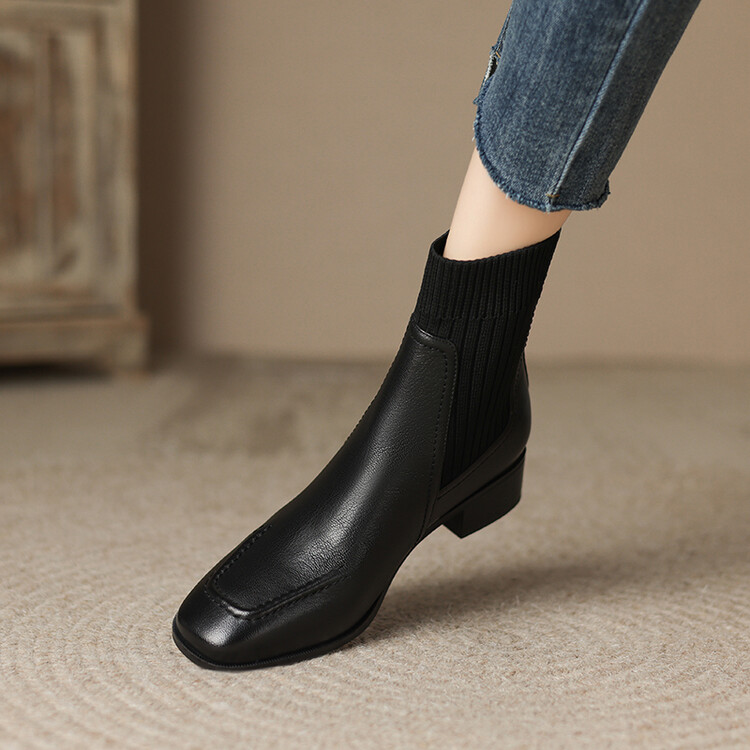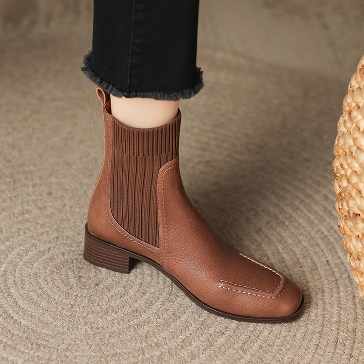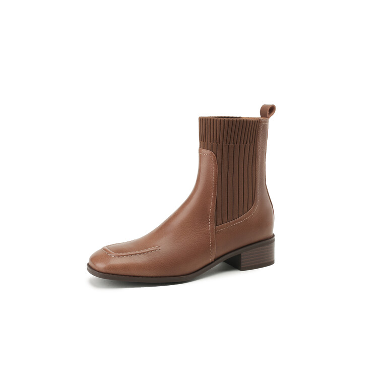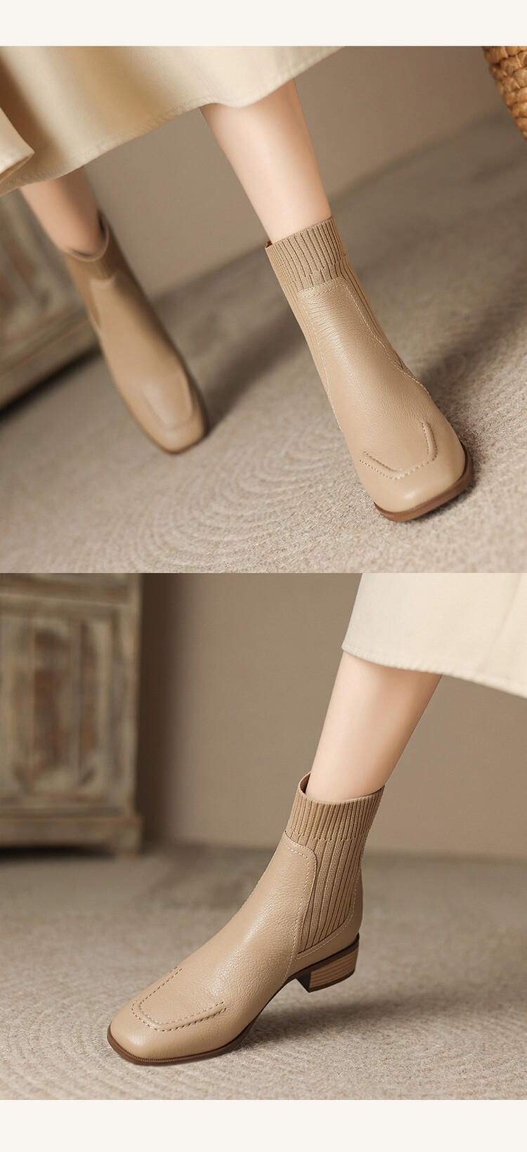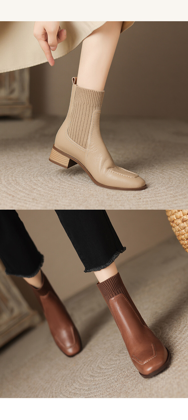 【预售5天】法式弹力袜靴女粗跟气质针织方头短靴新款拼接杏色中跟靴子DPJ&9671