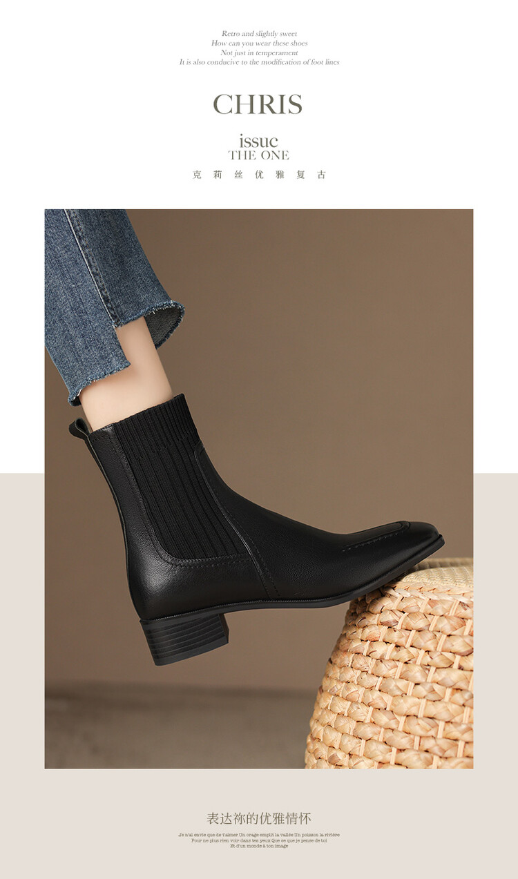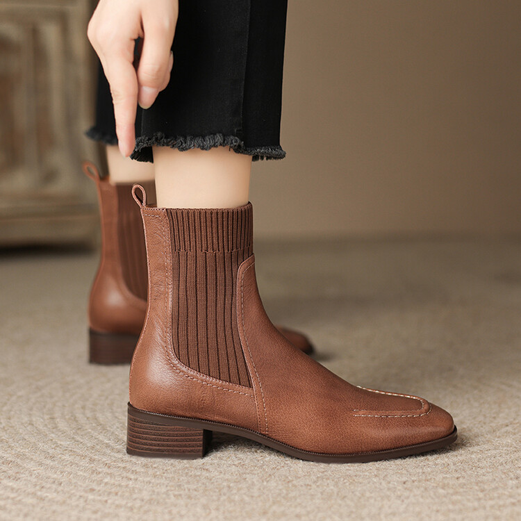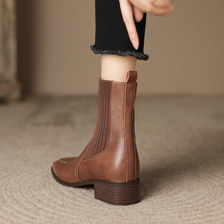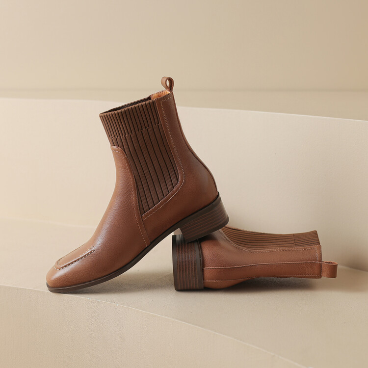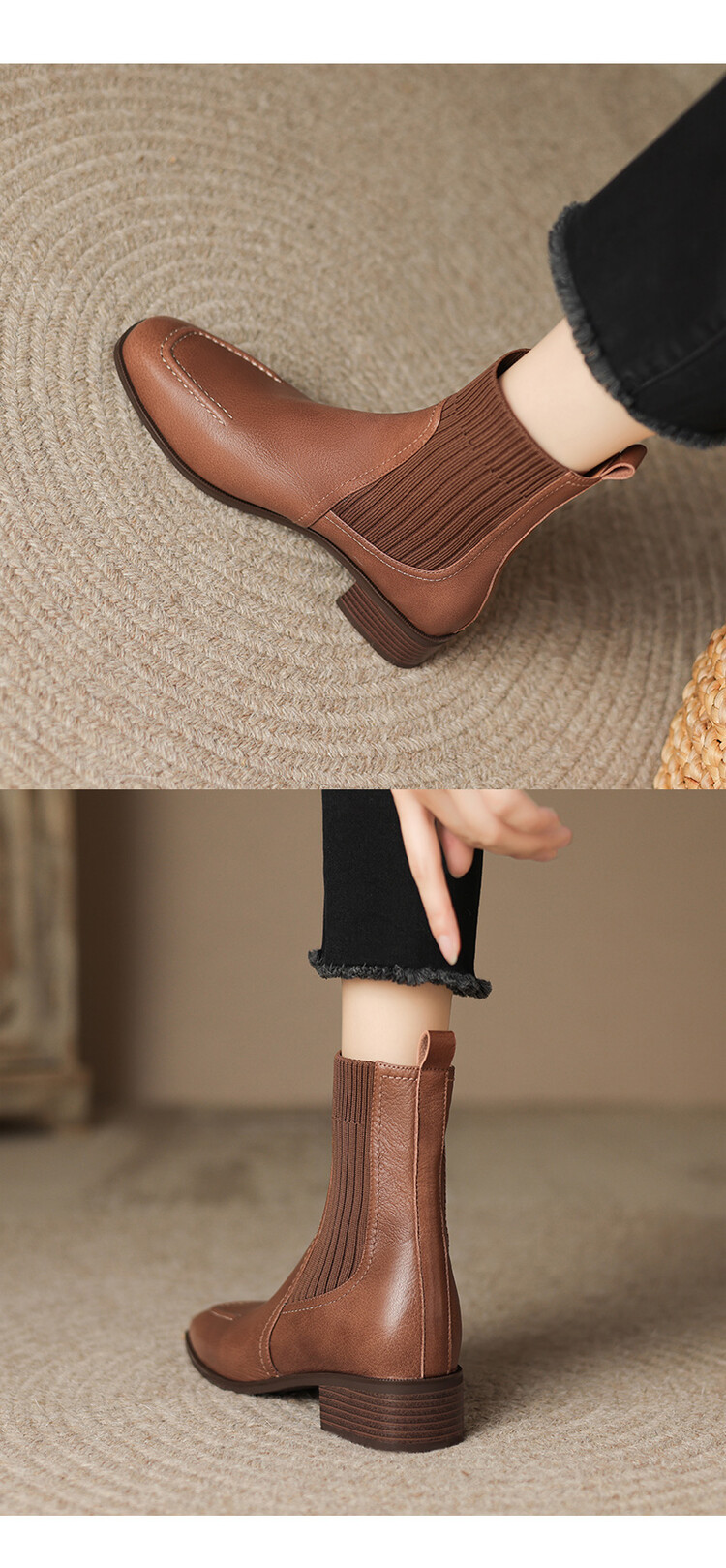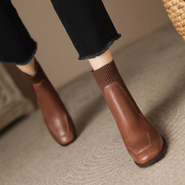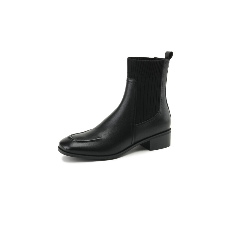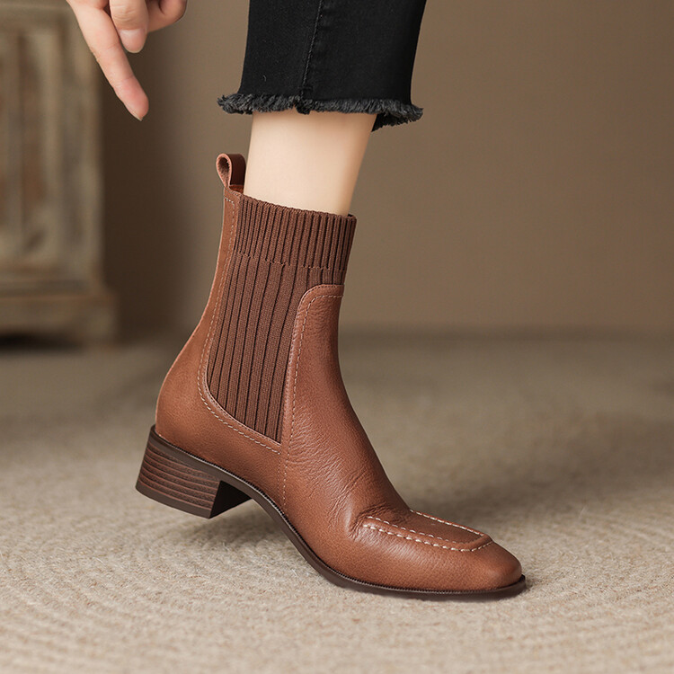 【预售5天】法式弹力袜靴女粗跟气质针织方头短靴新款拼接杏色中跟靴子DPJ&9671