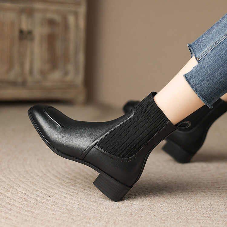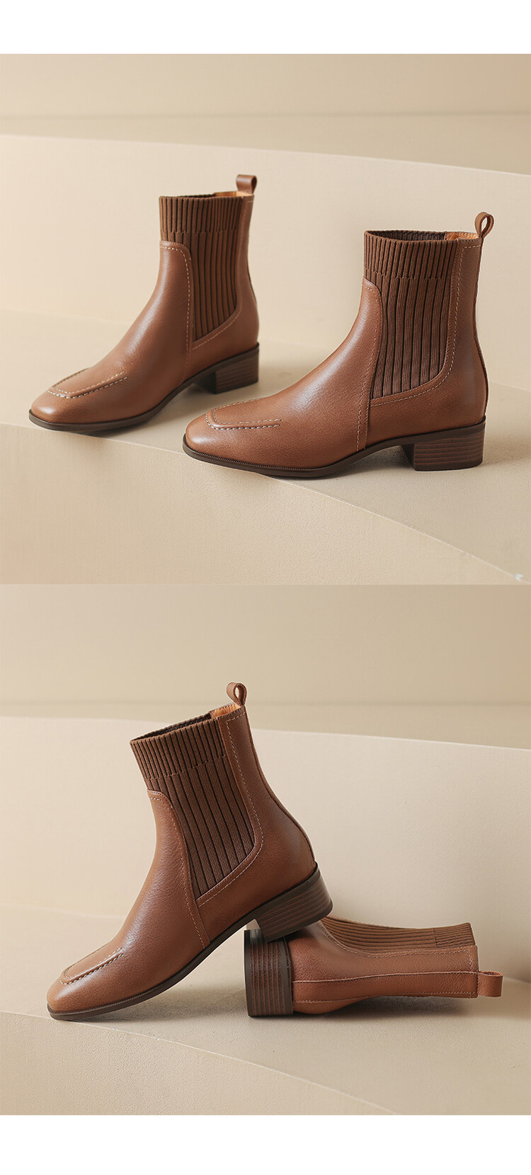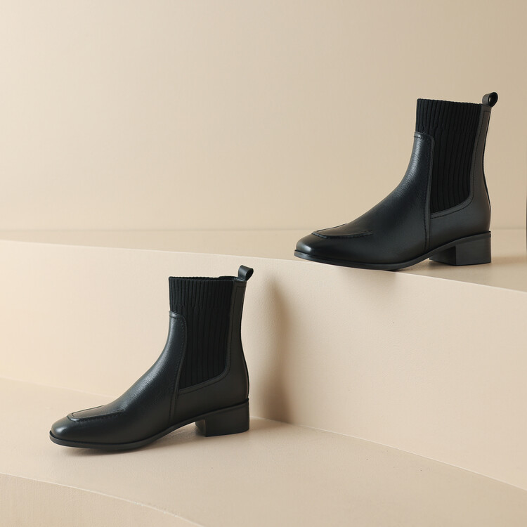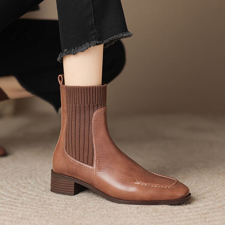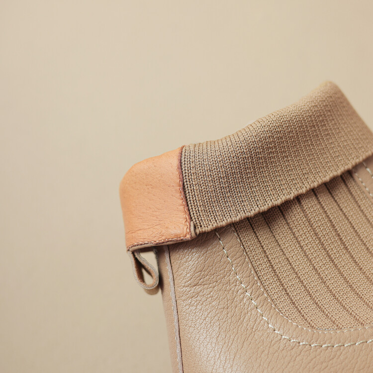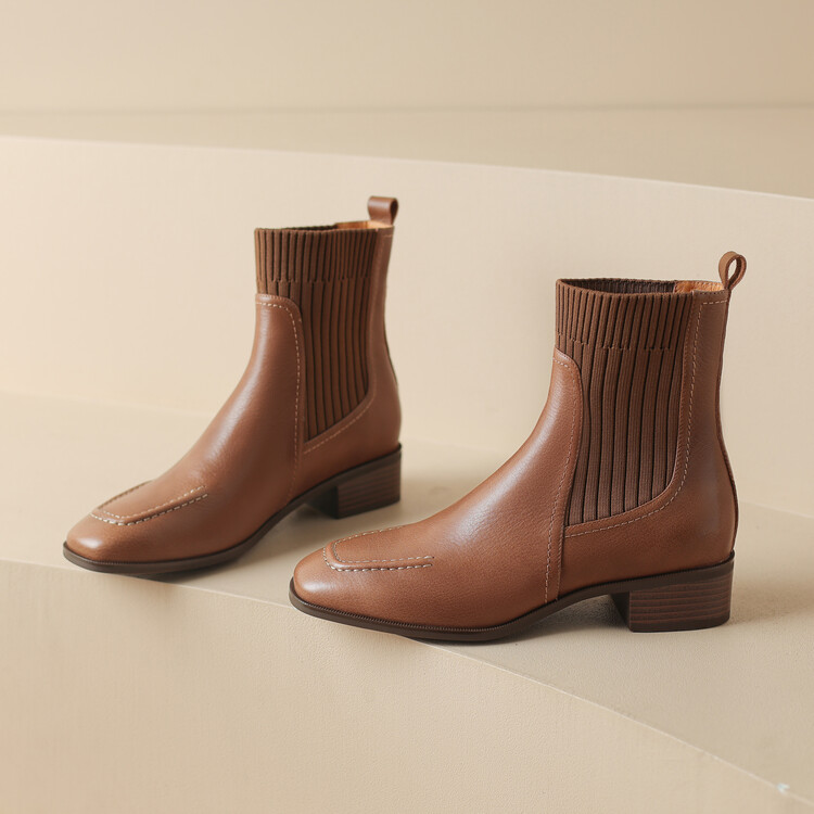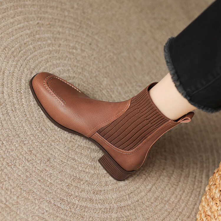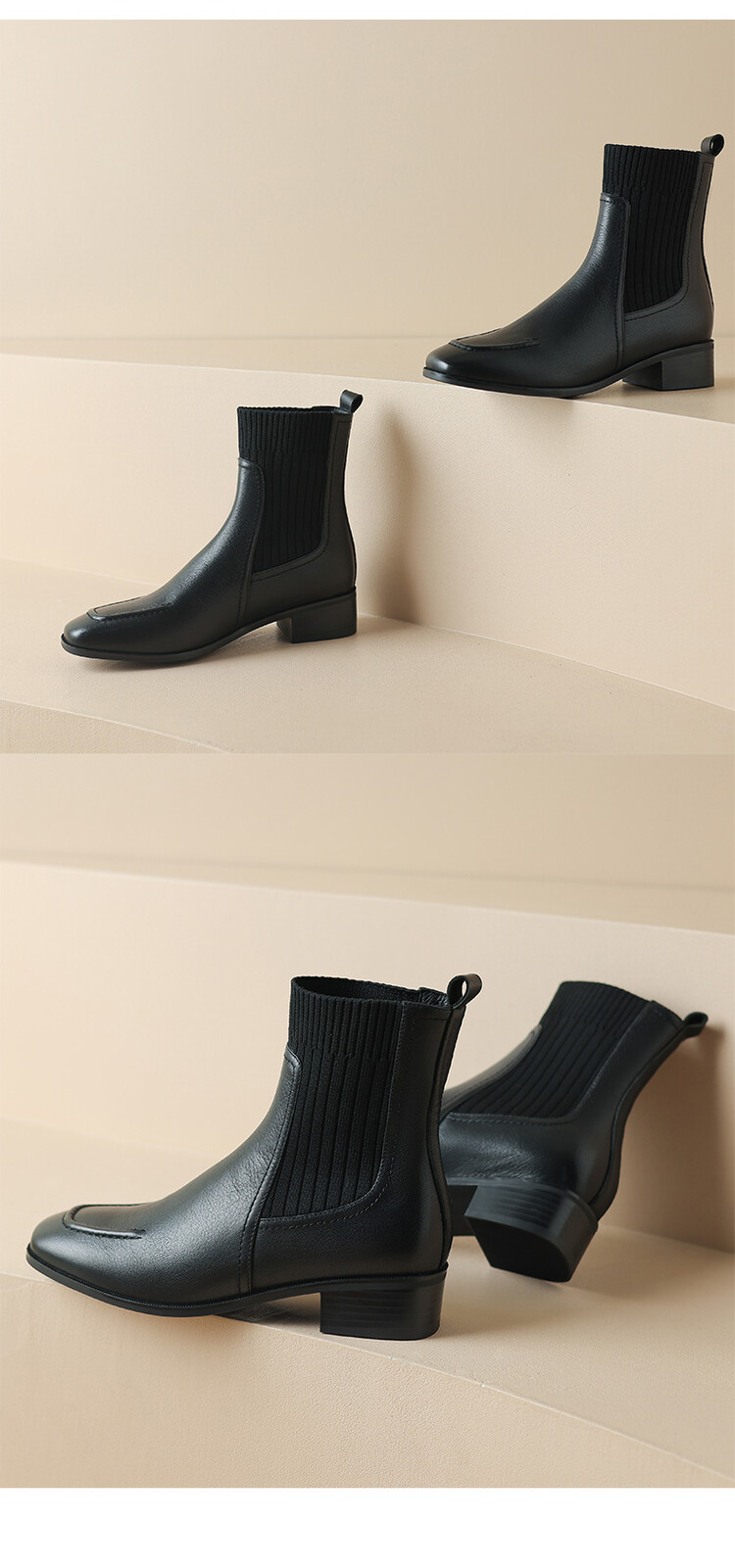 【预售5天】法式弹力袜靴女粗跟气质针织方头短靴新款拼接杏色中跟靴子DPJ&9671