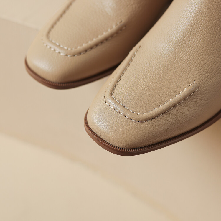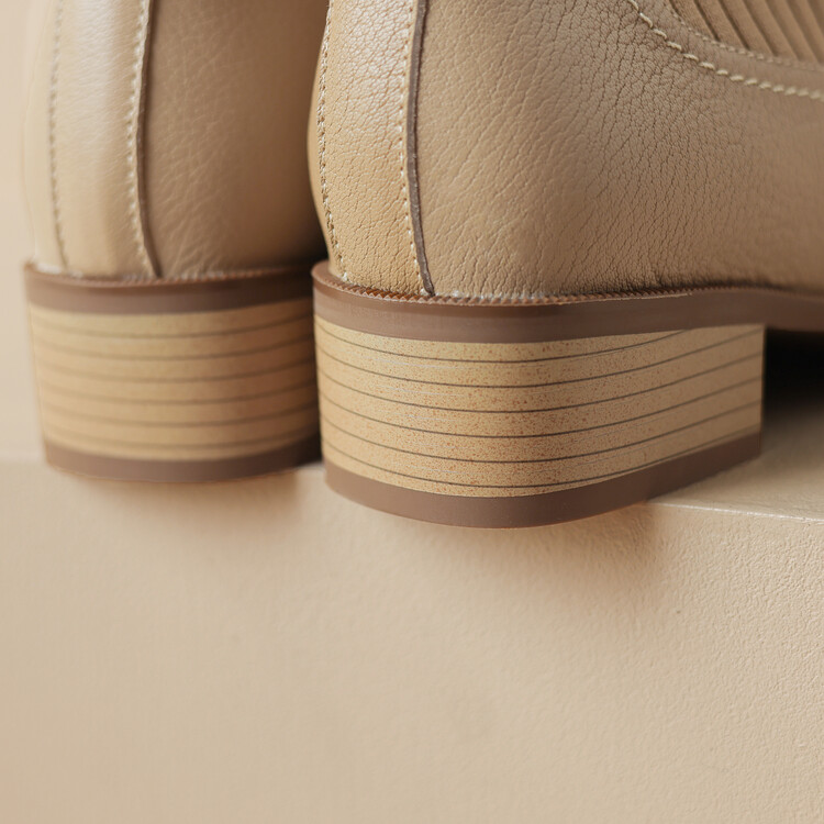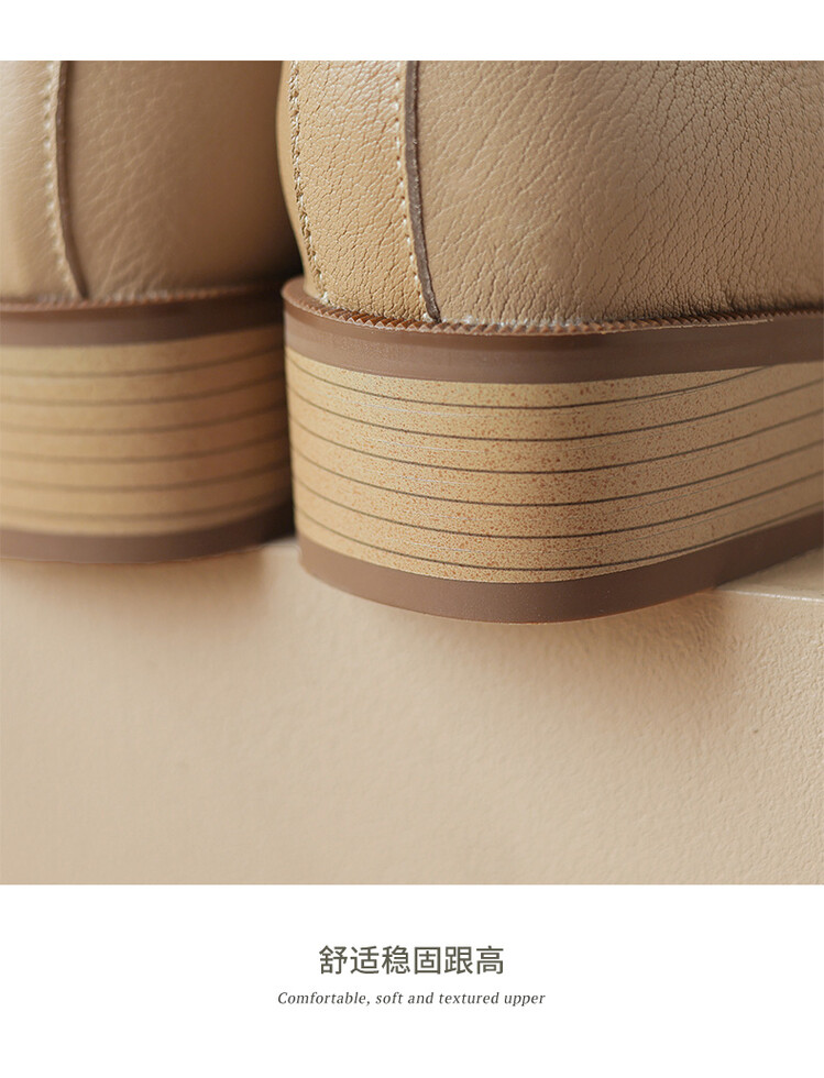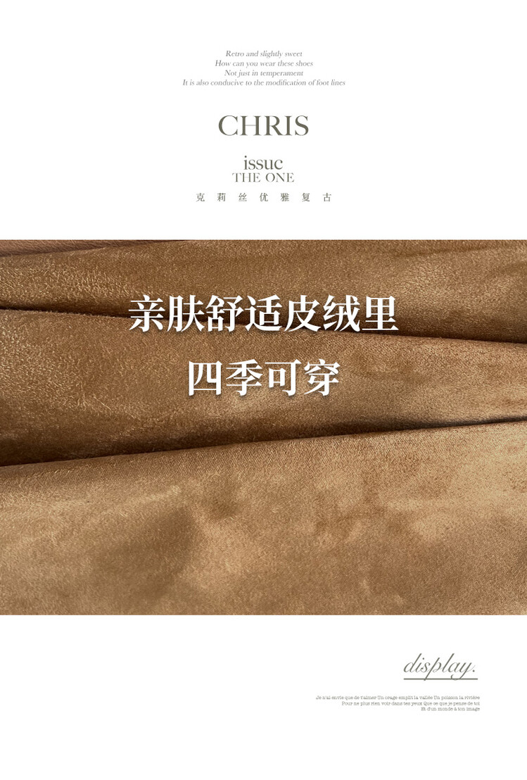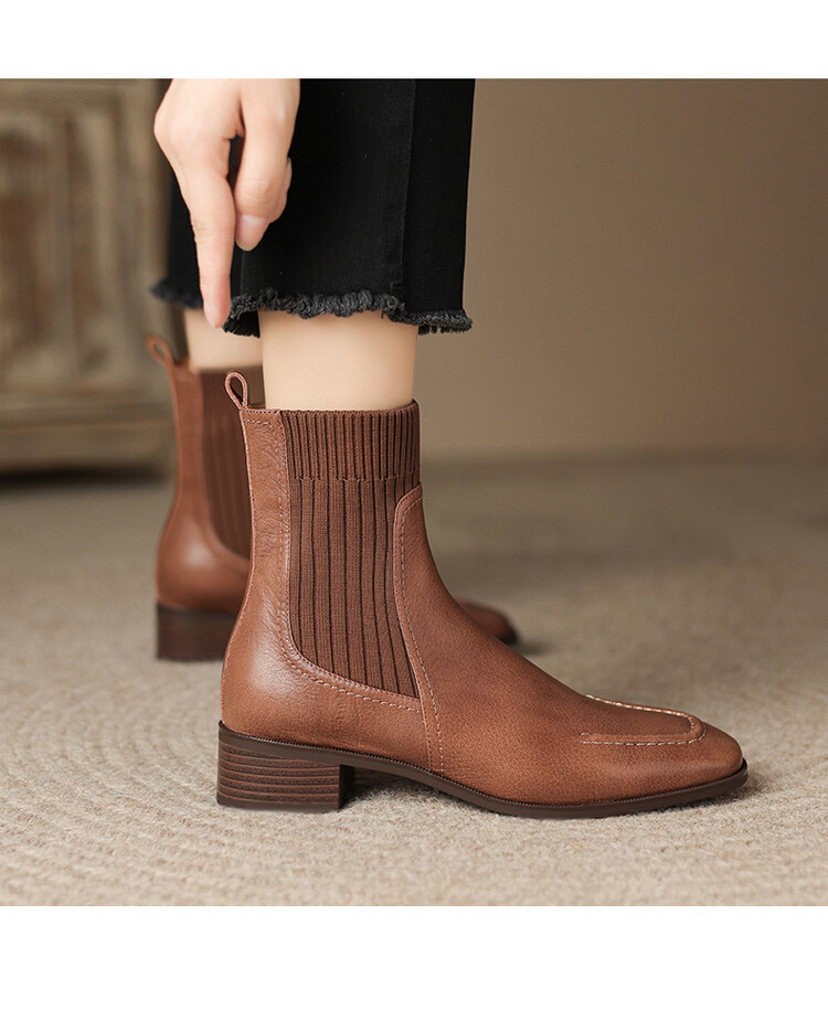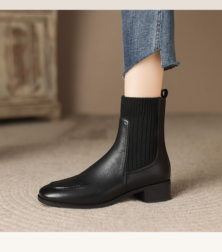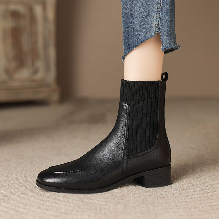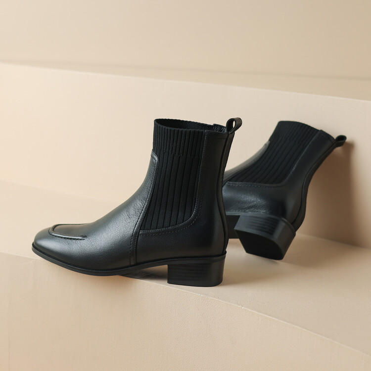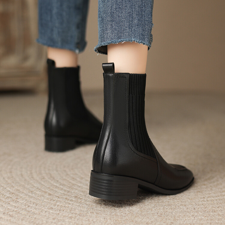【预售5天】法式弹力袜靴女粗跟气质针织方头短靴新款拼接杏色中跟靴子DPJ&9671