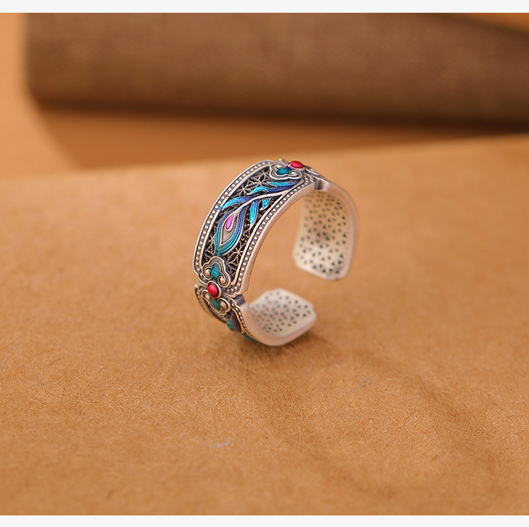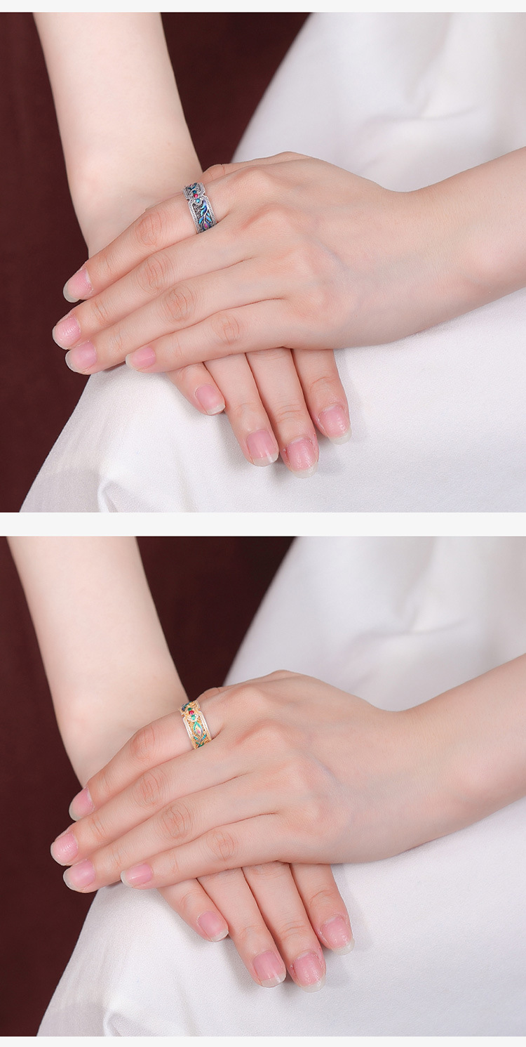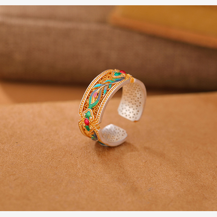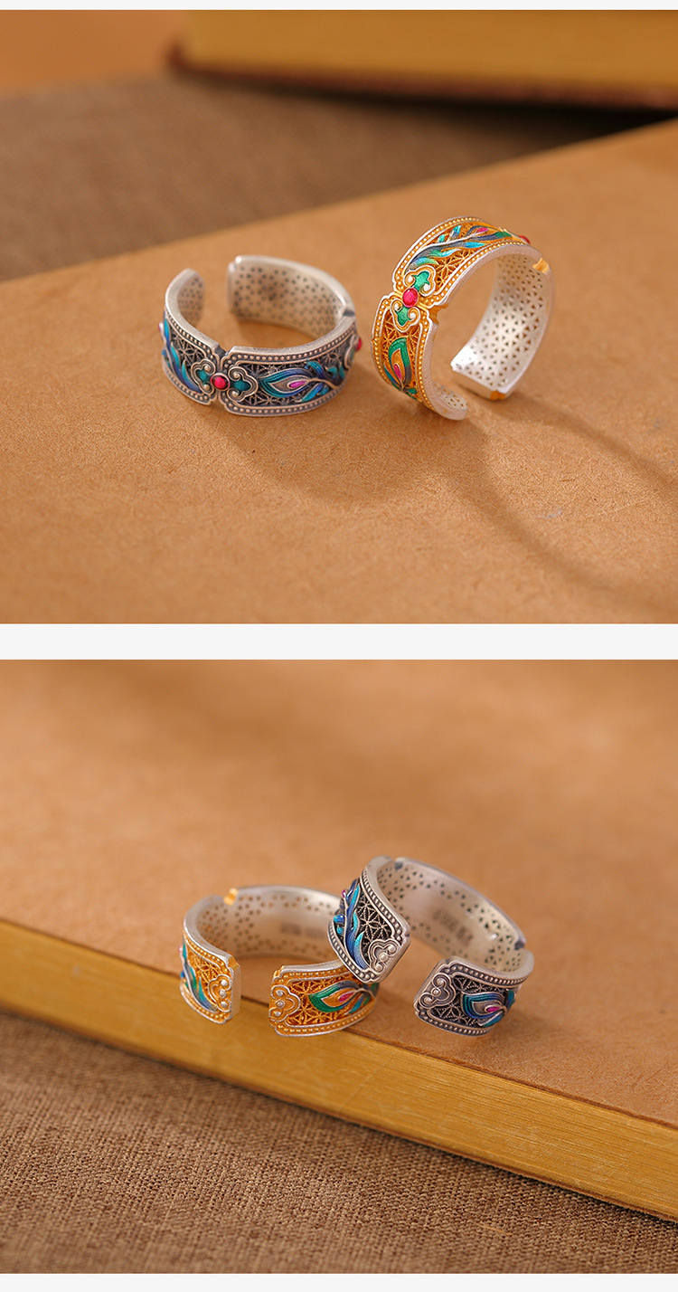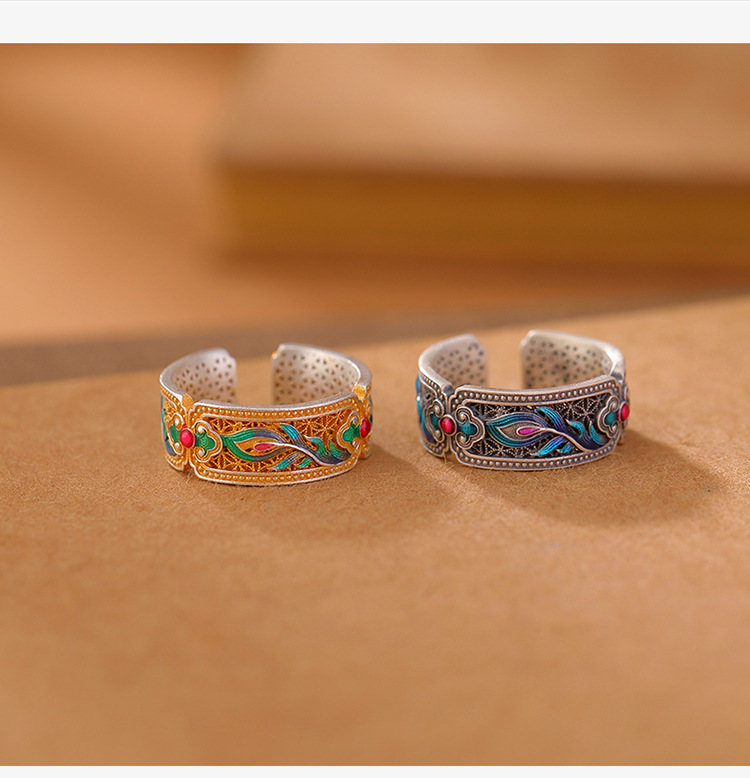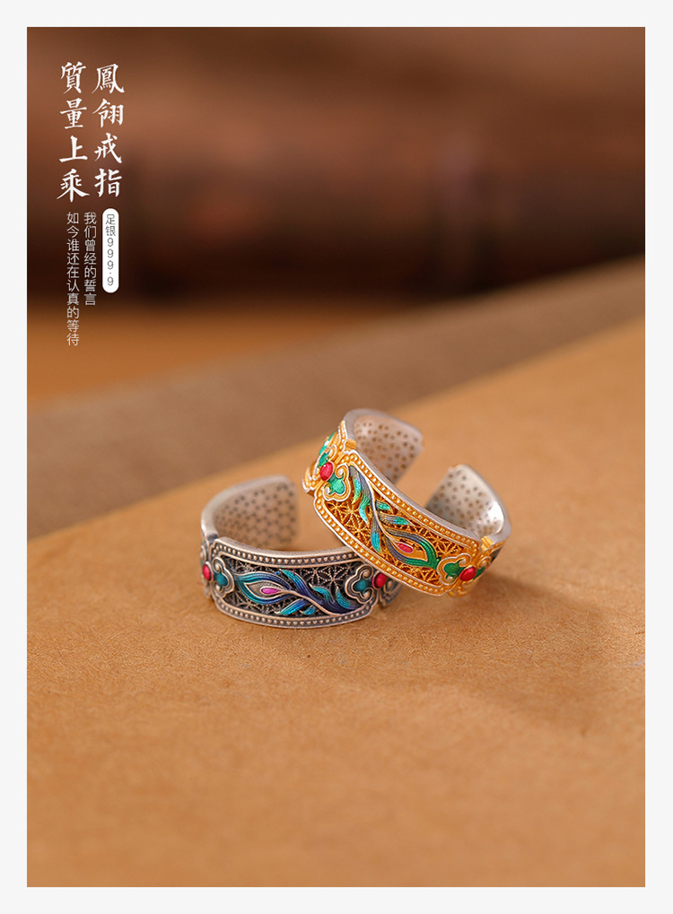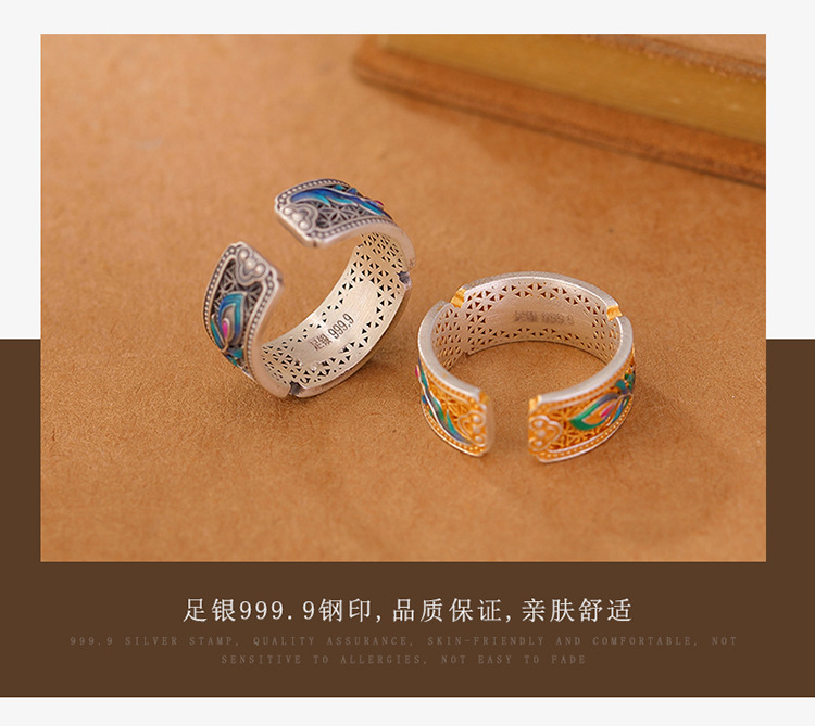 S999.9足银镀金复古国潮珐琅,吉祥如意羽毛镂空戒指国风指环CW-JZ06745