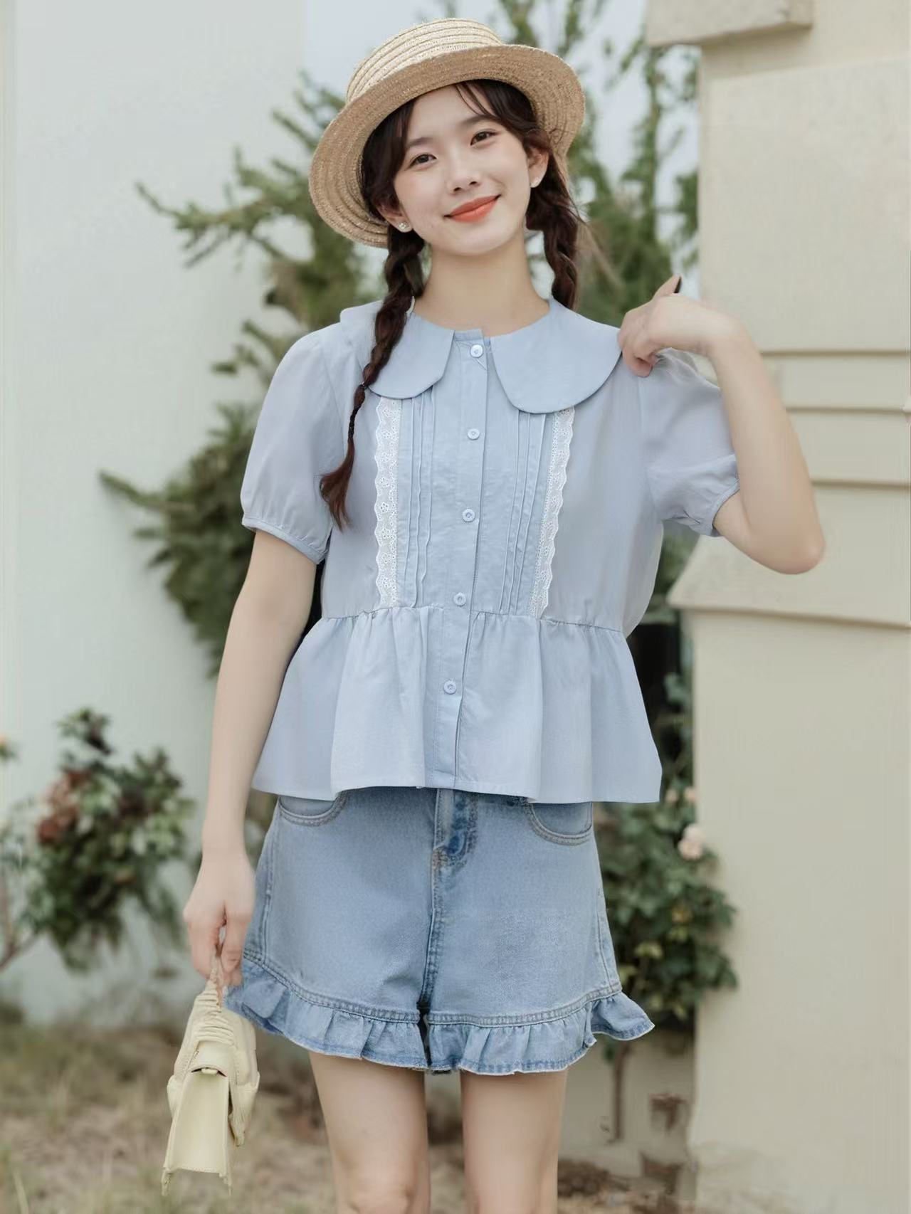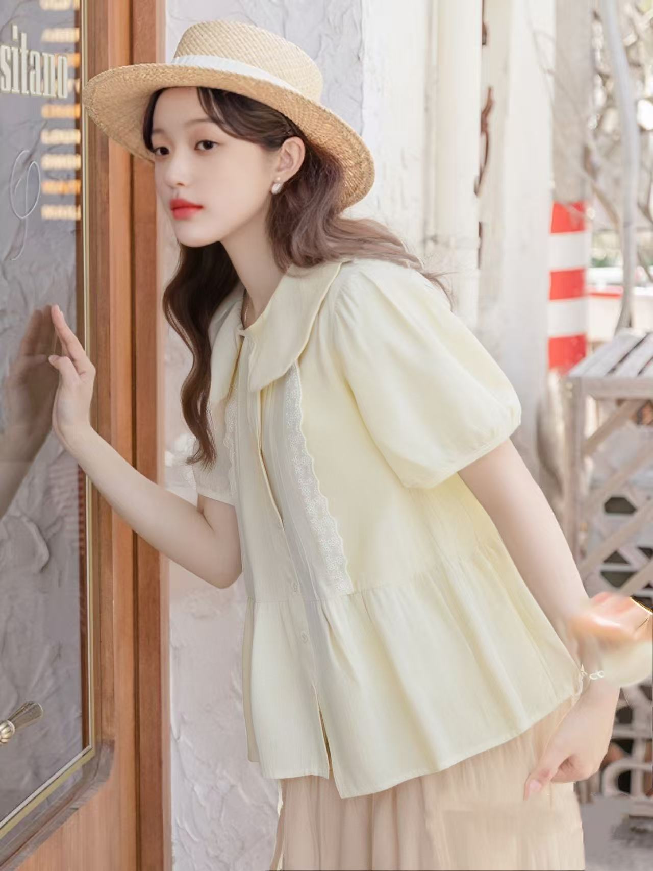 夏季最后清仓【韩系小衫】棉25068娃娃领拼蕾丝短袖小衫-喜出
