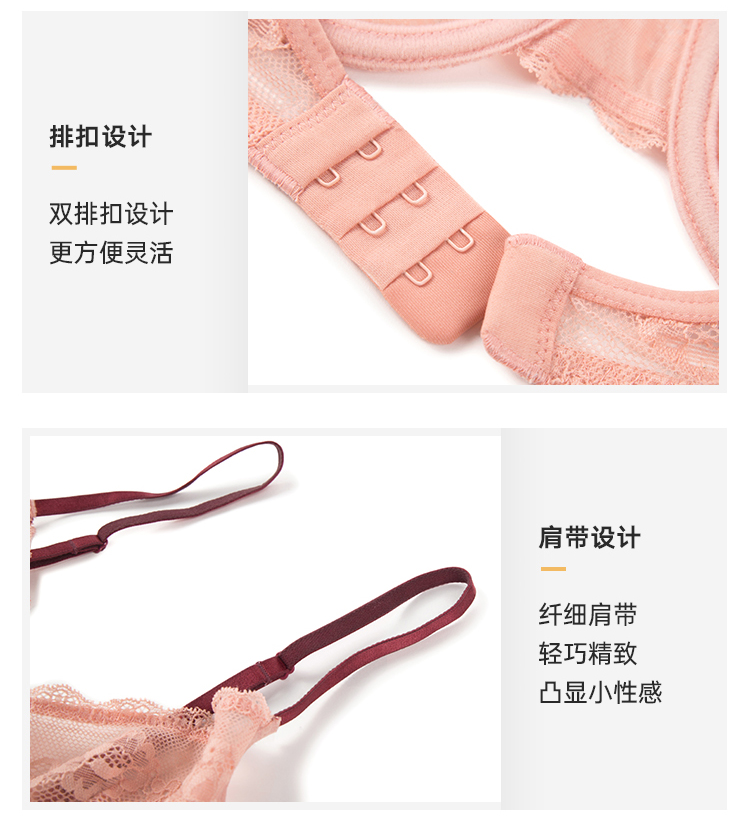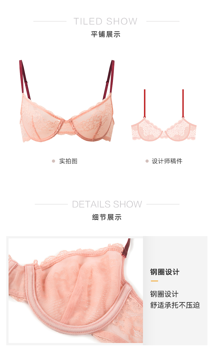 弗利少女法式蕾丝文胸钢圈小胸少女内衣超薄性感鲑鱼粉胸罩3/4杯