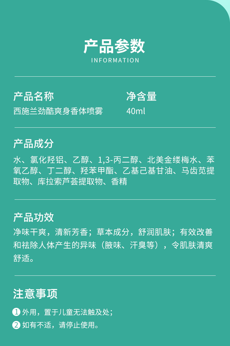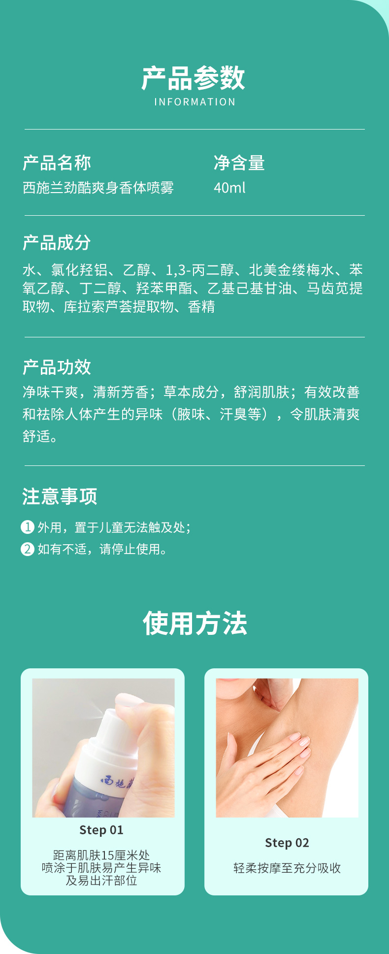 西施兰劲酷爽身香体喷雾40ml止汗露改善异味狐味汗味