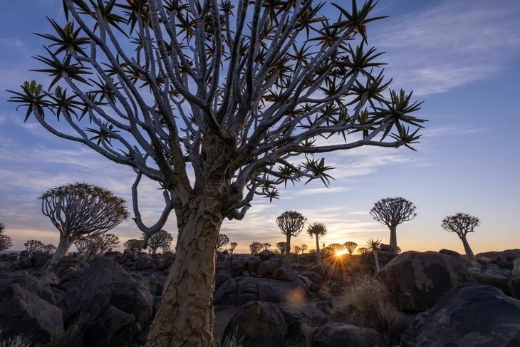清晨拍摄沙漠日出,前往箭袋树庄园,这个城市的意思为上帝的希望,下午抵达后拍摄箭袋树林日落。晚上拍摄星河。