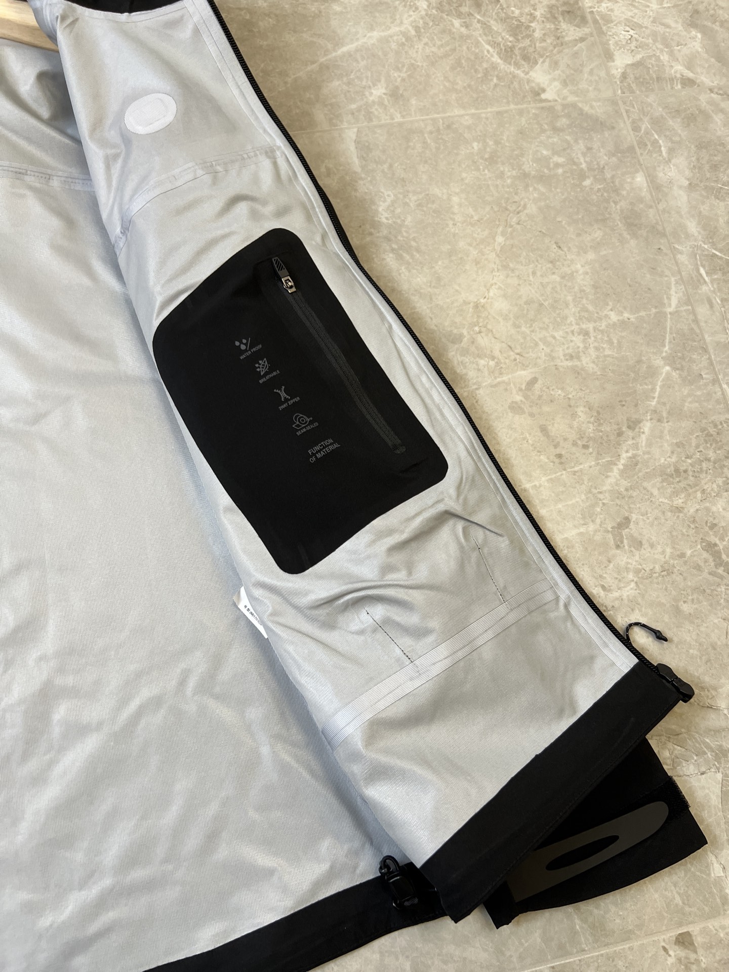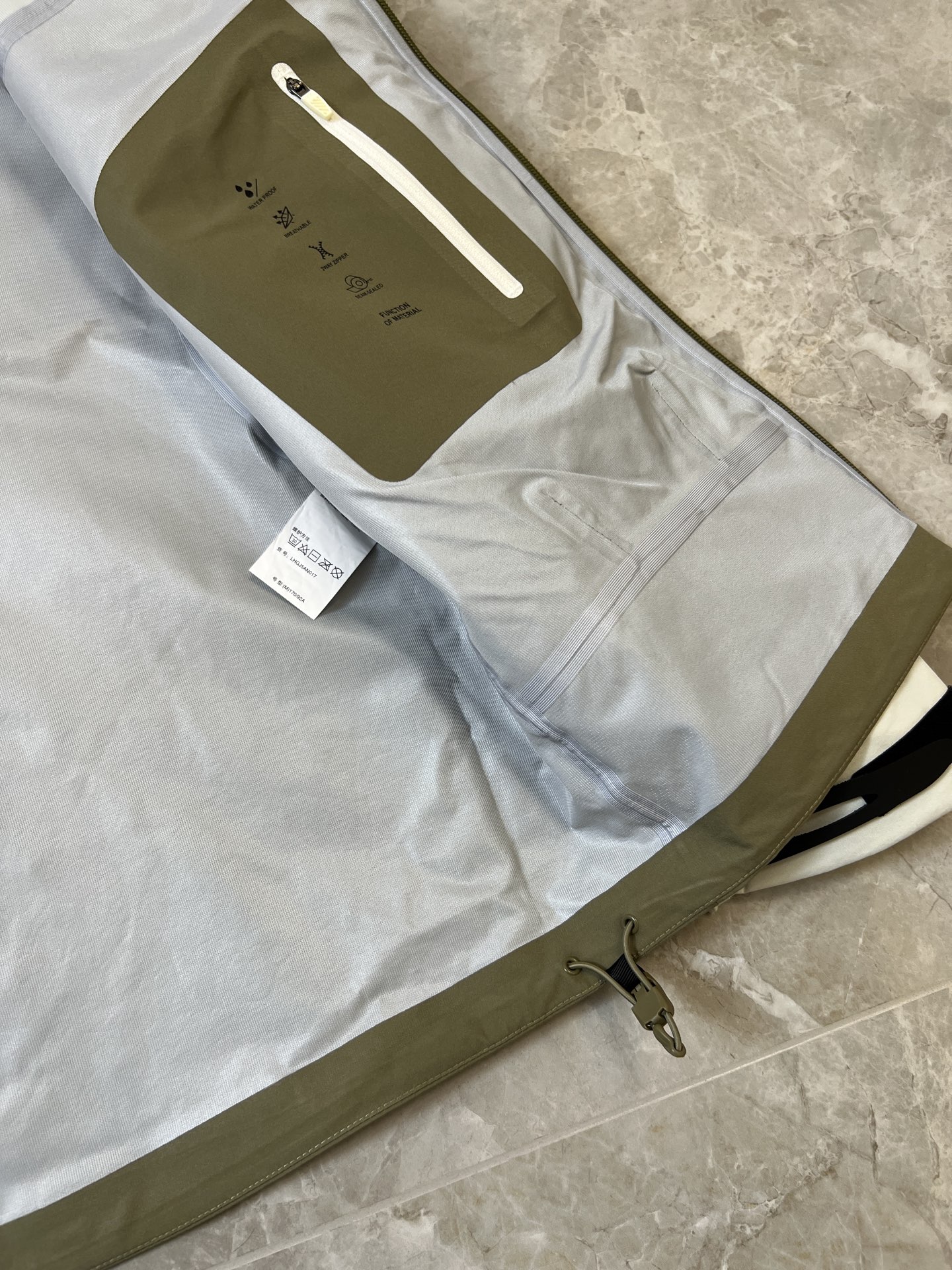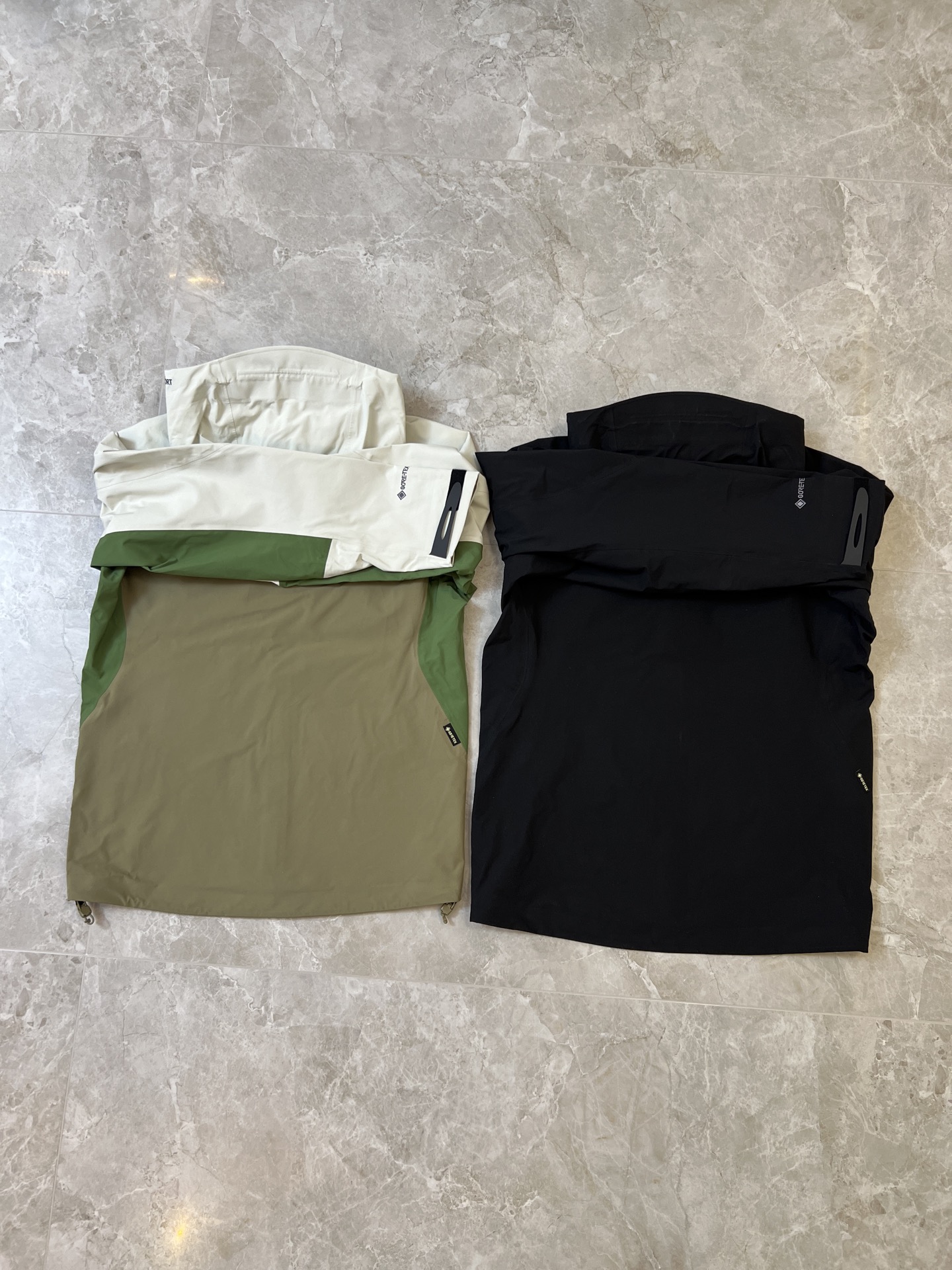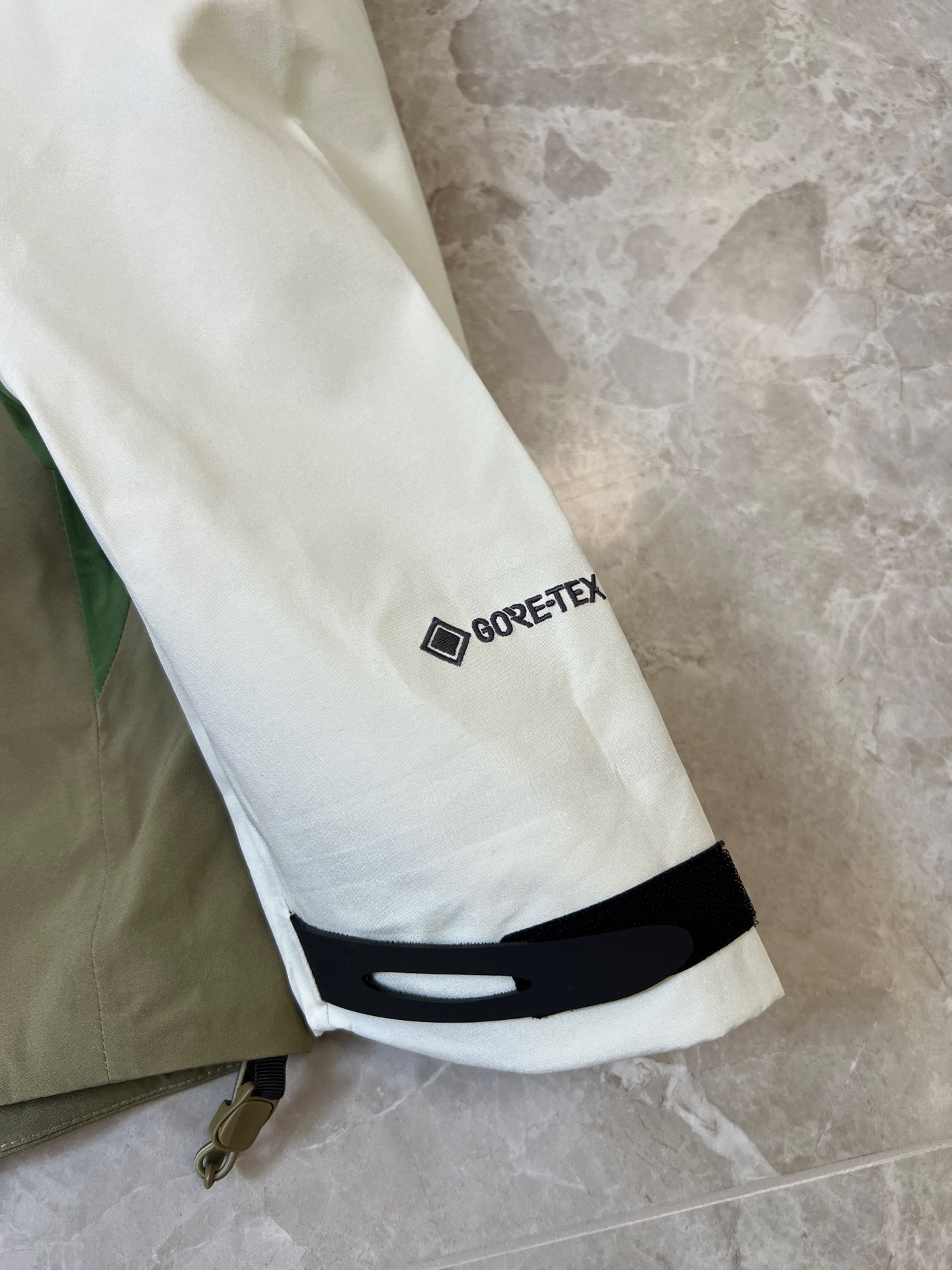 大身采用70D锦纶的GORE-TEX 3L Tricot面料,具备防水、透湿、防风及耐磨的功能内里缝份全压胶处理,结合重点部位补强加固及全YKK轻量防水拉链,提升防水功能领口拉链上端配有护嘴,穿脱舒适安全