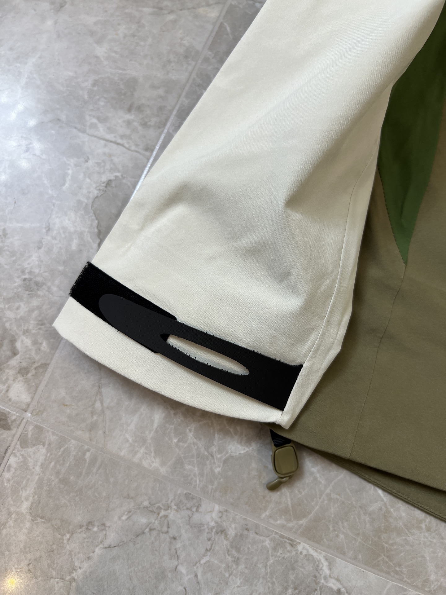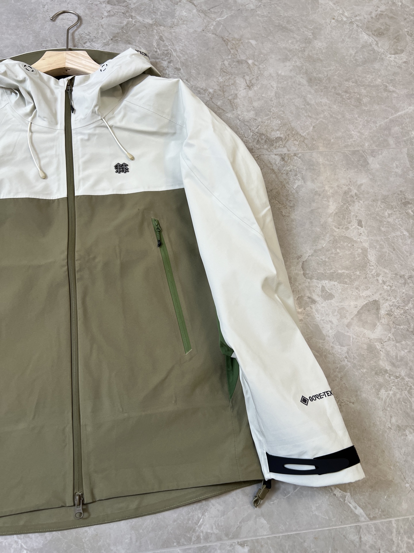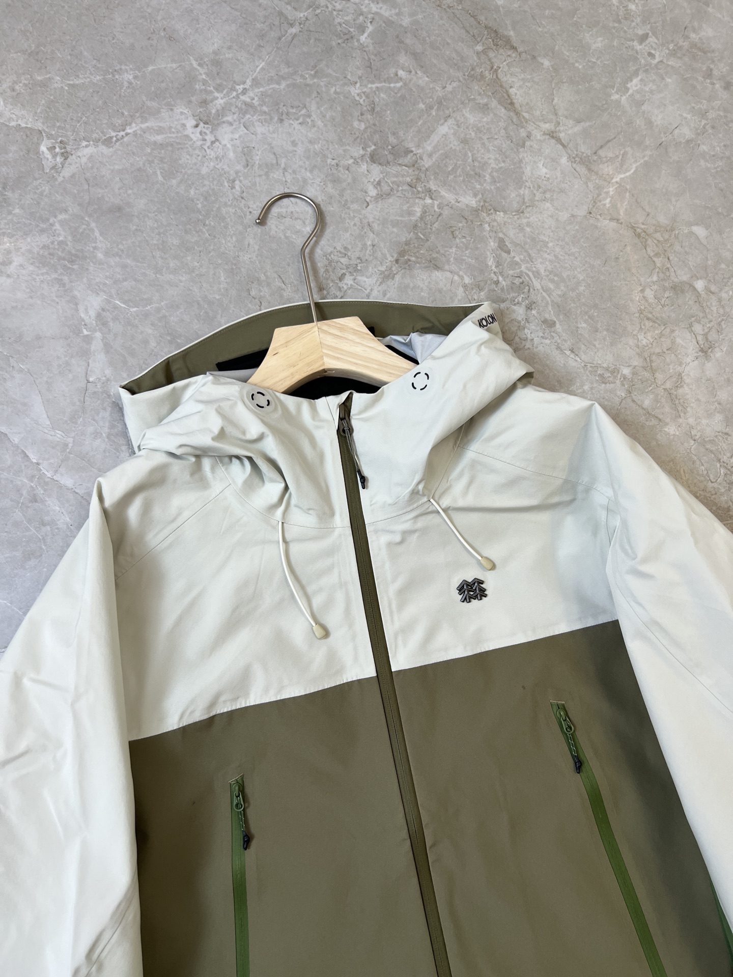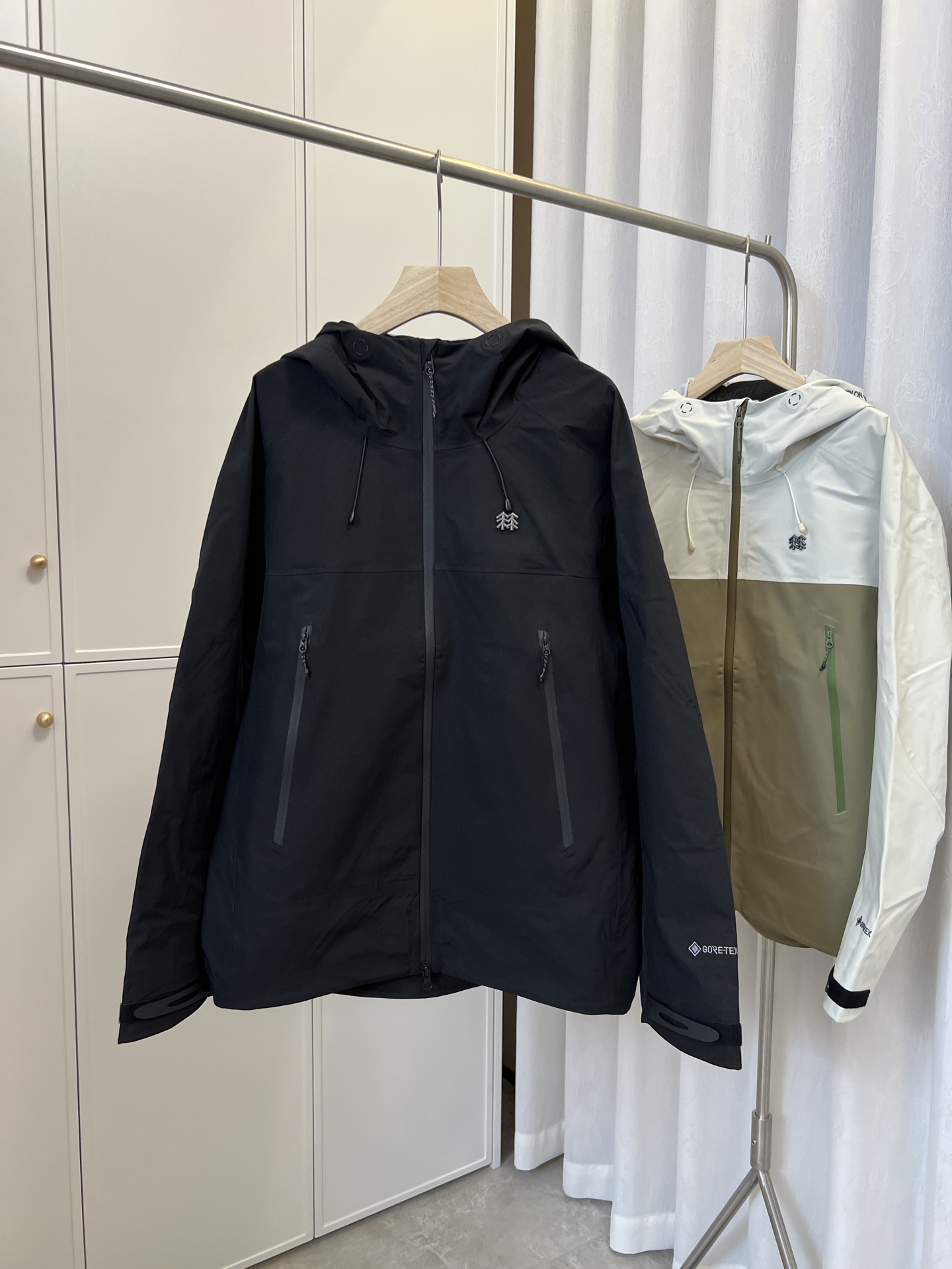 大身采用70D锦纶的GORE-TEX 3L Tricot面料,具备防水、透湿、防风及耐磨的功能内里缝份全压胶处理,结合重点部位补强加固及全YKK轻量防水拉链,提升防水功能领口拉链上端配有护嘴,穿脱舒适安全