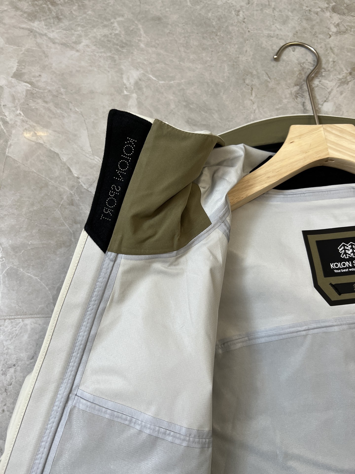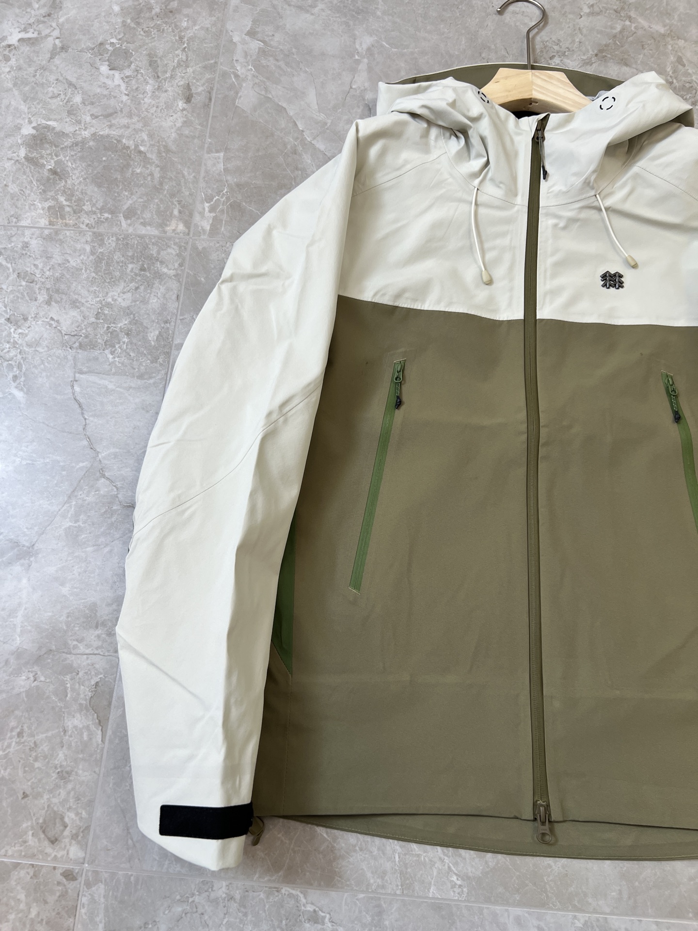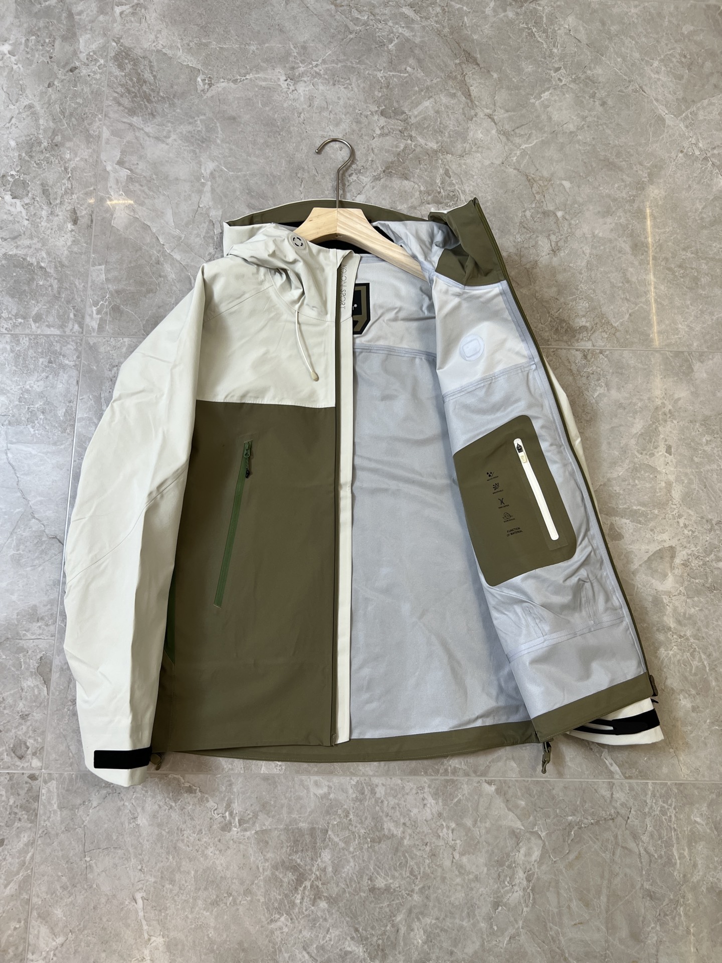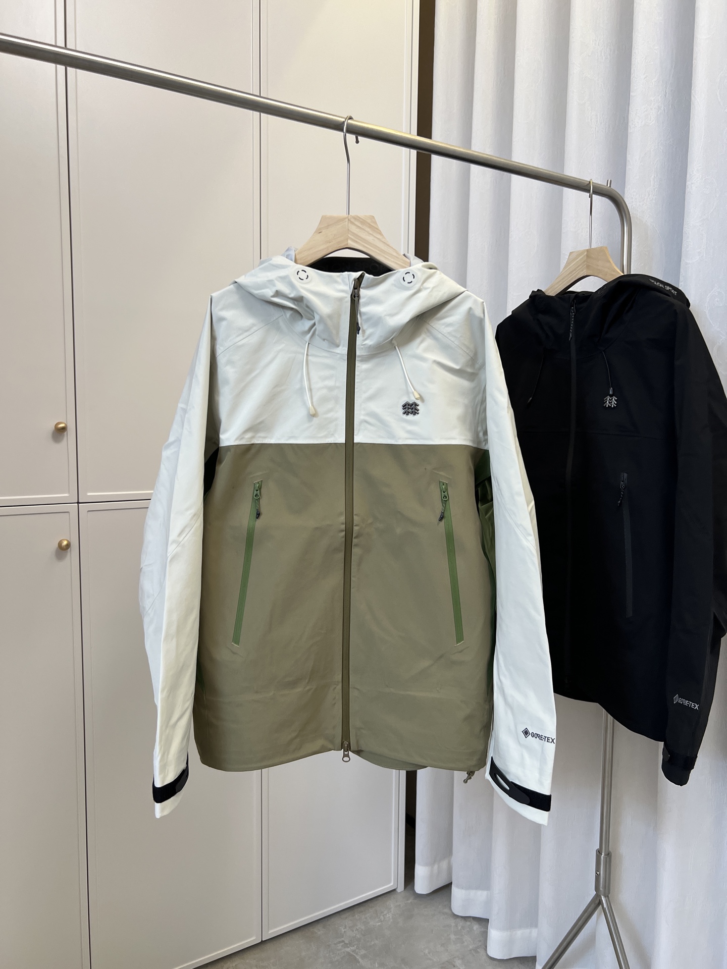 大身采用70D锦纶的GORE-TEX 3L Tricot面料,具备防水、透湿、防风及耐磨的功能内里缝份全压胶处理,结合重点部位补强加固及全YKK轻量防水拉链,提升防水功能领口拉链上端配有护嘴,穿脱舒适安全