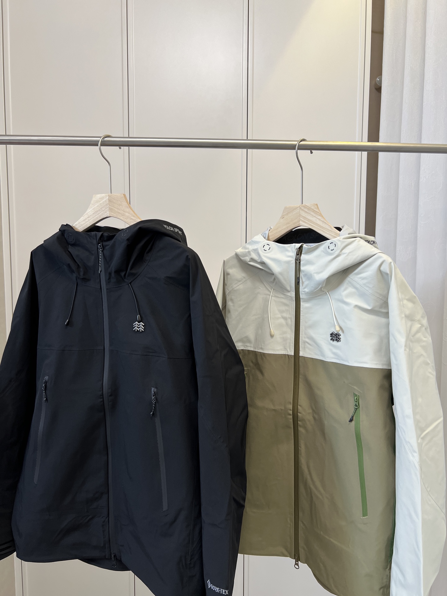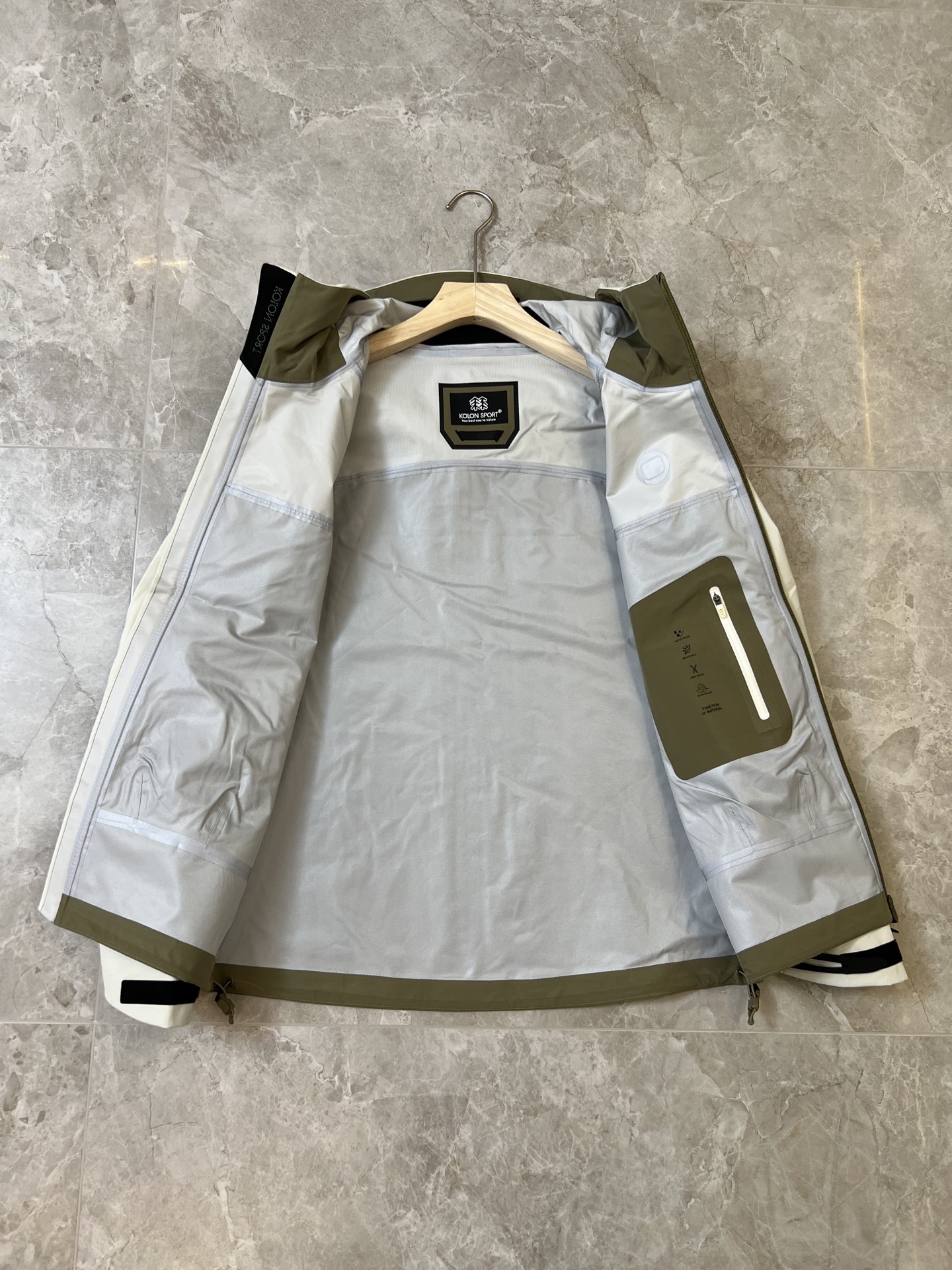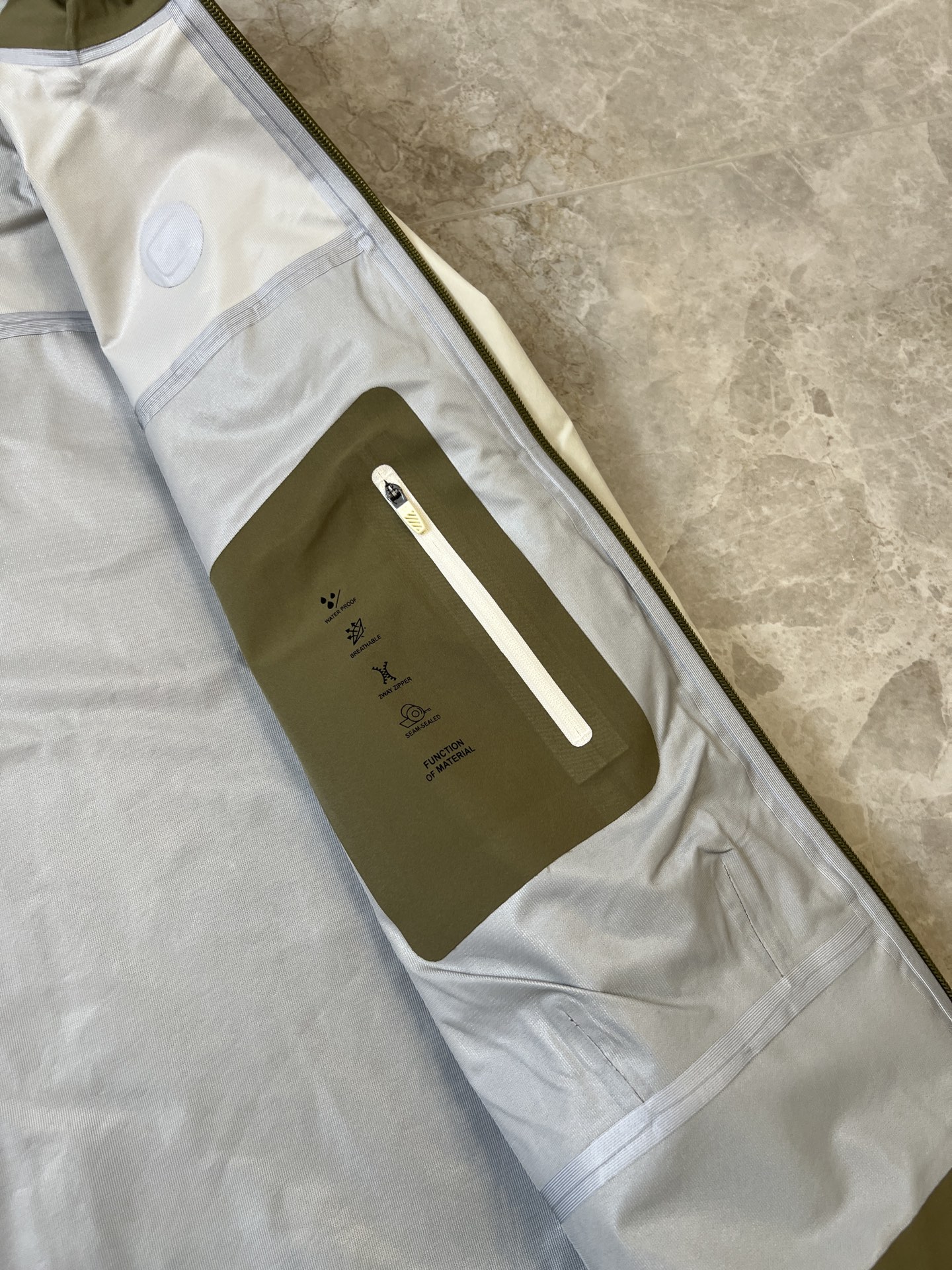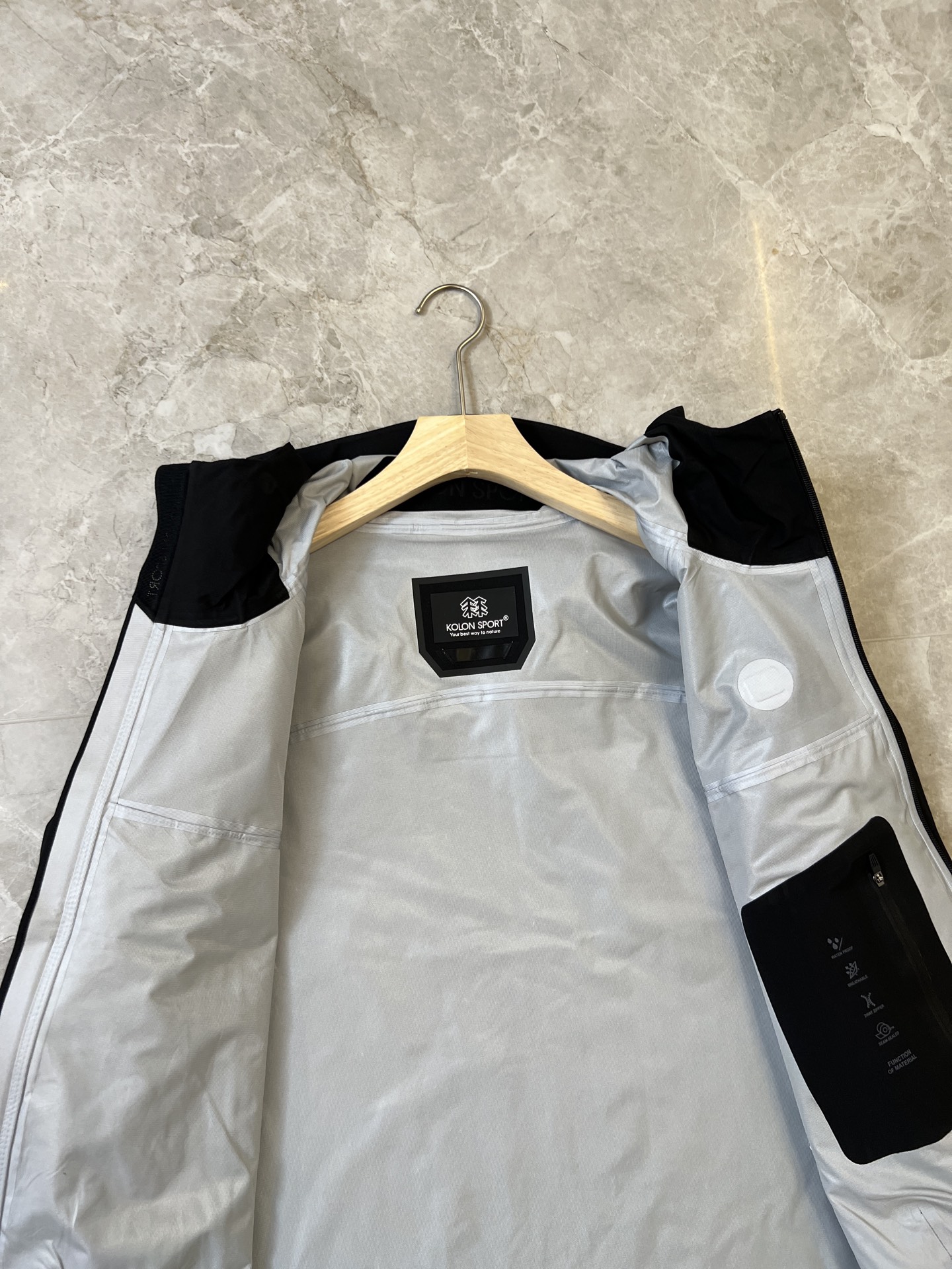 大身采用70D锦纶的GORE-TEX 3L Tricot面料,具备防水、透湿、防风及耐磨的功能内里缝份全压胶处理,结合重点部位补强加固及全YKK轻量防水拉链,提升防水功能领口拉链上端配有护嘴,穿脱舒适安全
