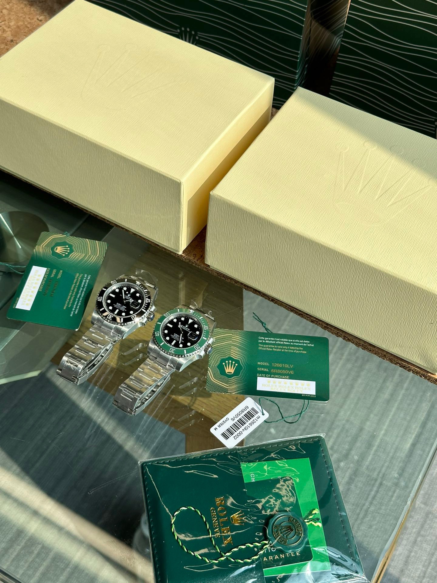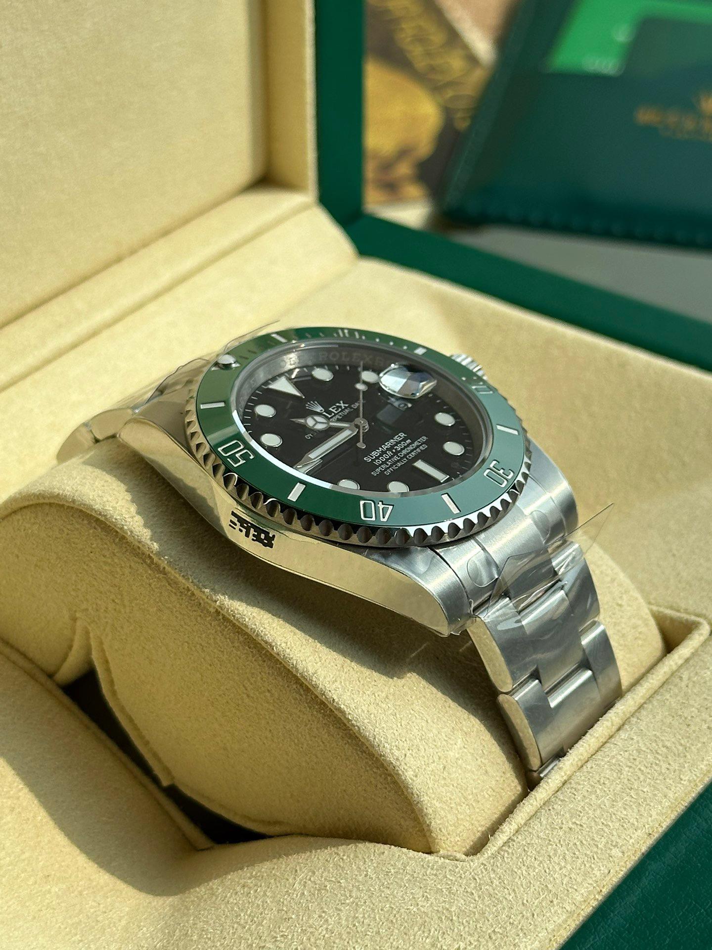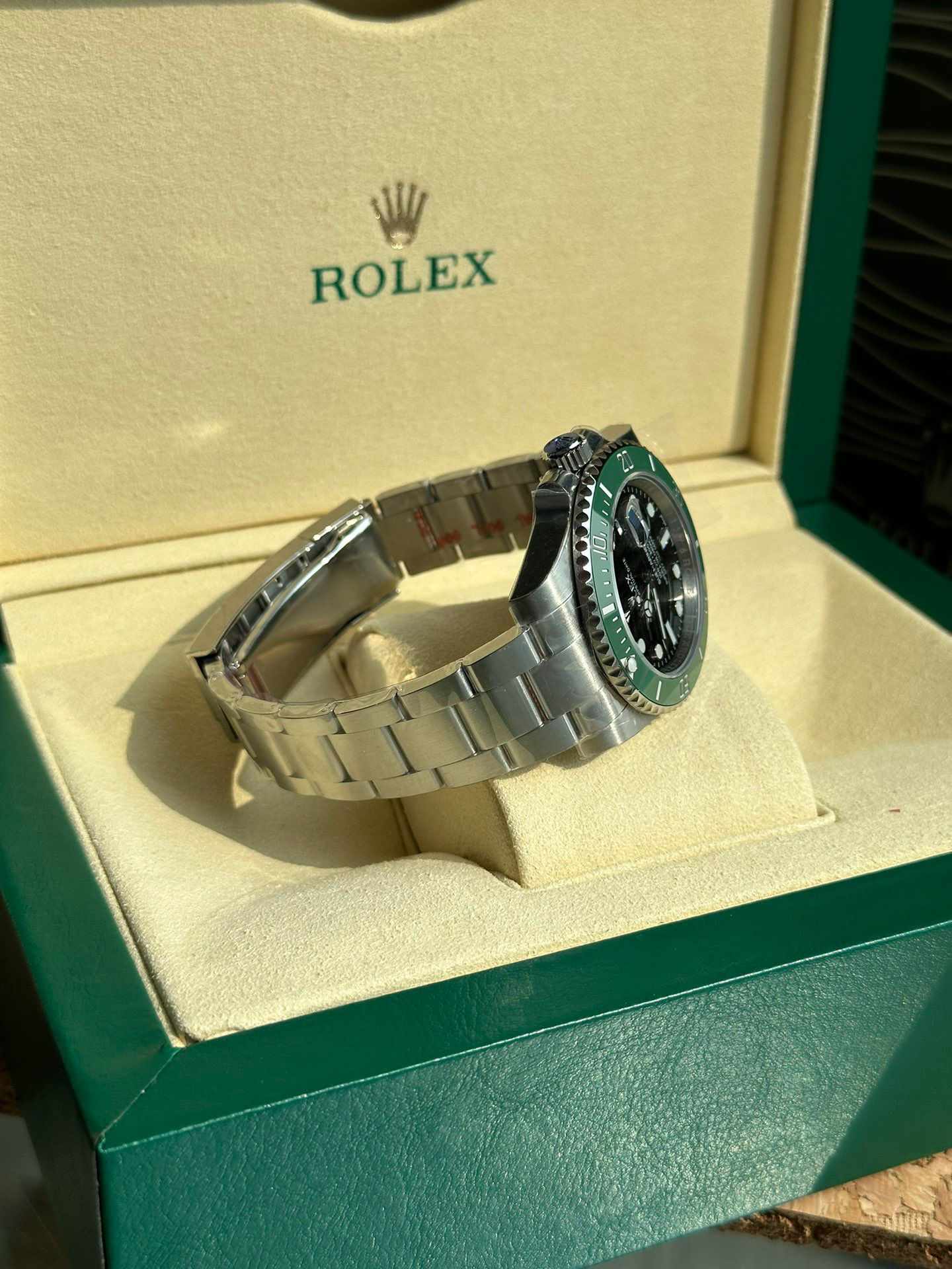 最新限量版【高版本】最新款,完美搭配。最新 劳家 水鬼 6字位自带皇冠,更加上档次,真正41mm尺寸与原装一致,4角表耳变小,表带表扣加宽!真真正正的直径41尺寸!完美版C圈绿水鬼值得拥有,店主强烈推荐款式!此批货数量有限,下单要快,动作要帅!克隆原装Cal.3235一体机芯,可逆调机芯,原版一致,圈口做到与原装百分之95以上,可以说无啥区别,拿两个原装绿鬼放在一起对比也是有色差的,另外圈口刻度不发黑,圈口上的刻度采用物理气相沉积技术,将铂金粉高温涂覆在字体上,使字体颜色耐久,遇水遇油后都不掉色不发黑!✅黑水鬼