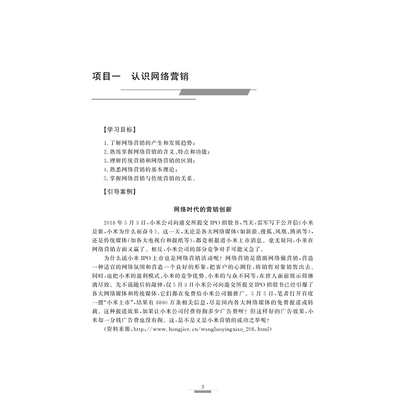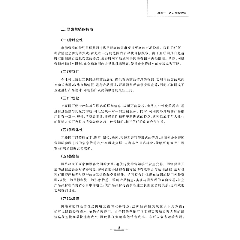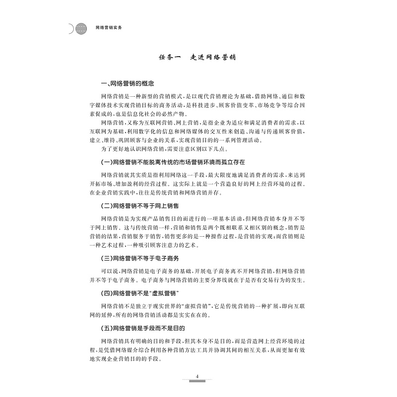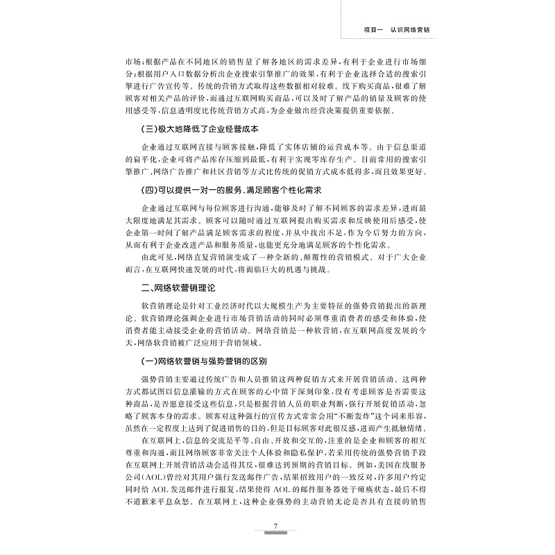 本书共分为三个篇幅、七个学习项目。第一篇:网络市场分析,包括三个项目,认识网络营销、网络营销环境分析、网络消费者分析;第二篇:网络市场选择,包括两个项目,网络市场调研和网络市场细分与定位;第三篇:网络营销策略与工具,包括两个项目,网络营销策略和网络营销工具。本书以培养网络营销应用技能与实施策略为目标,从身边的网络营销入手,结合学生特点切入网络营销基础认知,循序渐进地展现网络营销思维架构全貌,从推广工具和营销策略两个层面满足技能提升的需要,继而在技能准备的基础上提高到企业网络营销策划实施高度,并通过零售类、传统制造类、服务类等行业完成网络营销实战过程,形成面向企业的系统性网络营销管理思维。