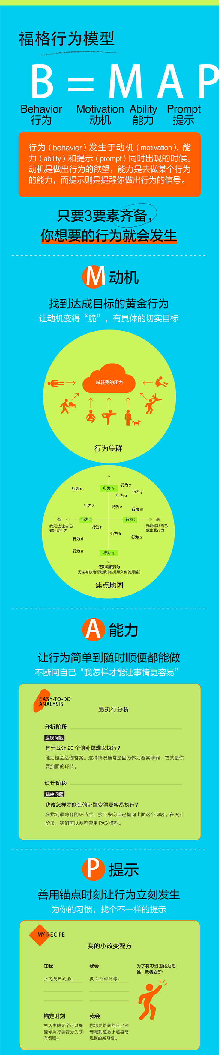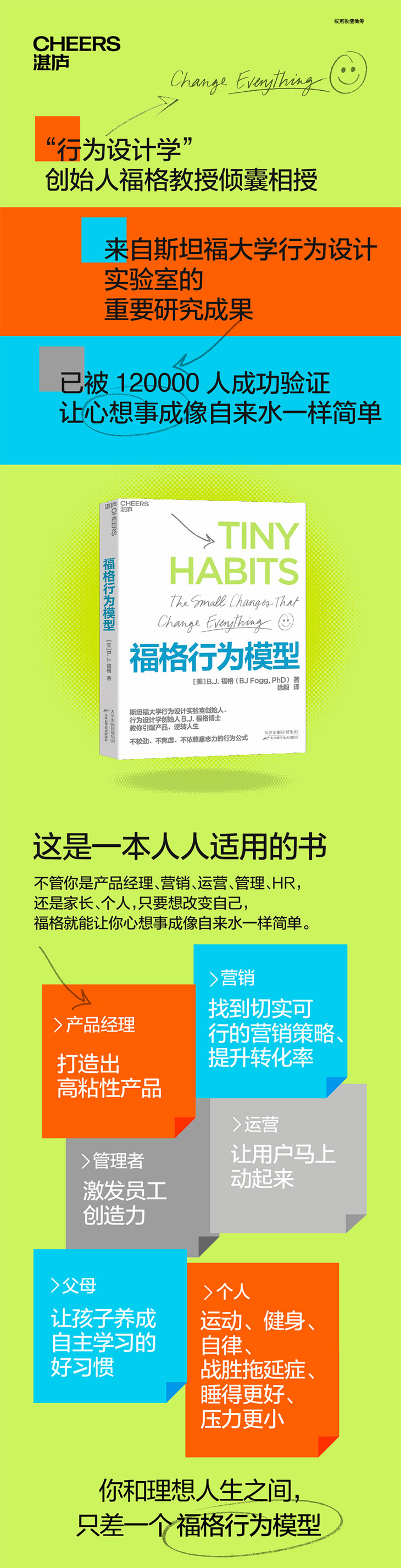 本书不仅能够帮助人们毫不费力地养成好习惯,也能够指导人们成功对抗坏习惯;不仅能够帮助个人实现改变,也能够帮助群体直面挑战。只要掌握福格行为模型的精髓并加以灵活运用,每个人都能够轻松改变自己的工作与生活,成为自己想要成为的那个人。