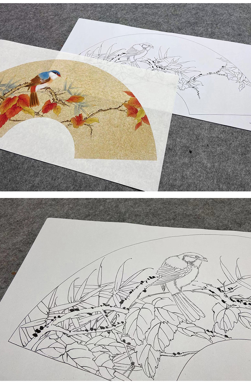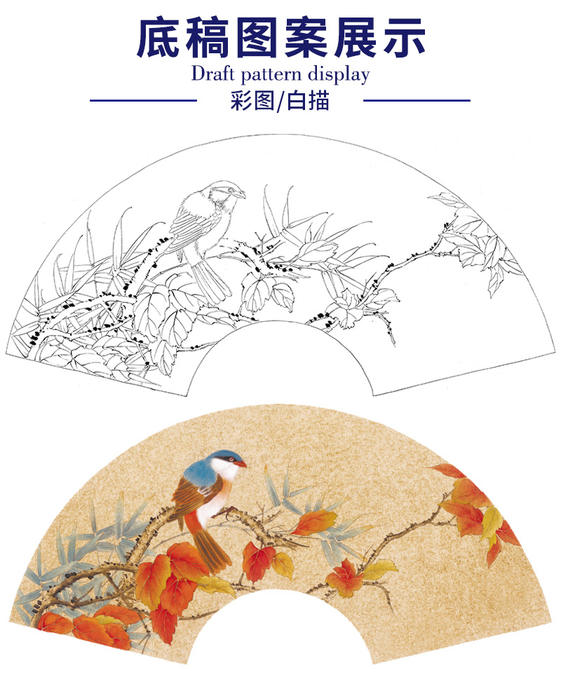 【大彩图】张建军工笔画白描底稿扇面小品红叶临摹勾线花鸟线稿A345