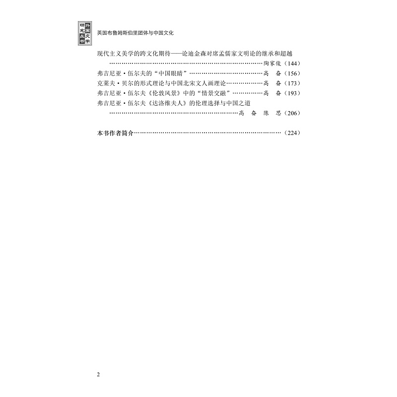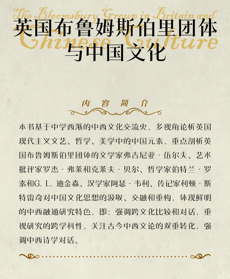 本书基于中学西渐的中西文化交流史,多视角论析英国现代主义文艺、哲学、美学中的中国元素,重点剖析英国布鲁姆斯伯里团体的文学家弗吉尼亚·伍尔夫、艺术批评家罗杰·弗莱和克莱夫·贝尔、哲学家伯特兰·罗素和G. L. 迪金森、汉学家阿瑟·韦利、传记家利顿·斯特雷奇对中国文化思想的汲取、交融和重构,体现鲜明的中西融通研究特色,即:强调跨文化比较和对话,重视研究的跨学科性,关注古今中西文论的双重转化,强调中西诗学对话。