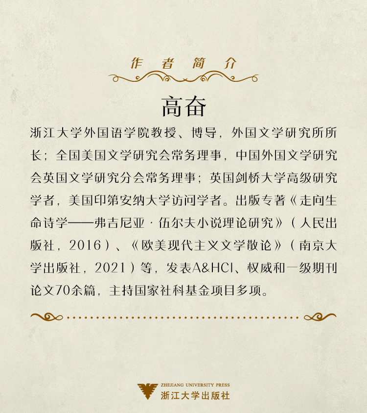 高奋 浙江大学外国语学院教授、博导,外国文学研究所所长;全国美国文学研究会常务理事,中国外国文学研究会英国文学研究分会常务理事;英国剑桥大学高级研究学者,美国印第安纳大学访问学者。出版专著《走向生命诗学——弗吉尼亚·伍尔夫小说理论研究》(人民出版社,2016)、《欧美现代主义文学散论》(南京大学出版社,2021)等,发表A&HCI、权威和一级期刊论文70余篇,主持国家社科基金项目多项。