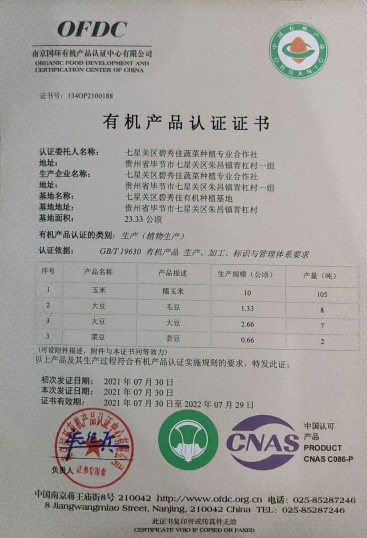 目前全年种植的4种产品——萝卜、糯玉米、黄豆、芸豆,从2020年开始,基地就获得了中国有机产品认证证书。