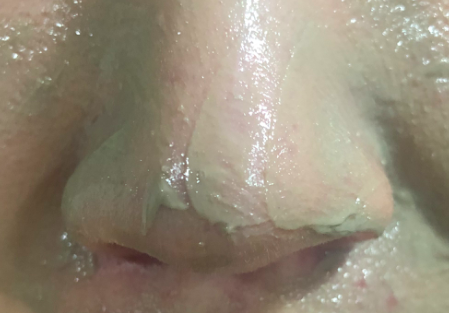 里面的灰泥质地很轻薄,敷上一点也不紧绷,从里面弄出一坨来,敷在鼻子上,会感觉里面有细微的小颗粒跟着打转,像在一点点深层吸附垃圾清清凉凉的超级镇定肌肤。