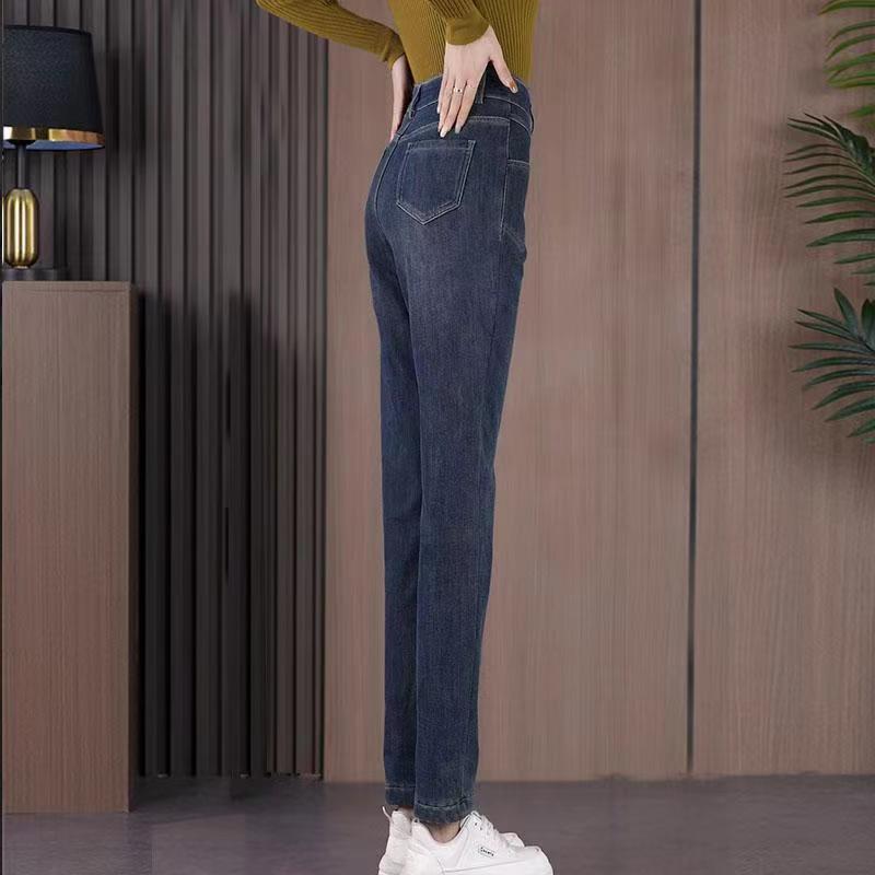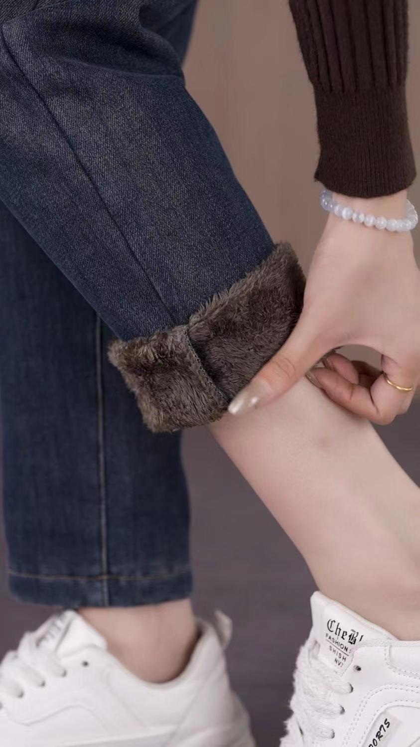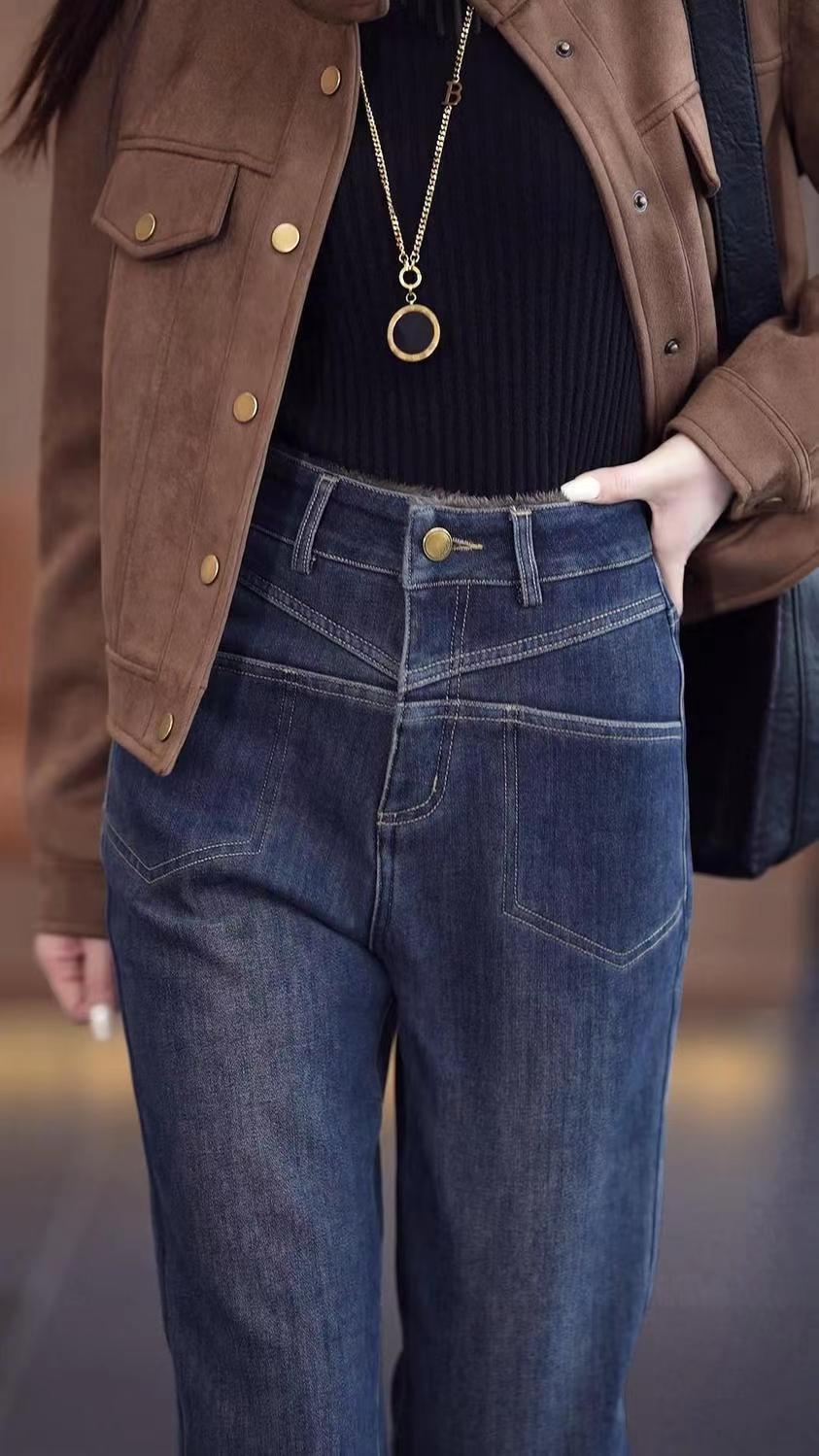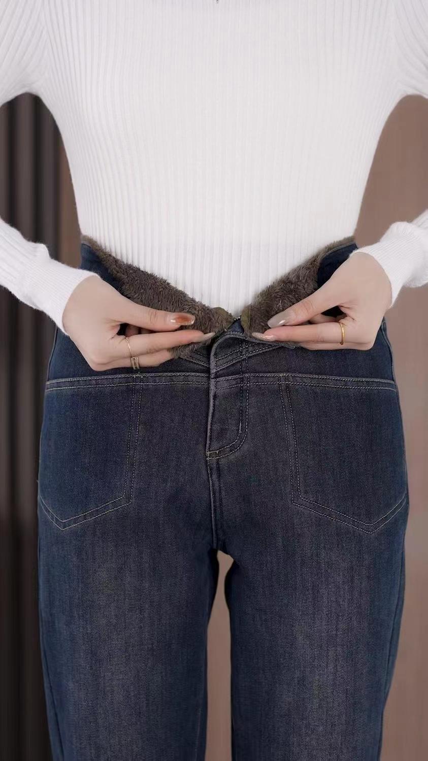 雀说加绒加厚牛仔裤女士新款小个子弹力直筒小脚烟管裤AL999
