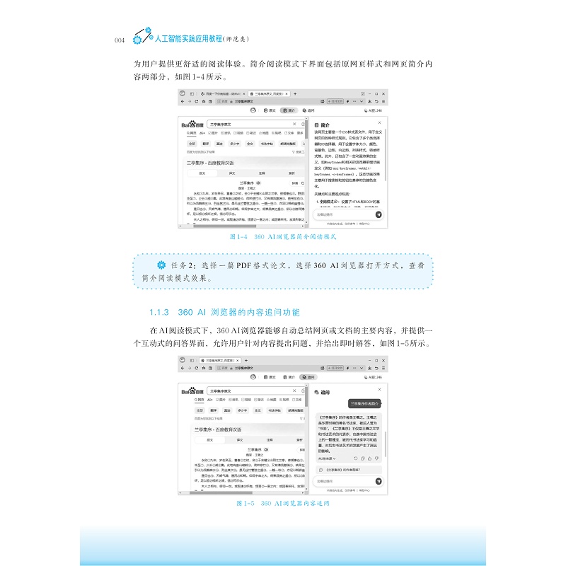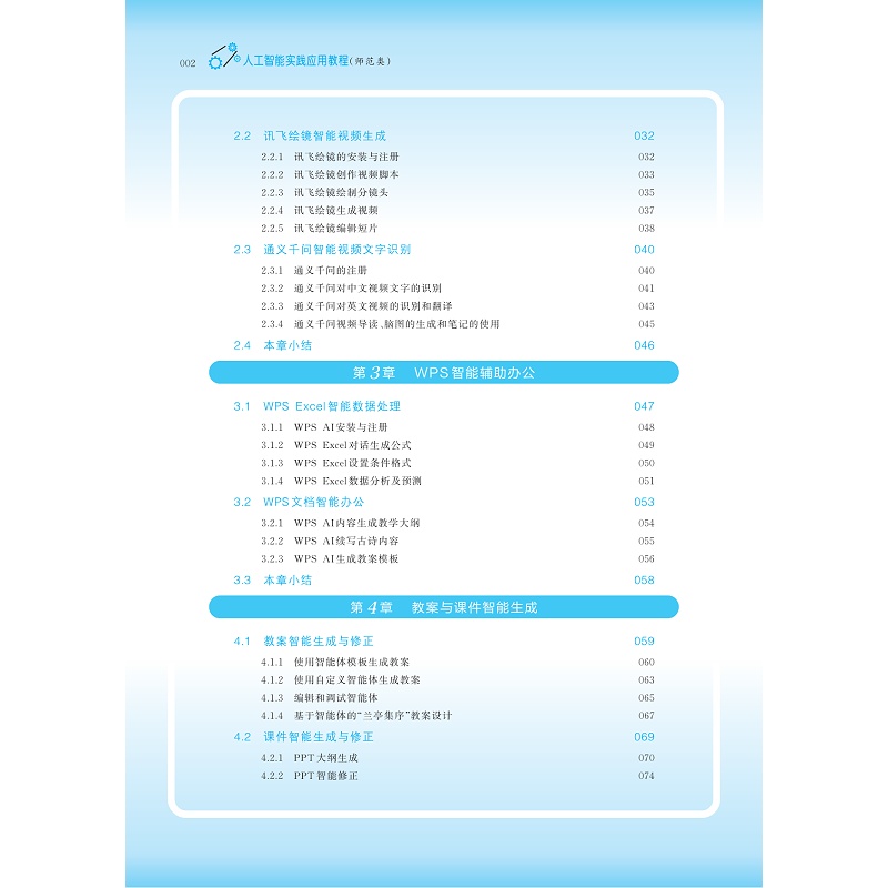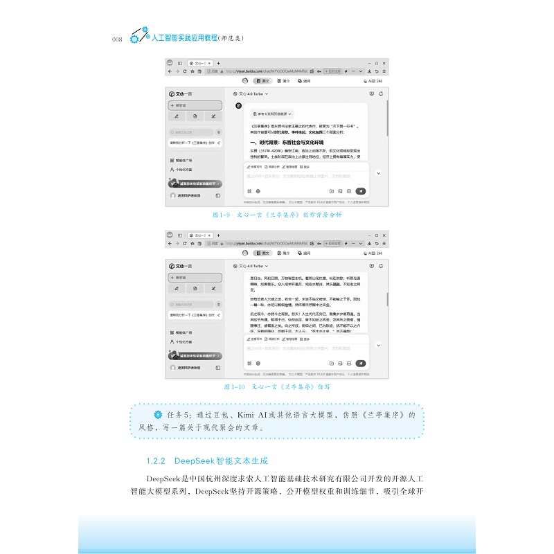 本书旨在为师范生提供一本既系统全面又易于入门的人工智能实践应用指南,帮助他们构建起对人工智能技术的正确认识,掌握其在教育领域的应用方法与策略,从而在未来的教学实践中能够灵活运用,成为引领学生探索未来世界、激发创新思维、培养核心素养的优秀教师。本书内容设计上,紧密结合教育实际,结合《兰亭集序》的教学设计,通过丰富的案例分析、项目实操,展示人工智能如何在教学资源、教学过程、教学管理、教学研究等方面的具体应用。