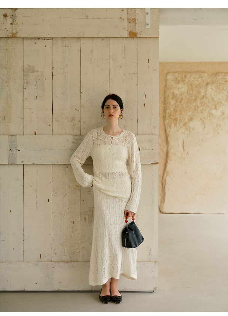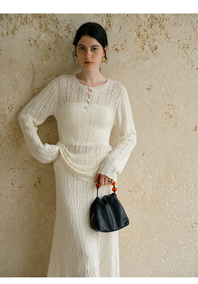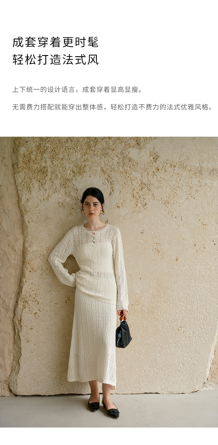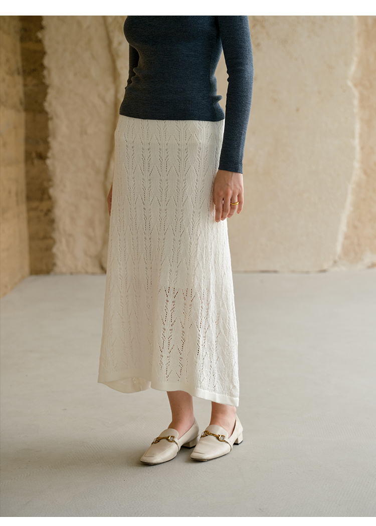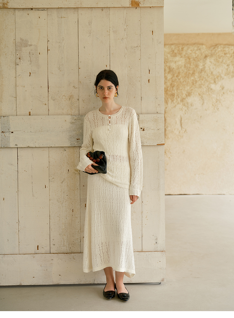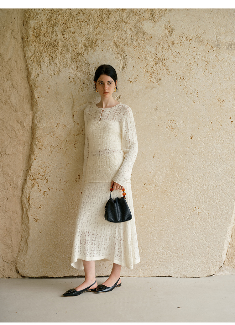 HeyDress镂空勾针圆领毛衣/钩针A摆松紧腰针织羊毛半裙