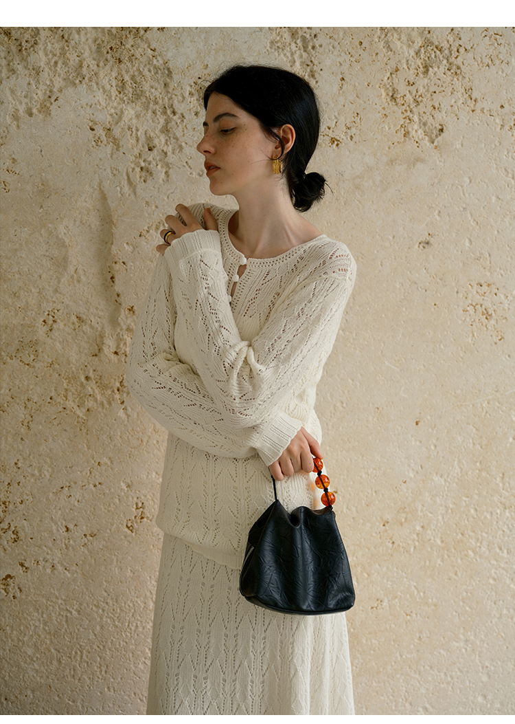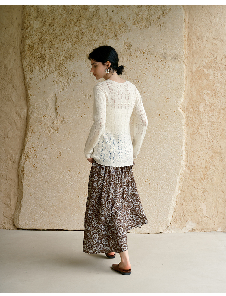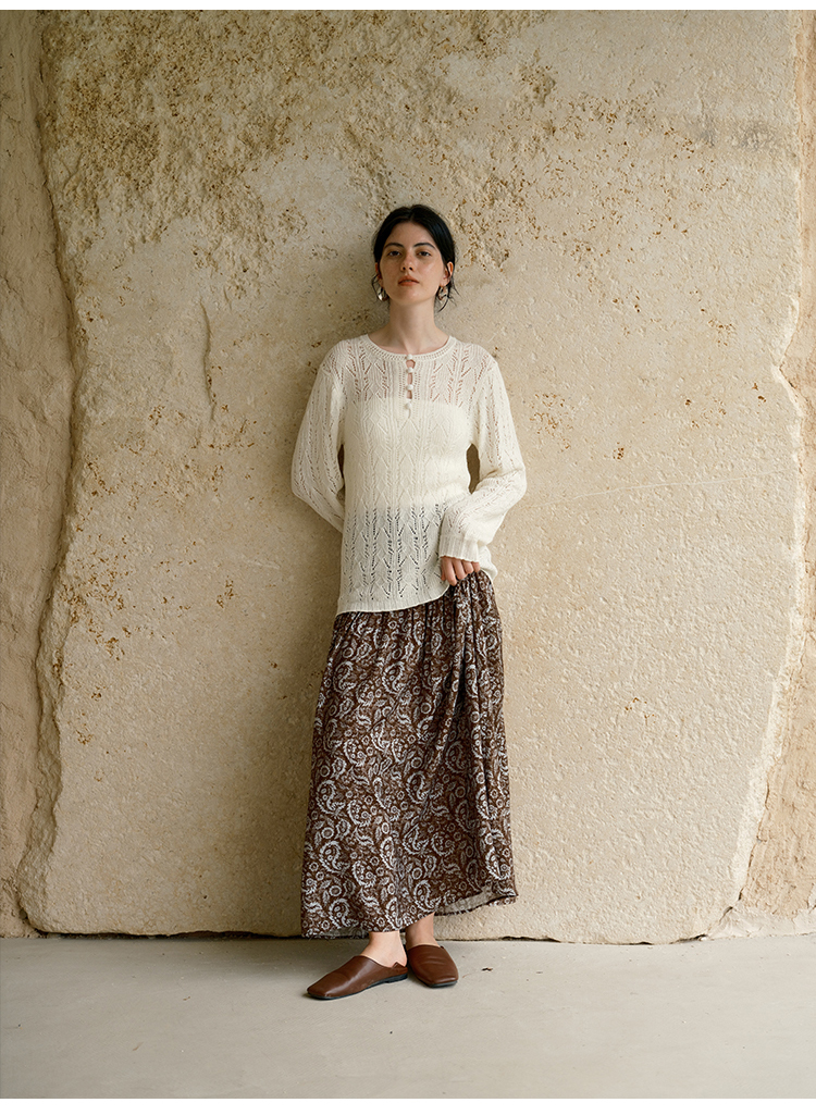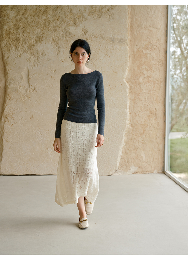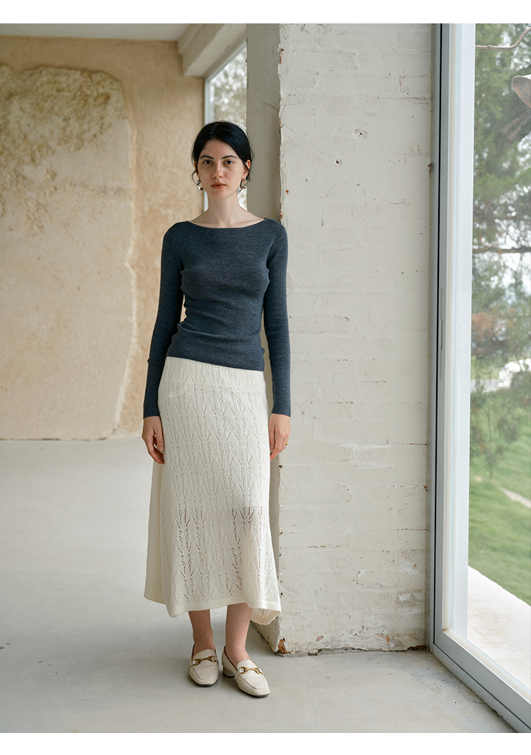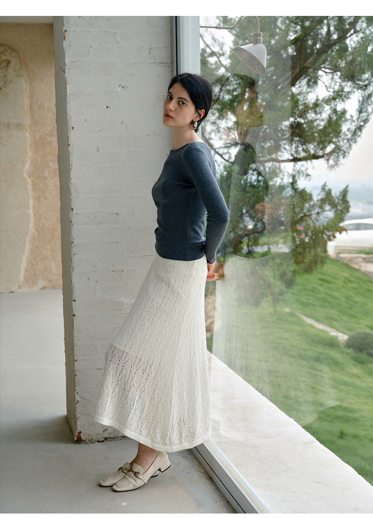 HeyDress镂空勾针圆领毛衣/钩针A摆松紧腰针织羊毛半裙