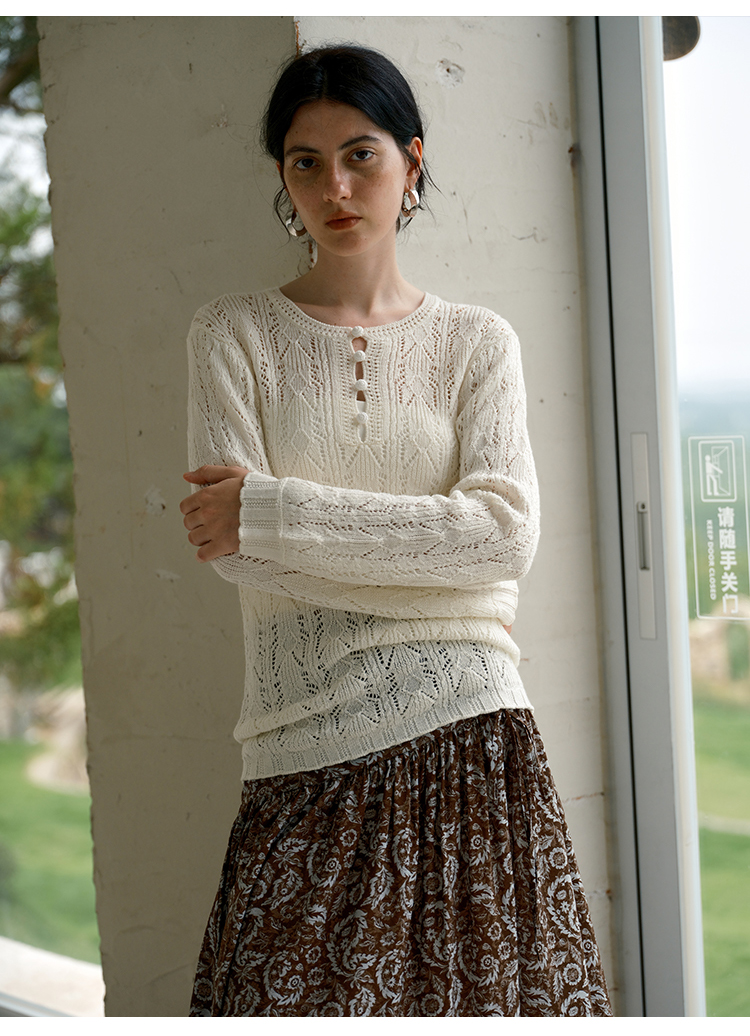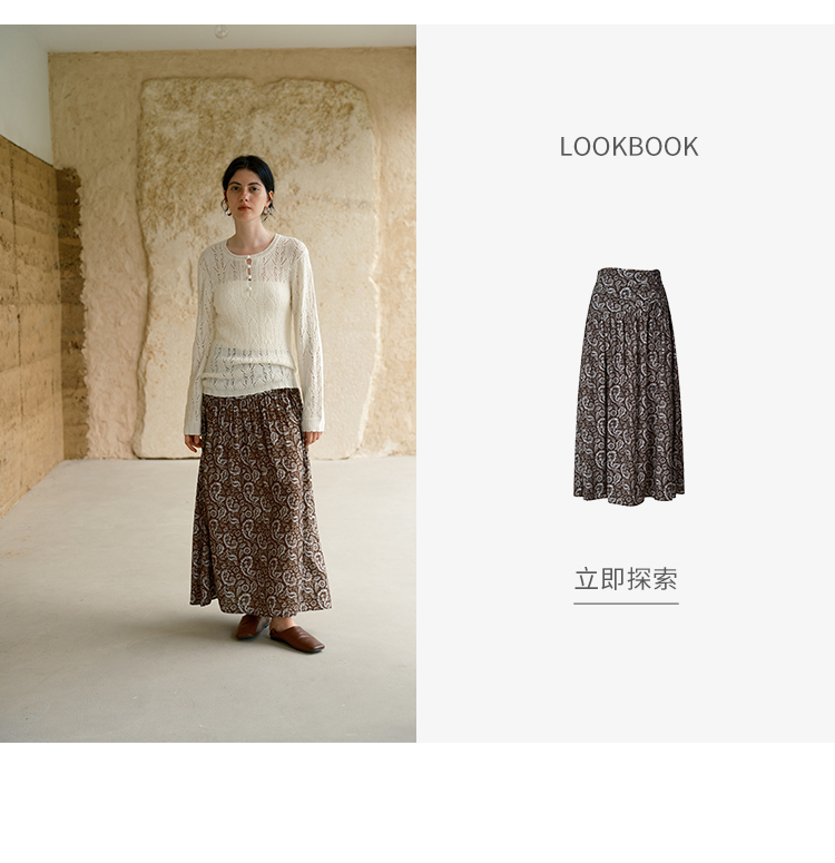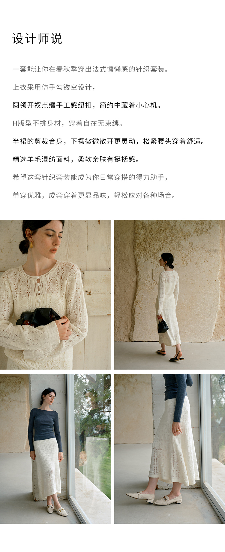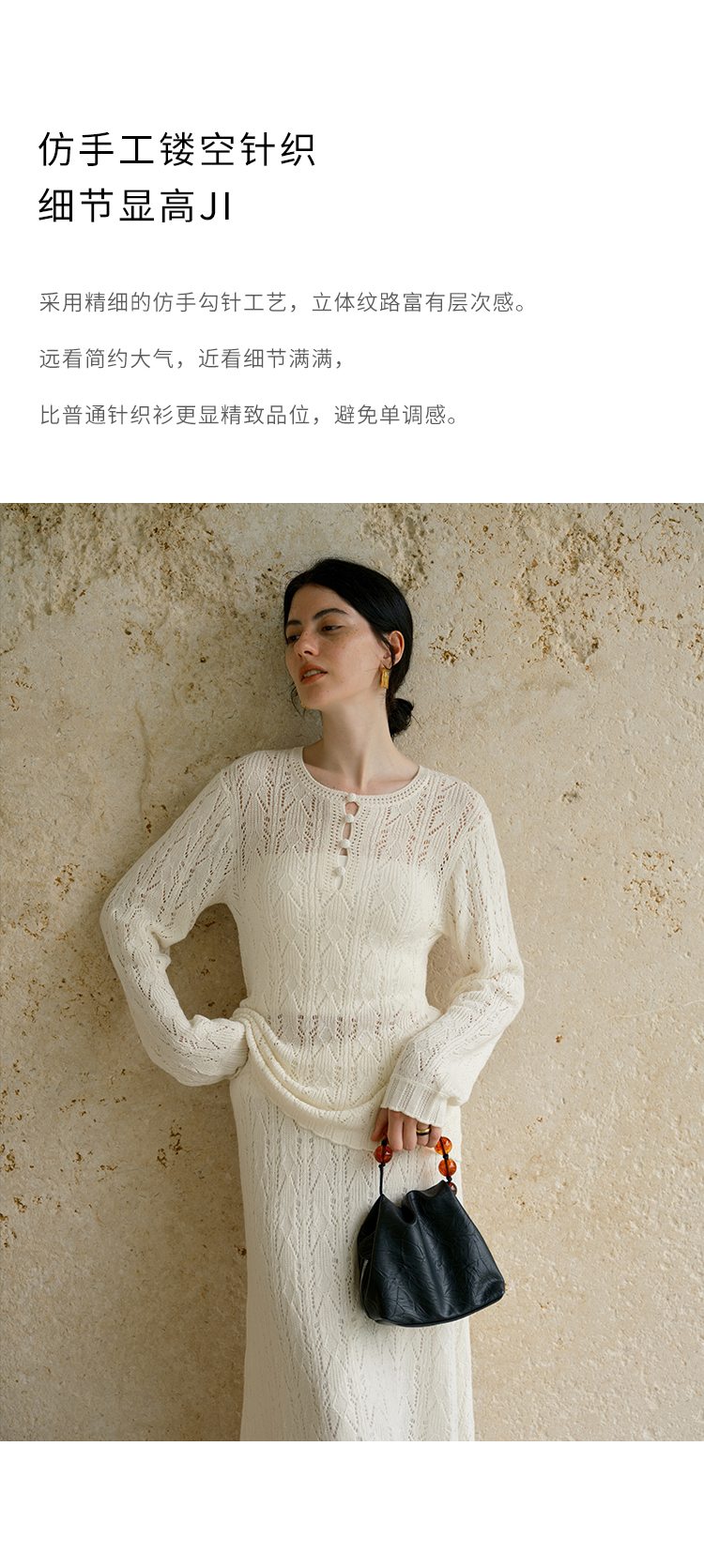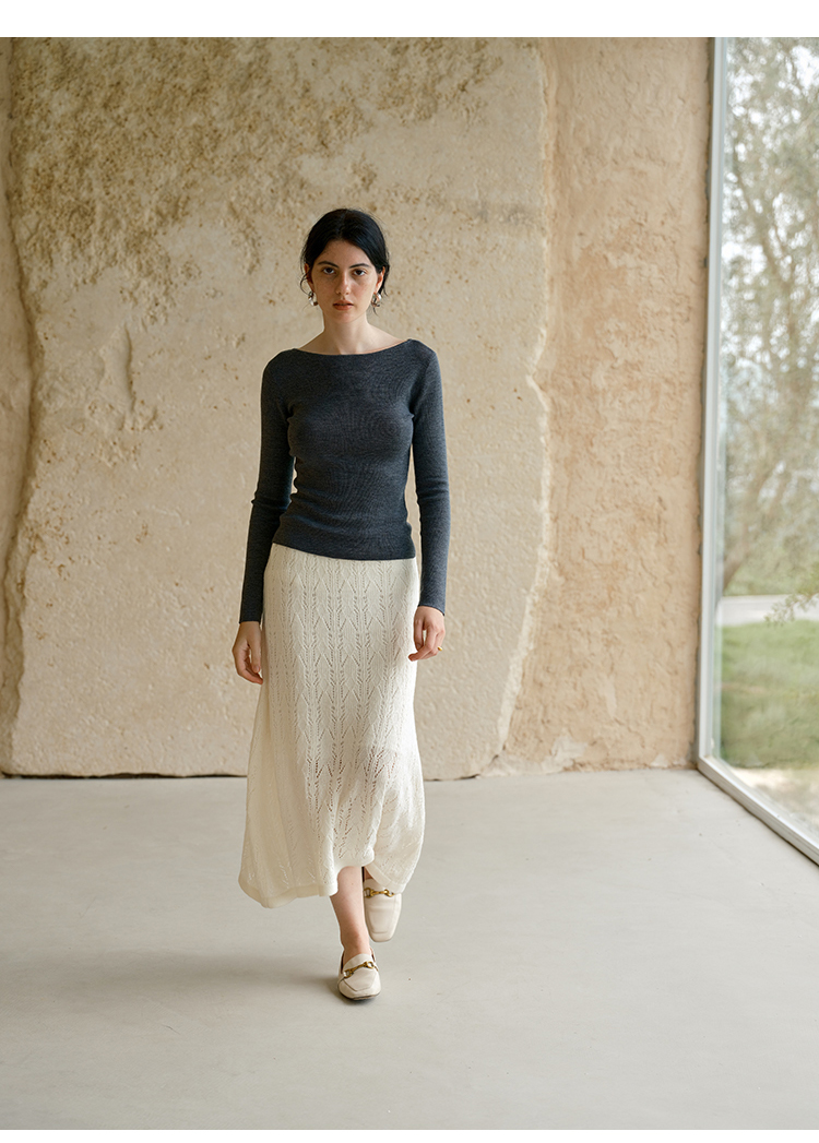 HeyDress镂空勾针圆领毛衣/钩针A摆松紧腰针织羊毛半裙
